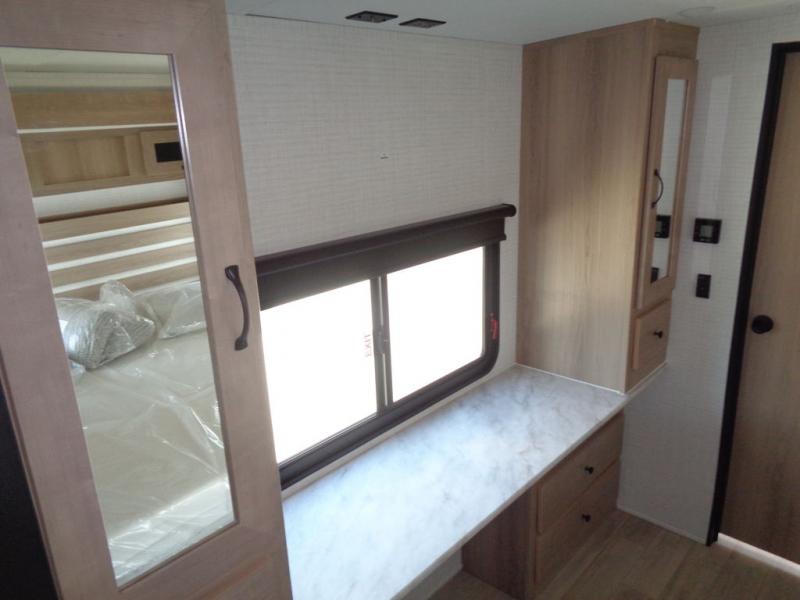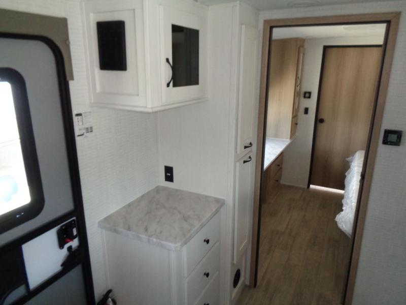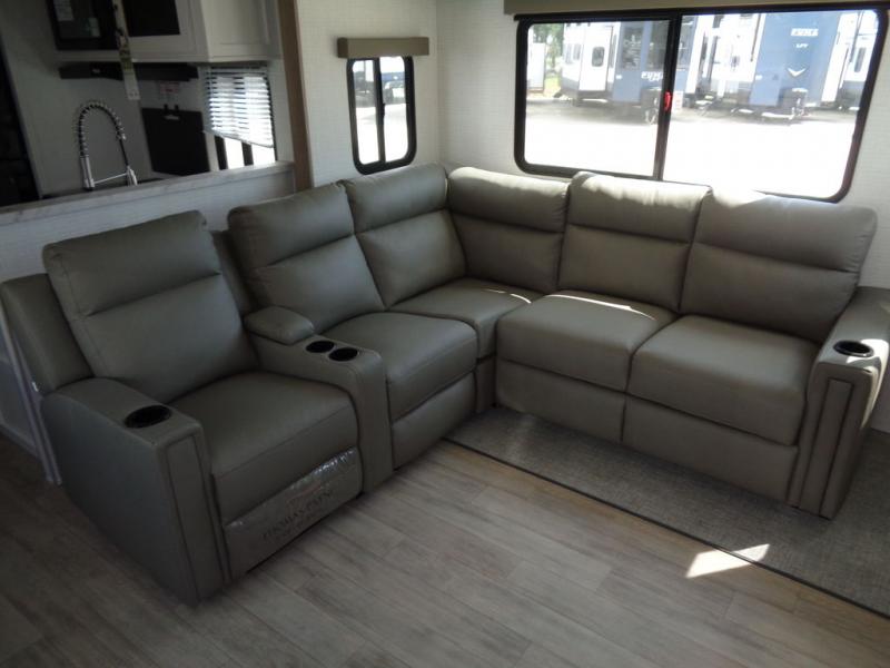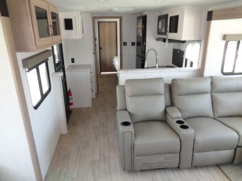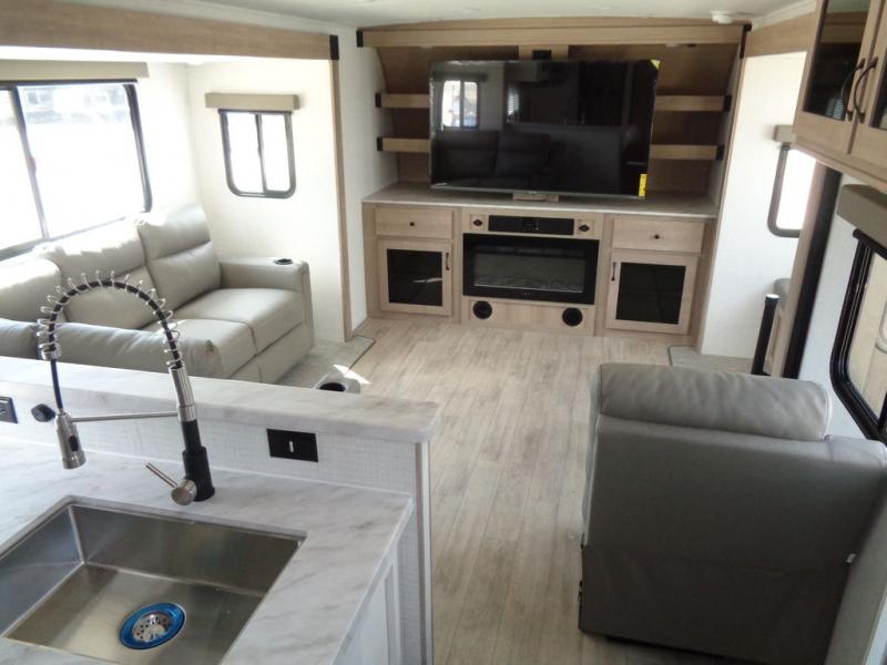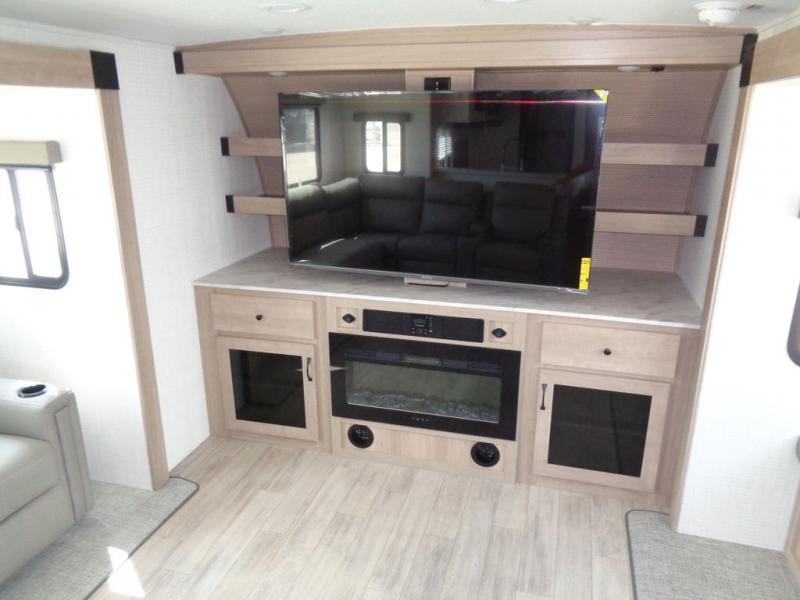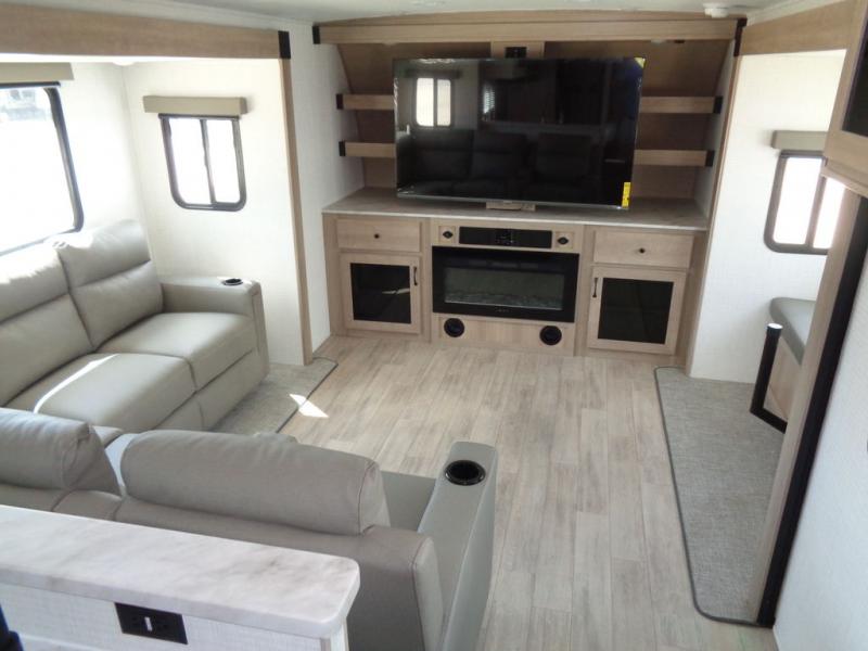 This travel trailer will feel just like home with its front living area, master bedroom, and triple slides for more space! You'll enjoy the sectional sofa and 63" dinette with two chairs on one side with a bench seat on the other. There is a front entertainment center where you can add an optional TV, and the fireplace will make it more cozy. A middle kitchen includes all the appliances to make meals each day, plus an electric refrigerator and pantry for food storage. Head towards the back to find the master bedroom with a king bed slide out, dual wardrobes, and a desk with drawers if you need to get some work done. And the full rear bath is super accommodating with its dual bath sinks plus washer and dryer prep!