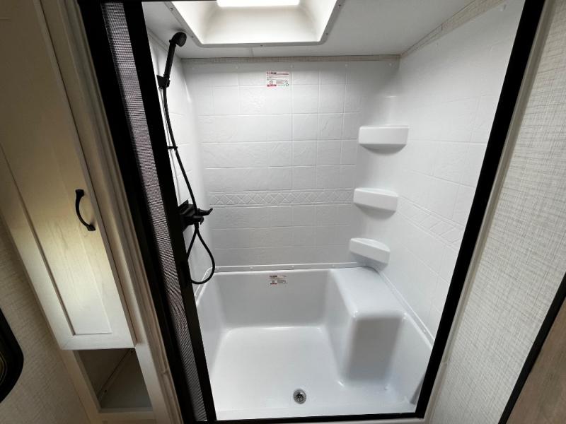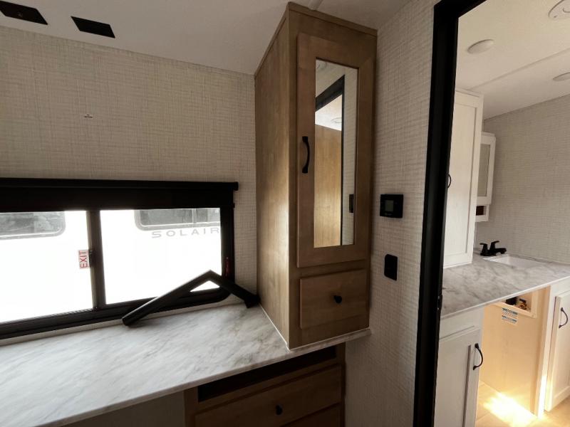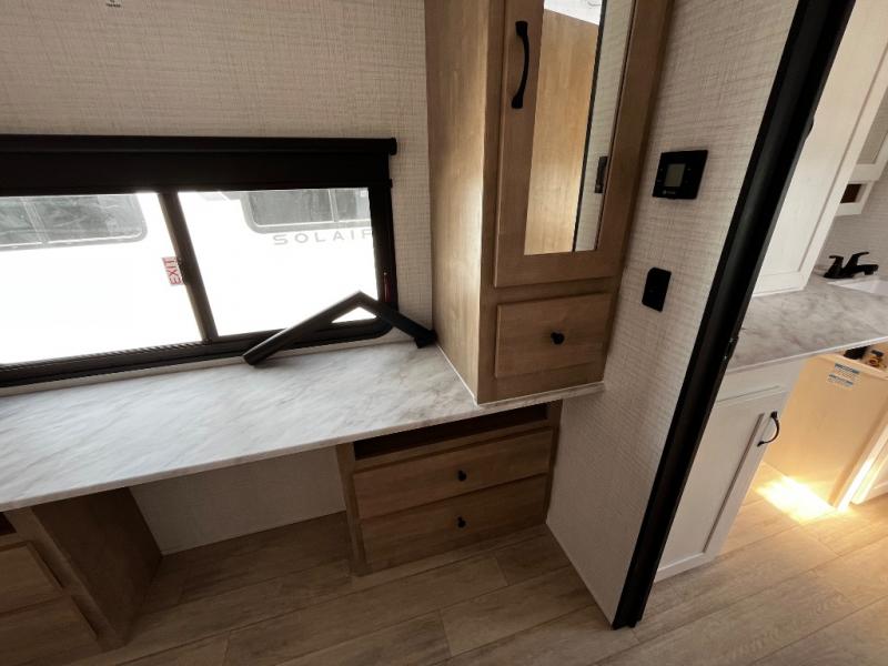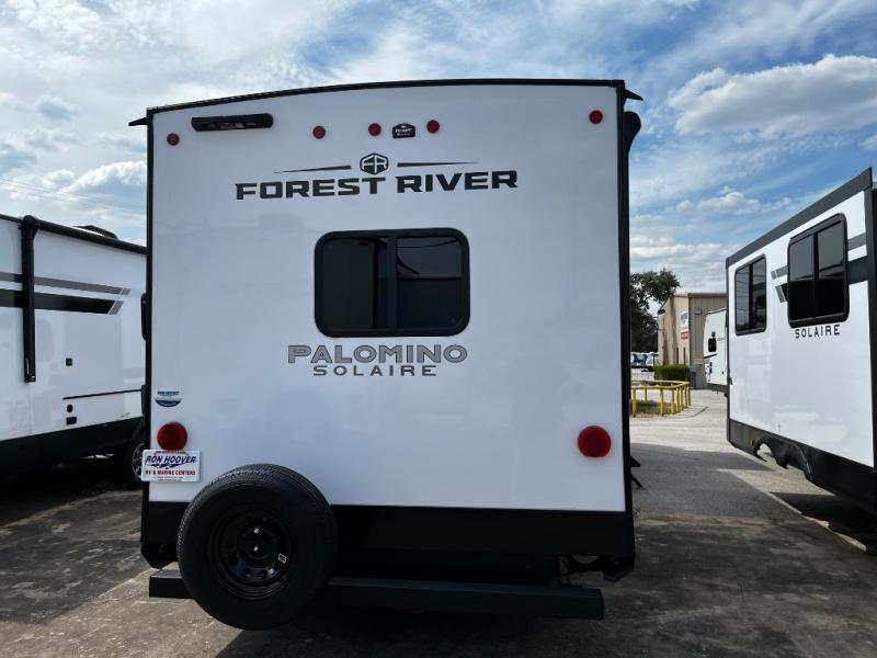 Each SolAire travel trailer by Palomino features a white gel coat exterior and an aluminum superstructure frame for lightweight towing. You will love having a power tongue jack for easy set up, plus slam latch baggage doors with magnets to make unloading easier than ever. There is also a power awning with LED lights and aluminum wheels included on the exterior. Each SolAire is constructed to last with Azdel composite, a fully laminated rear wall and roof, plus a fully enclosed and heated underbelly. The interior includes roller shades and kitchen backsplash, USB ports to keep your electronics charged, a Bluetooth stereo with speakers, and many more stand-out features!