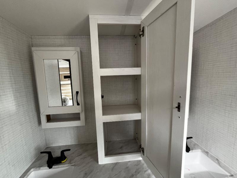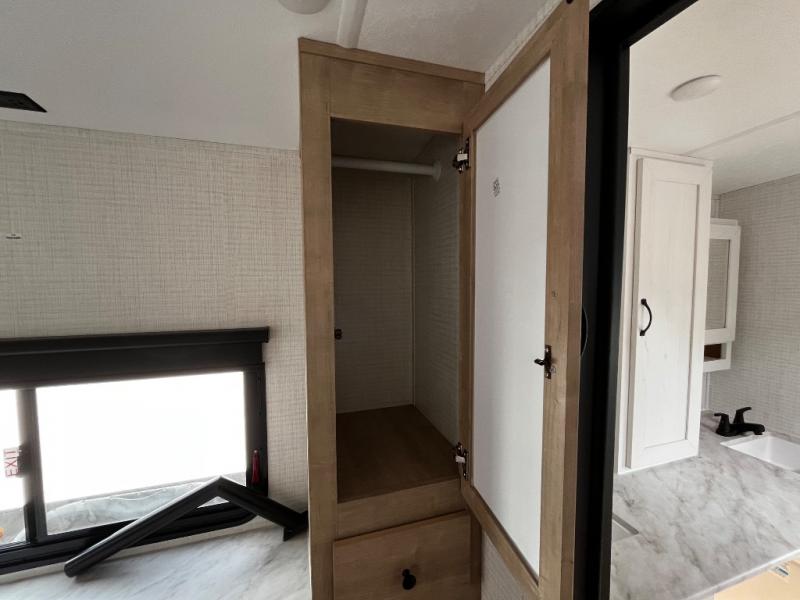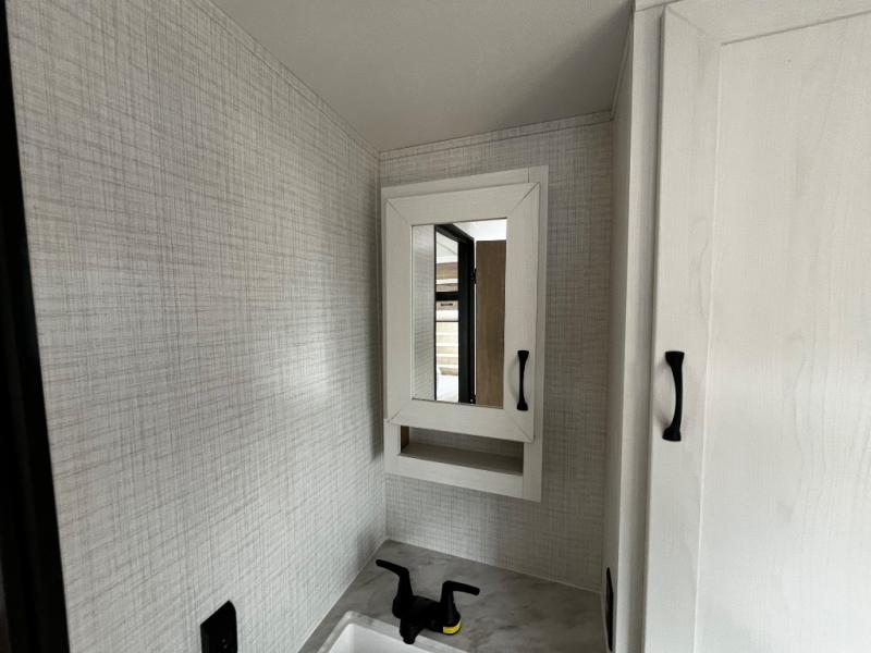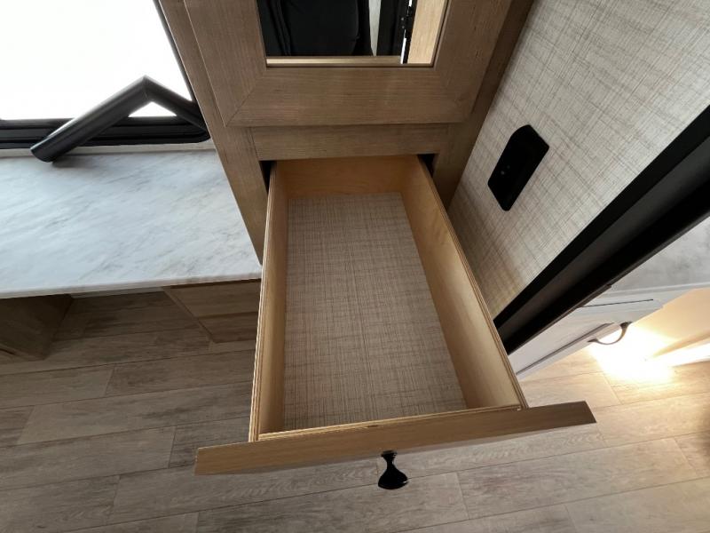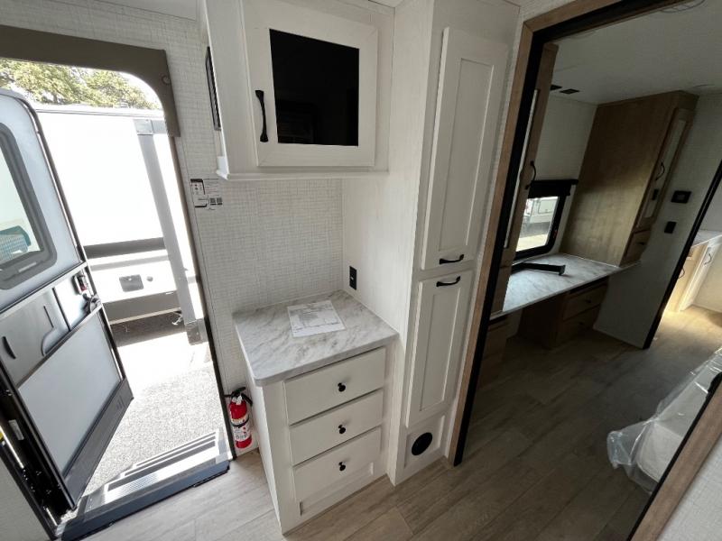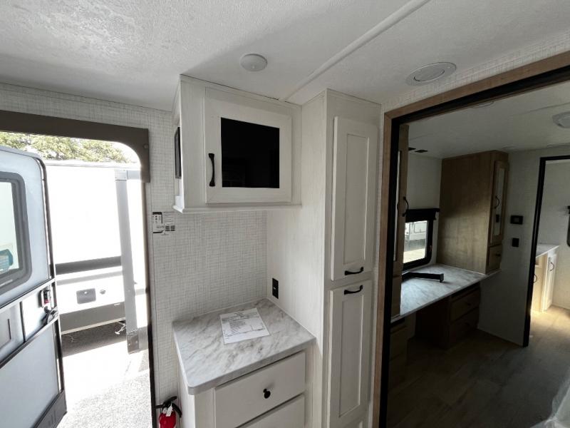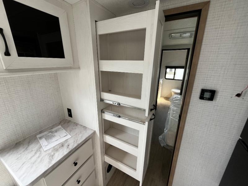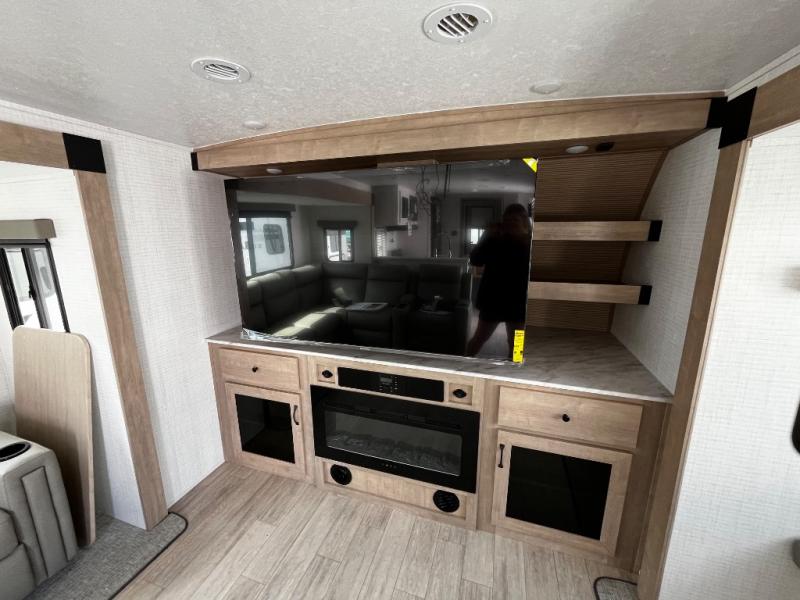 This travel trailer will feel just like home with its front living area, master bedroom, and triple slides for more space! You'll enjoy the sectional sofa and 63" dinette with two chairs on one side with a bench seat on the other. There is a front entertainment center where you can add an optional TV, and the fireplace will make it more cozy. A middle kitchen includes all the appliances to make meals each day, plus an electric refrigerator and pantry for food storage. Head towards the back to find the master bedroom with a king bed slide out, dual wardrobes, and a desk with drawers if you need to get some work done. And the full rear bath is super accommodating with its dual bath sinks plus washer and dryer prep!