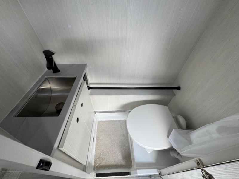 When you step inside this coach, you’re greeted by driver and passenger power swivel seats, each heated and equipped with four-way lumbar support and three-stage heating controls to ensure personalized comfort on every journey. Just to the side, a spacious closet with a hanging rod keeps your wardrobe and travel essentials neatly organized. Nearby, the private enclosed wet bath offers all the comforts of home, featuring a shower with curtain, handheld Matte Black Moen® showerhead, vanity with storage, stainless steel sink, and a towel rack for added convenience. The 3.2 cu. ft. refrigerator/freezer lets you keep your groceries fresh and drinks perfectly chilled, while across the aisle, the fully equipped galley kitchen makes it easy to prepare meals with a one-burner induction cooktop, microwave, and stainless-steel sink. Toward the rear, the living and sleeping area provides a cozy retreat with a 73" x 76" power sofa and two ottomans that easily convert into a queen-size bed, complete with memory foam cushions for ultimate relaxation after a day of adventure.