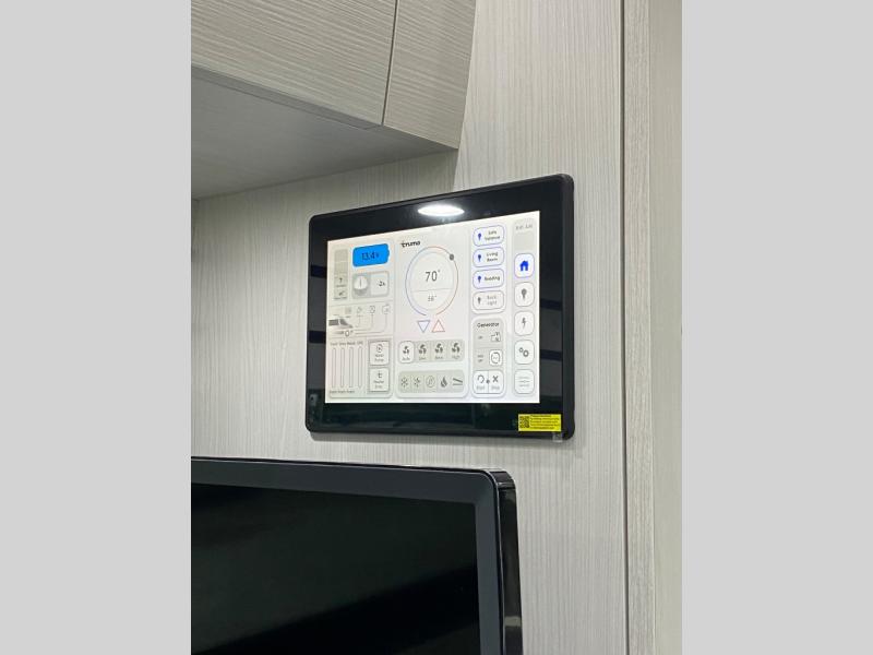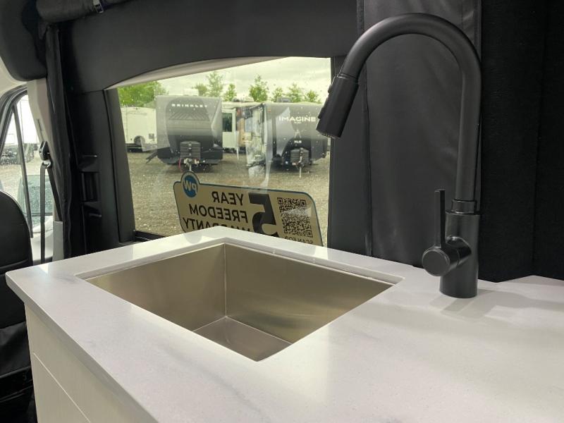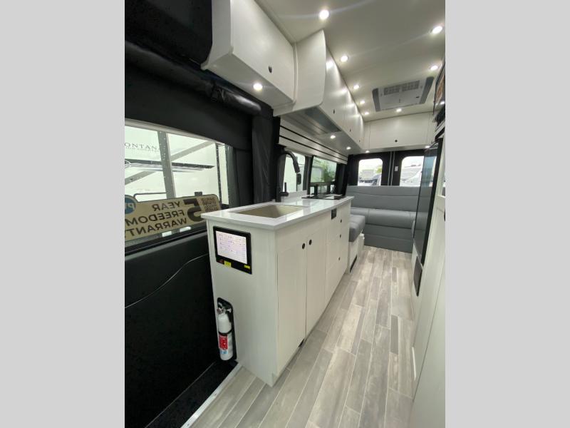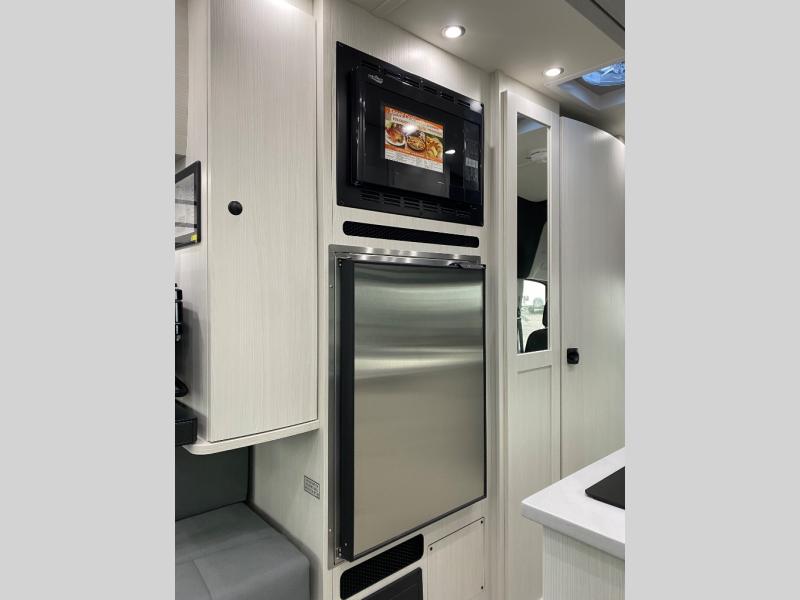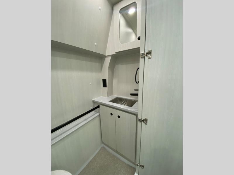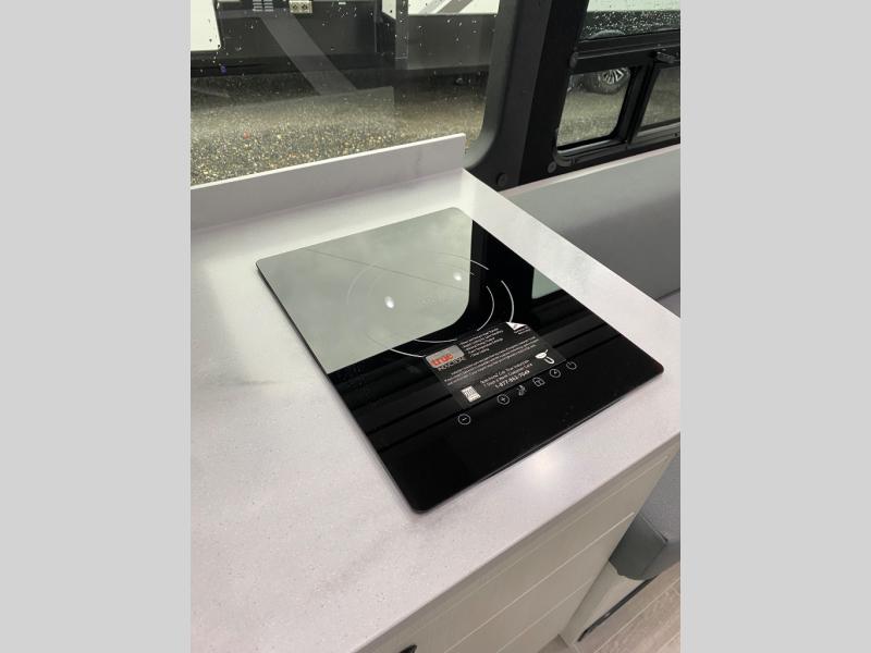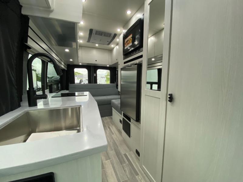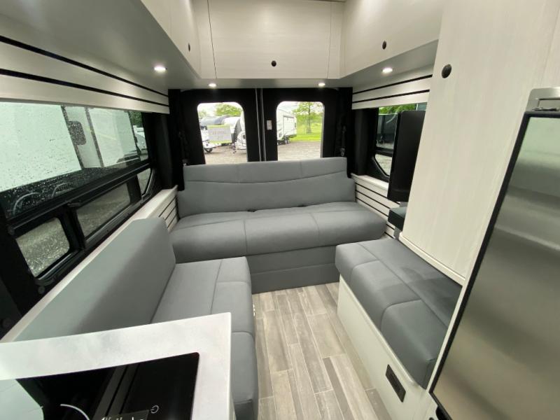 This 2.2 Ontour model is similar to model 2.0, but with a larger refrigerator, and more storage space in the bath. The rear power sofa converts to a 68" x 76" queen-sized bed with memory foam cushions for all-around comfort and the wet bath allows you to clean up each day. There is also a vanity with storage, a sink, and a Corian countertop in the bath for added convenience. Prepare meals either on the one burner induction stove top or in the microwave oven and clean up will be a breeze with a stainless steel sink that includes a high-arc faucet.