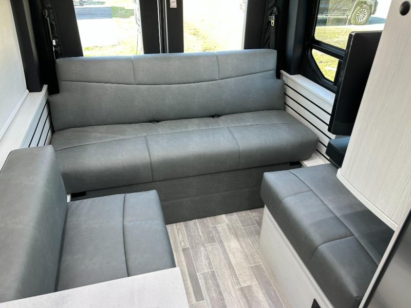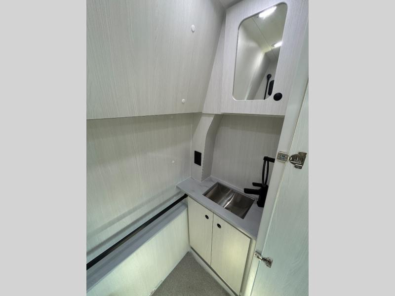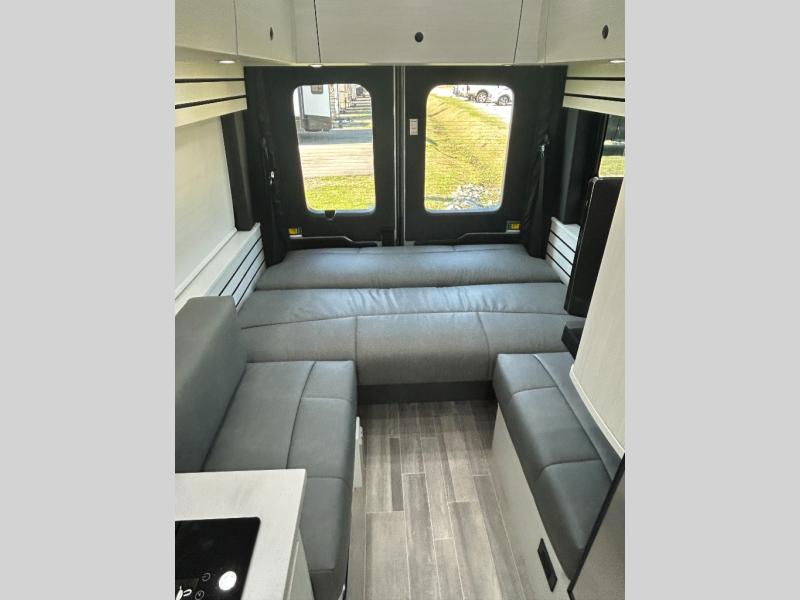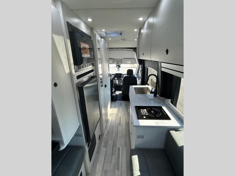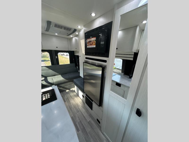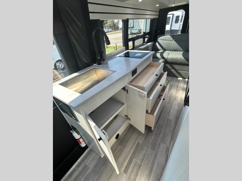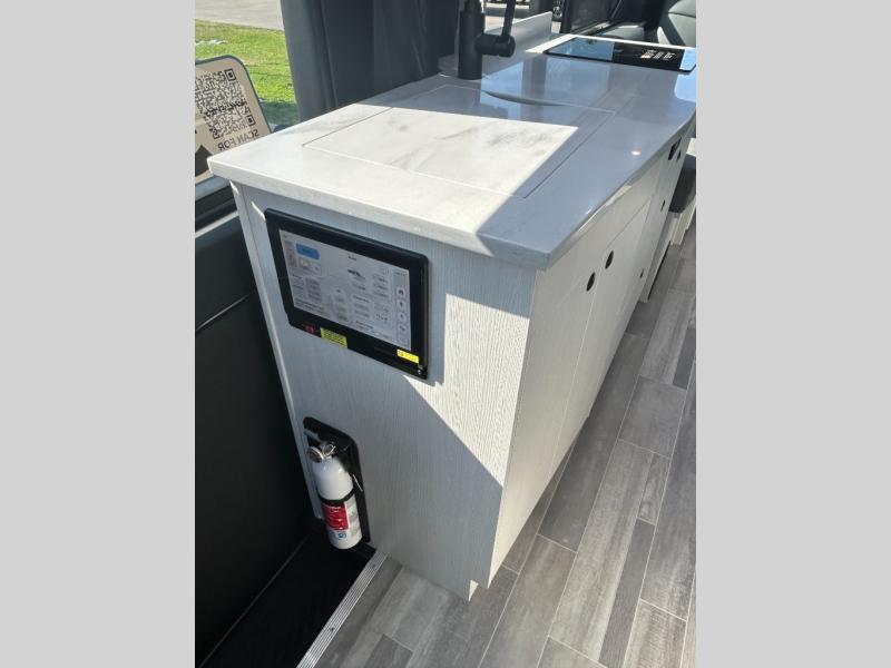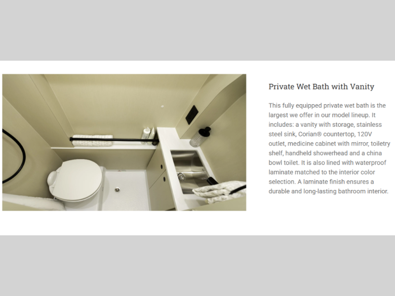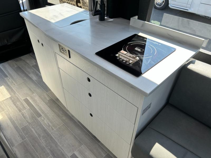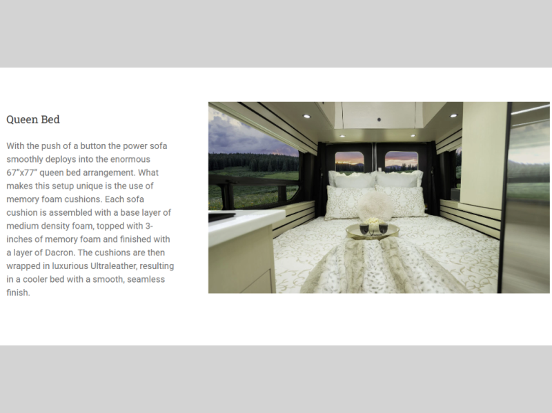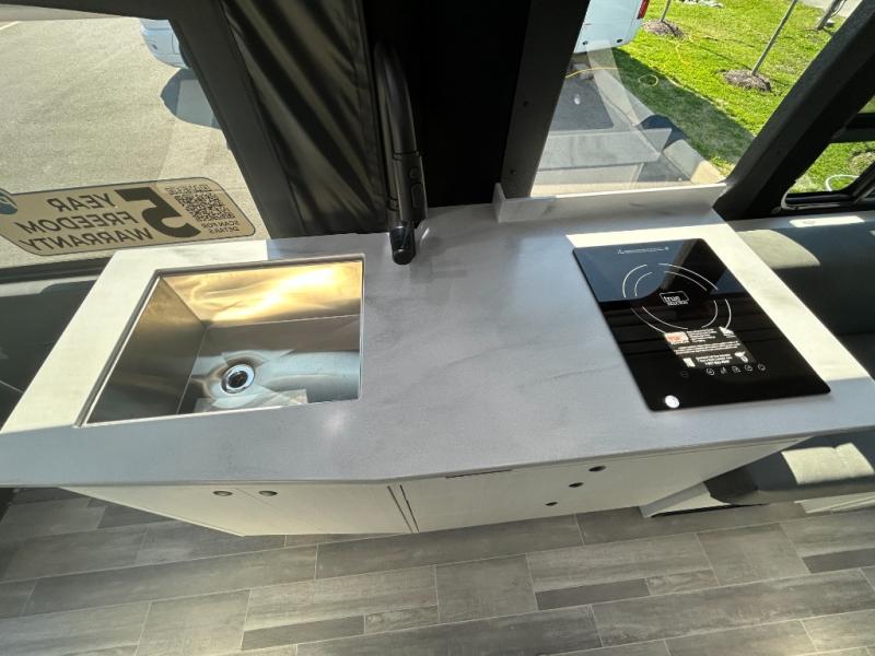 This 2.2 Ontour model is similar to model 2.0, but with a larger refrigerator, and more storage space in the bath. The rear power sofa converts to a 68" x 76" queen-sized bed with memory foam cushions for all-around comfort and the wet bath allows you to clean up each day. There is also a vanity with storage, a sink, and a Corian countertop in the bath for added convenience. Prepare meals either on the one burner induction stove top or in the microwave oven and clean-up will be a breeze with a stainless-steel sink that includes a high-arc faucet.