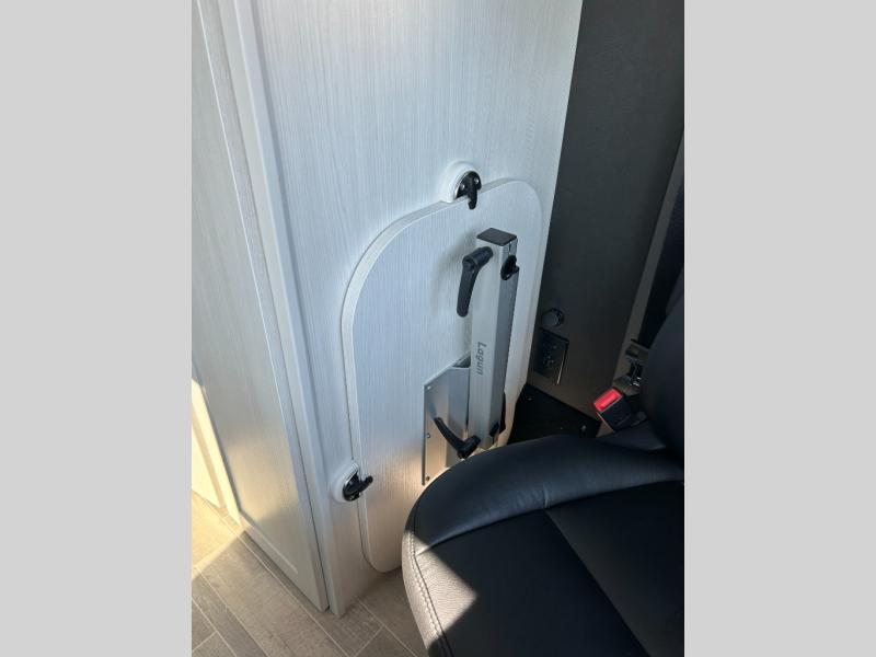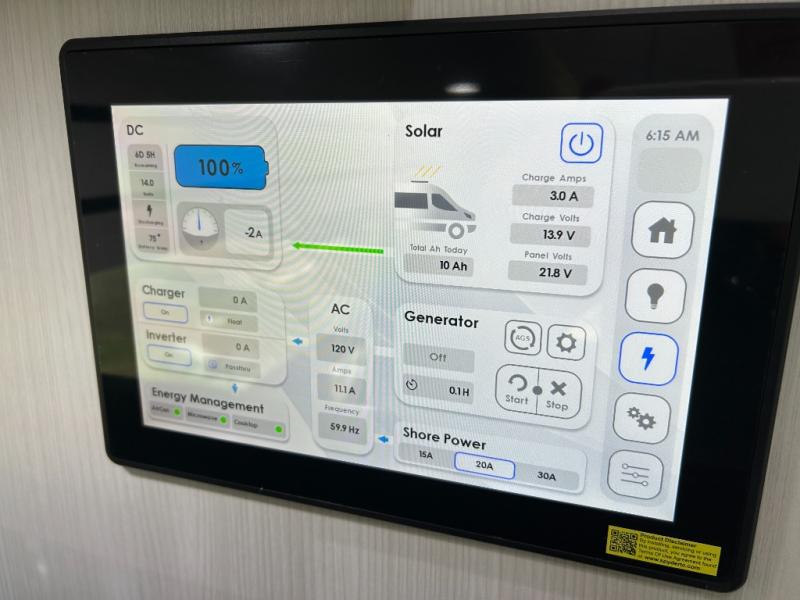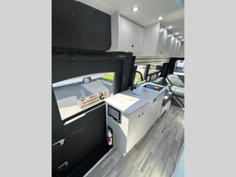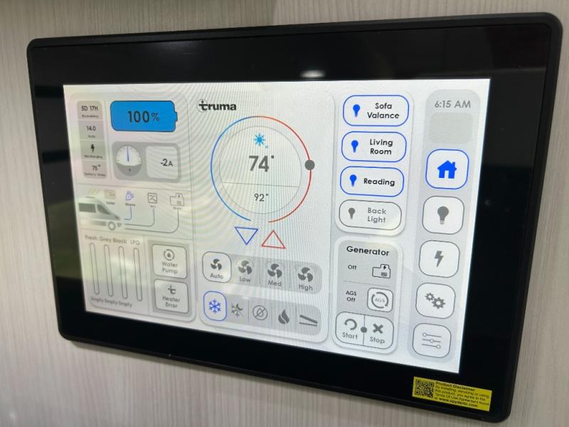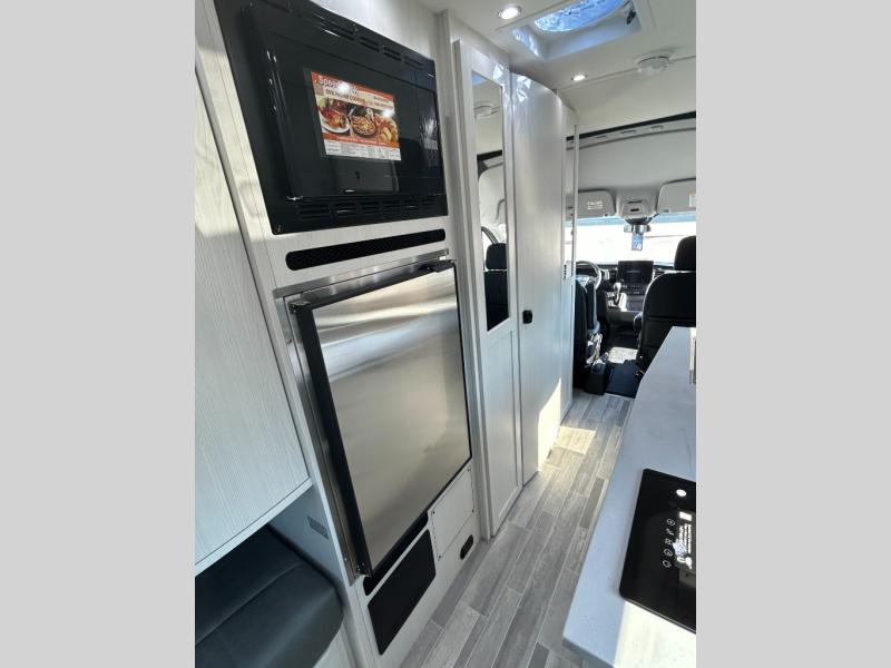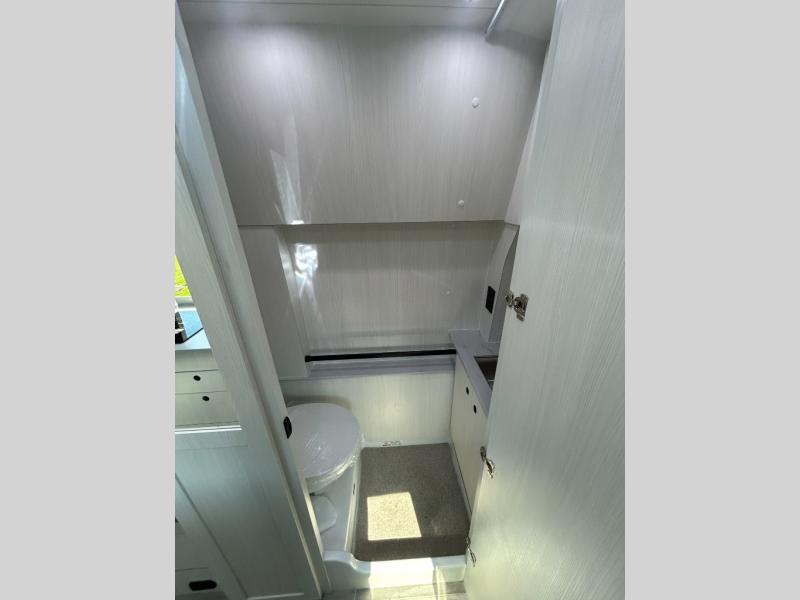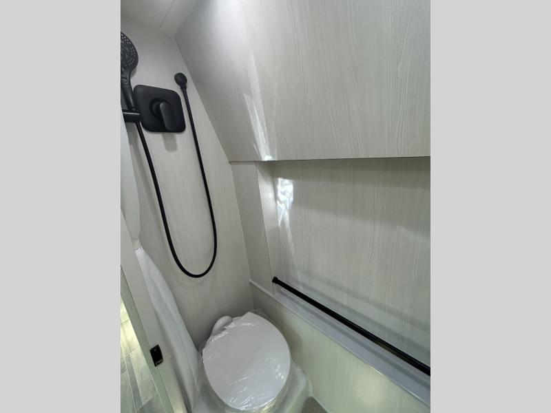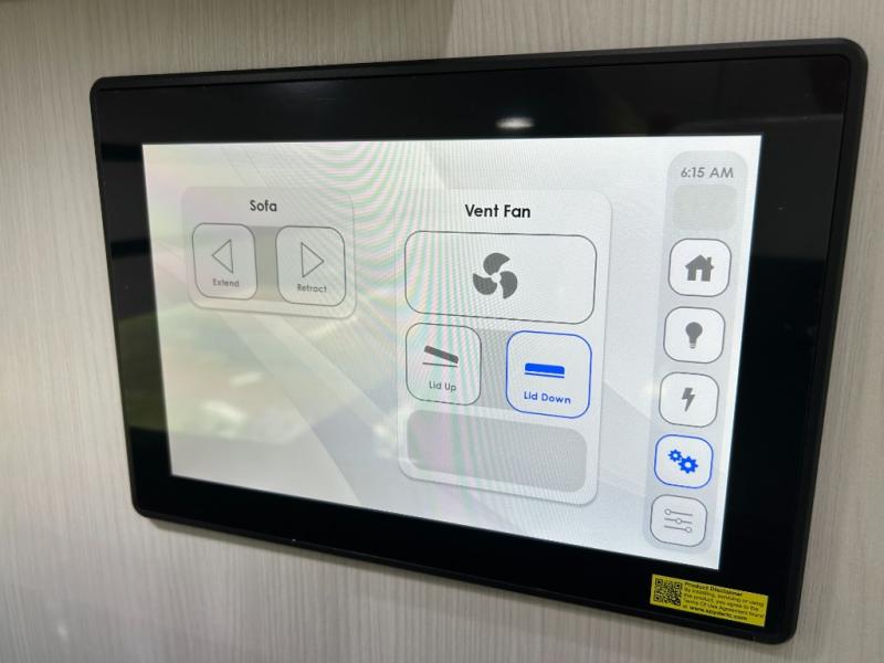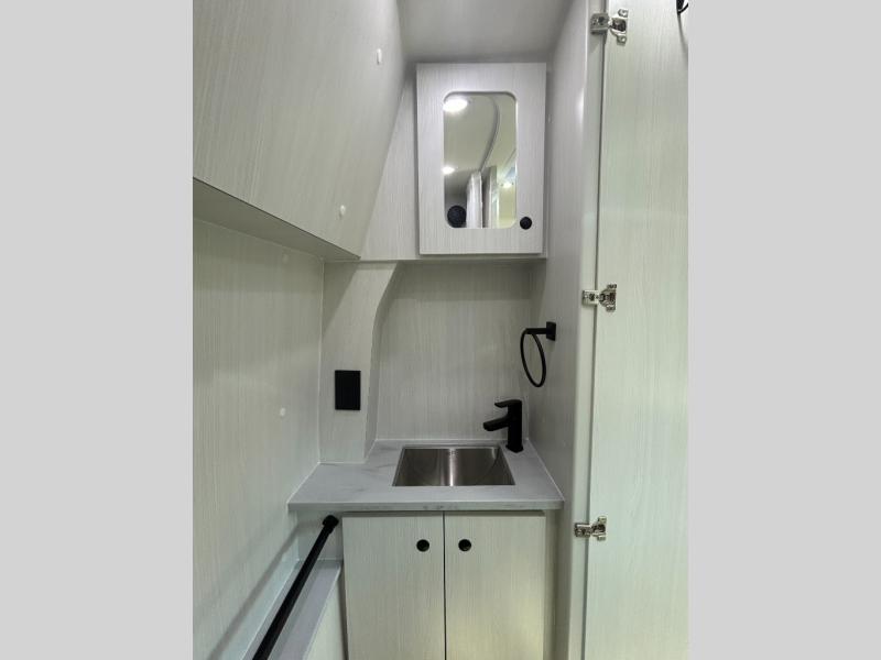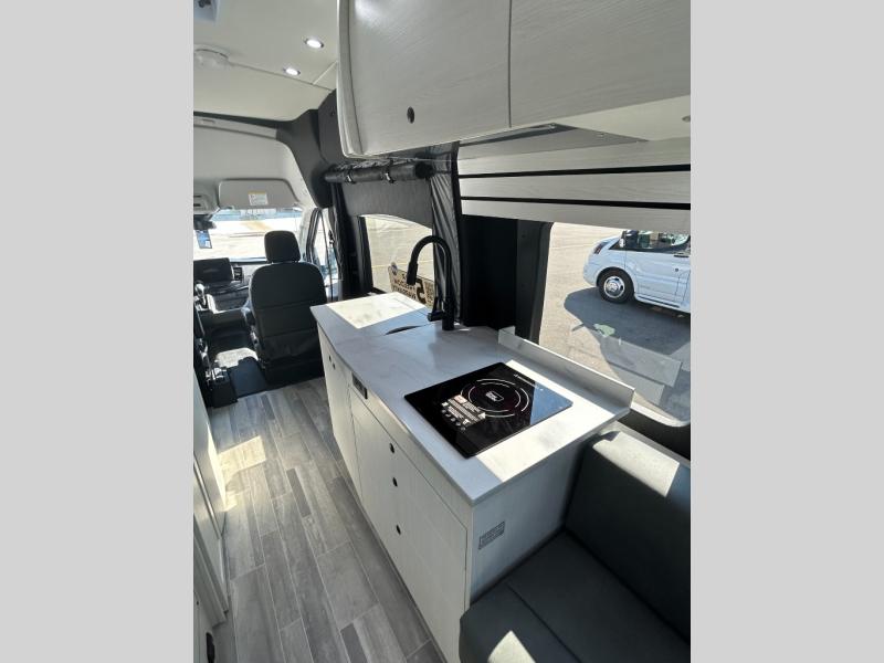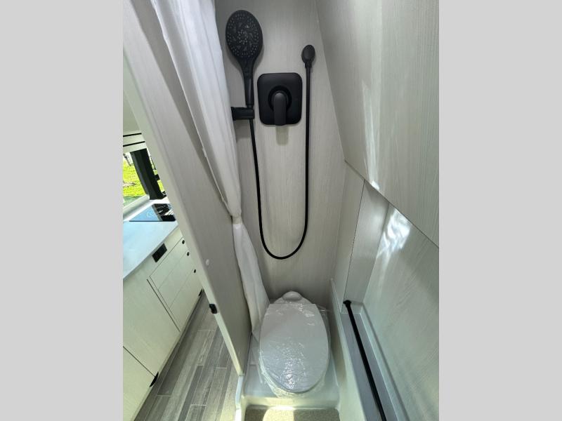 This 2.2 Ontour model is similar to model 2.0, but with a larger refrigerator, and more storage space in the bath. The rear power sofa converts to a 68" x 76" queen-sized bed with memory foam cushions for all-around comfort and the wet bath allows you to clean up each day. There is also a vanity with storage, a sink, and a Corian countertop in the bath for added convenience. Prepare meals either on the one burner induction stove top or in the microwave oven and clean-up will be a breeze with a stainless-steel sink that includes a high-arc faucet.