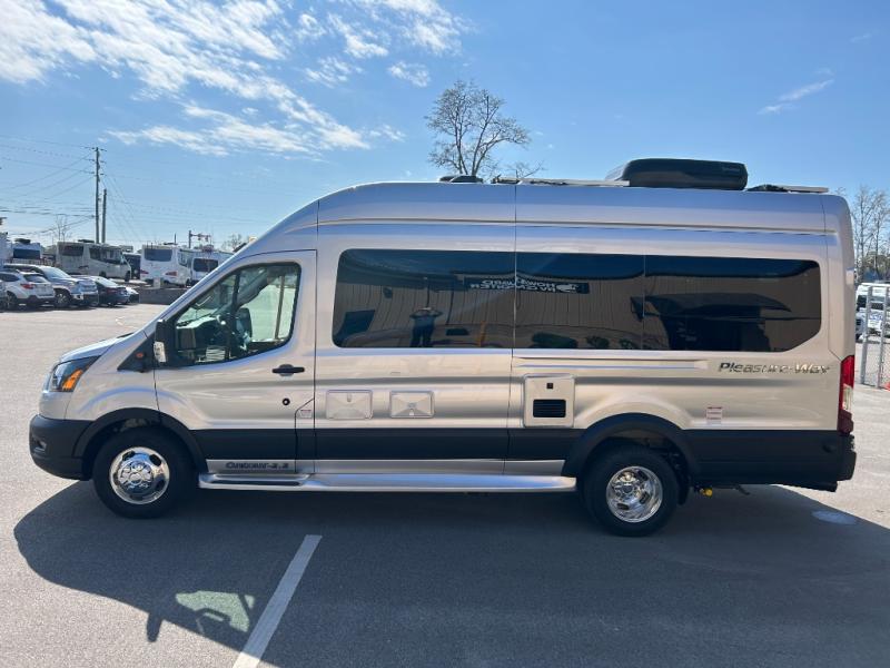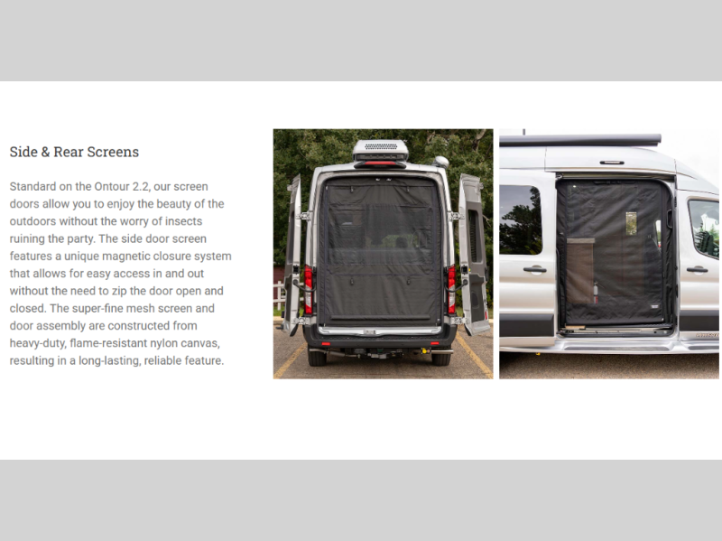 Each one of these Pleasure-Way Ontour Class B gas motorhomes can take you wherever you want to go with ease thanks to the Ford Transit 350 AWD chassis and 3.5L EcoBoost® V6 engine! The 10-inch touchscreen adds even more advances like monitoring the dual 600Ah Eco-Ion Earth Smart lithium coach batteries with a state-of-charge meter, an estimated time until charge, a remaining runtime for DC power, and a battery temperature gauge. The rear door and side door roll-up screens are made with a heavy-duty nylon canvas that precisely fits the opening and has a super-fine mesh to keep the insects out, but the cool breeze coming through. The GO POWER!® solar package lets you freely extend your off-grid adventures using roof mounted solar panels, plus the integrated charging system includes a super-efficient MPPT controller for 15-30% more efficiency when the solar energy is transferred from the panels to the battery bank. Get on the road today!