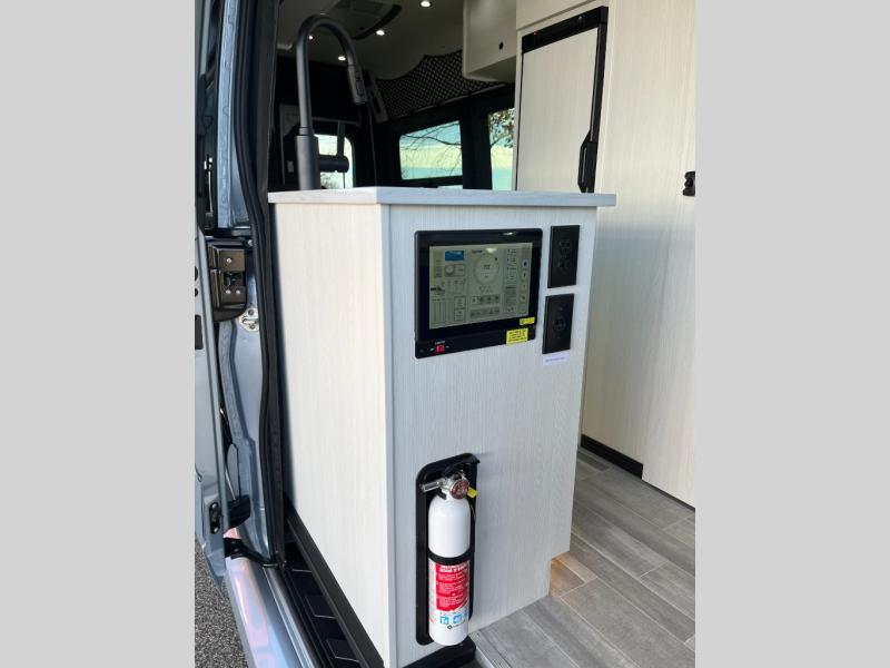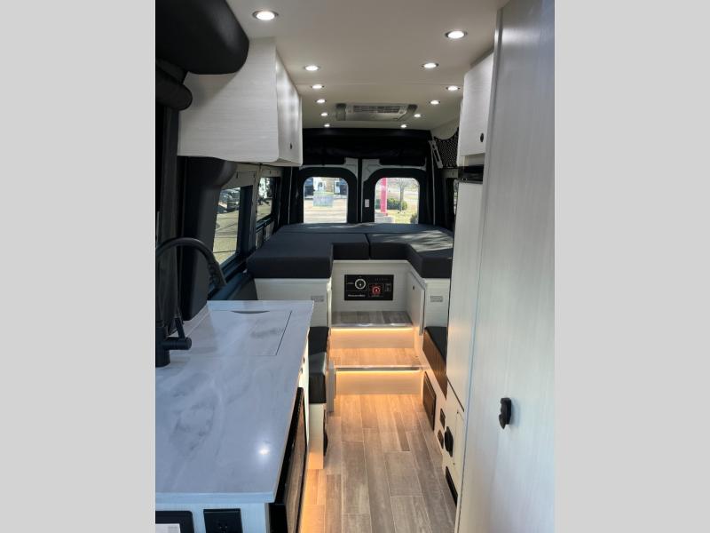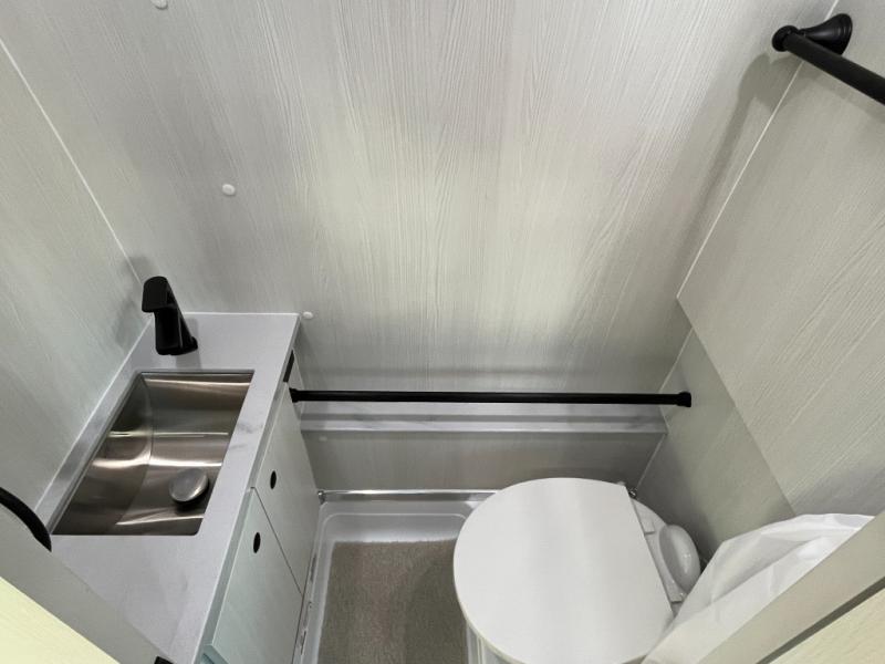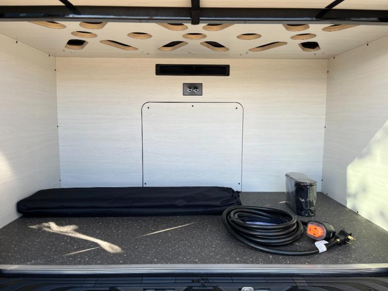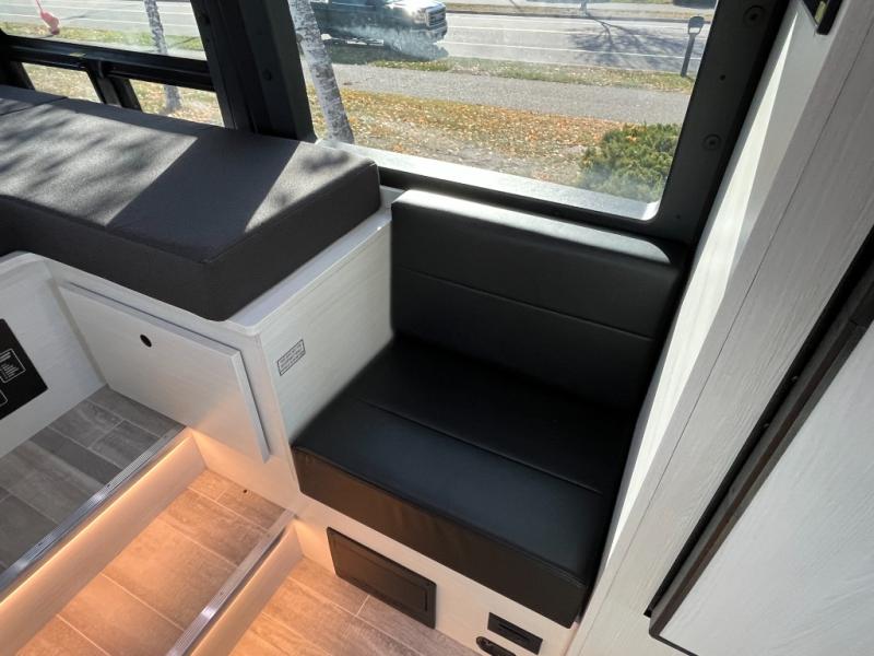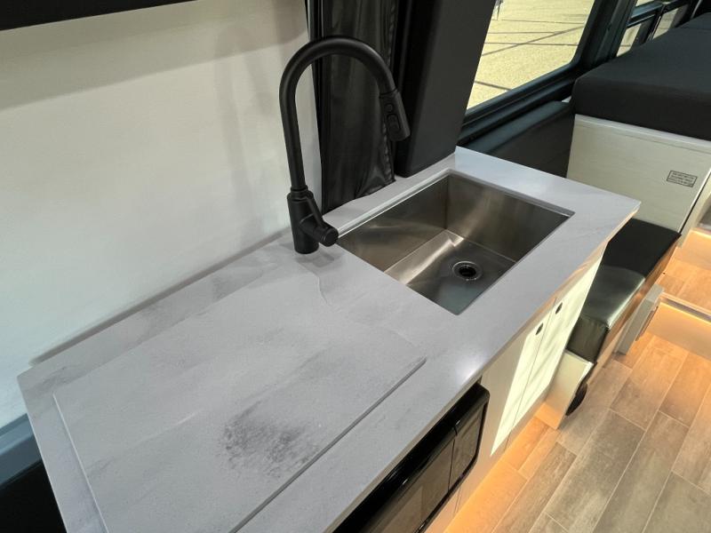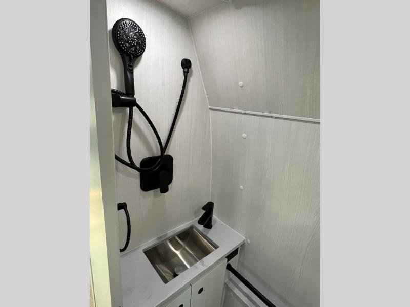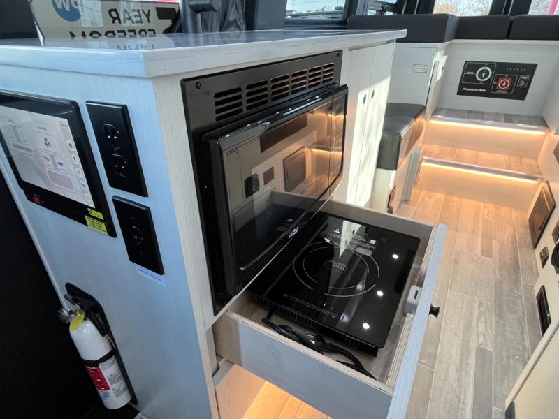The kitchen galley is equipped for the road. With two Lagun mounting locations, you can extend your counter space exactly where and when you need it. The deep sink, accented by elegant matte black Moen taps, with microwave and fridge, ensuring convenience without compromise. The induction stovetop is also portable, allowing you to cook wherever is convenient, and is easily stored back in its galley drawer. It’s a space that proves even a small kitchen can feel functional, stylish, and ready for anything.