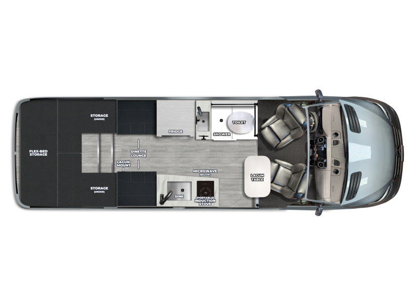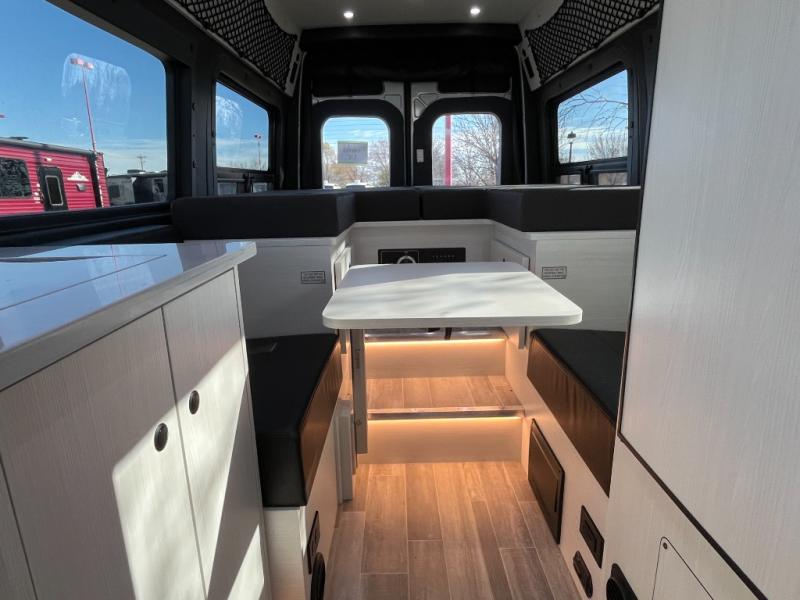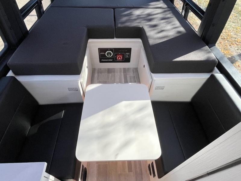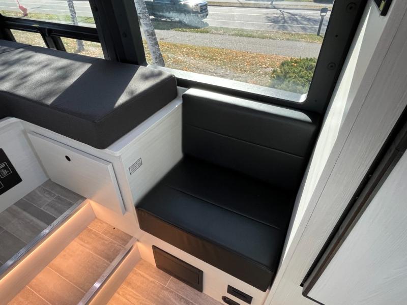 This thoughtfully designed unit blends everyday comfort with remarkable versatility. A raised twin bed offers a restful retreat, while its clever flip-up design reveals a spacious rear storage area perfect for all your travel essentials. Inside, a charming dinette and two versatile Lagun table mount locations create inviting spaces for dining, working, or relaxing. With abundant storage throughout, you’ll have room for everything you need to make each journey feel like home.