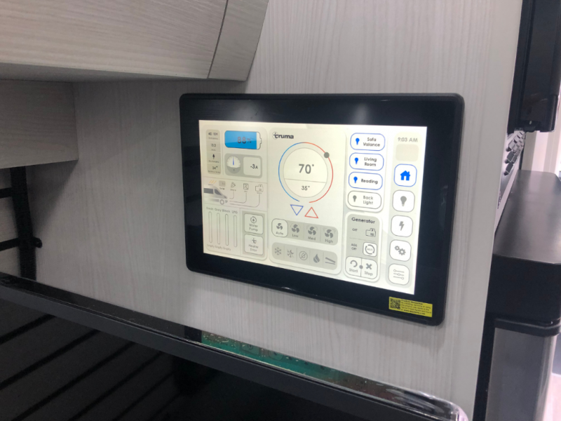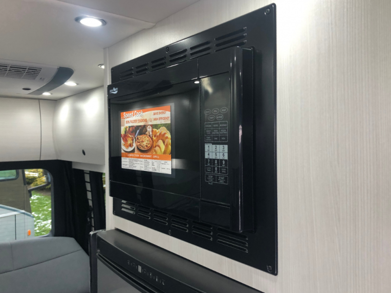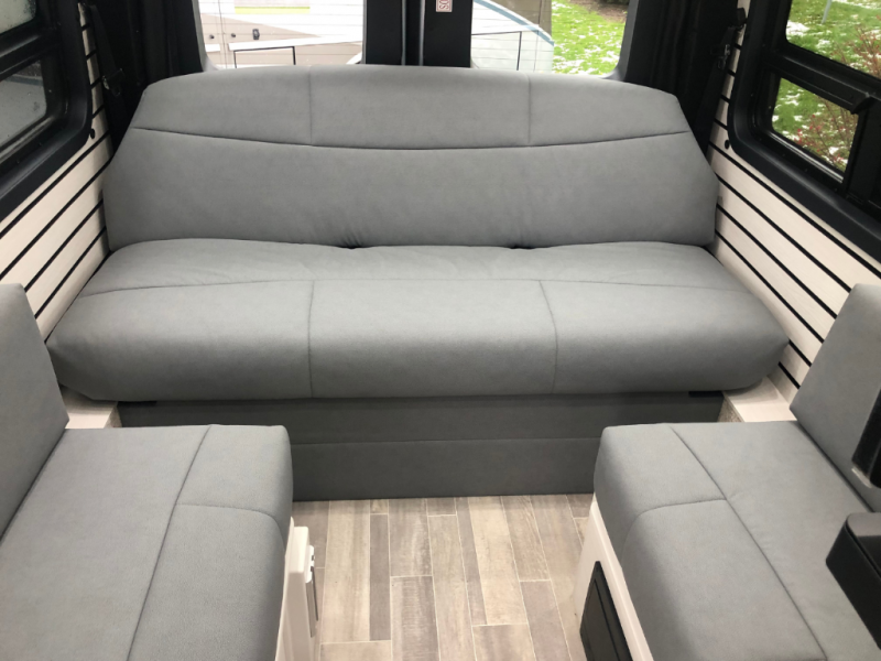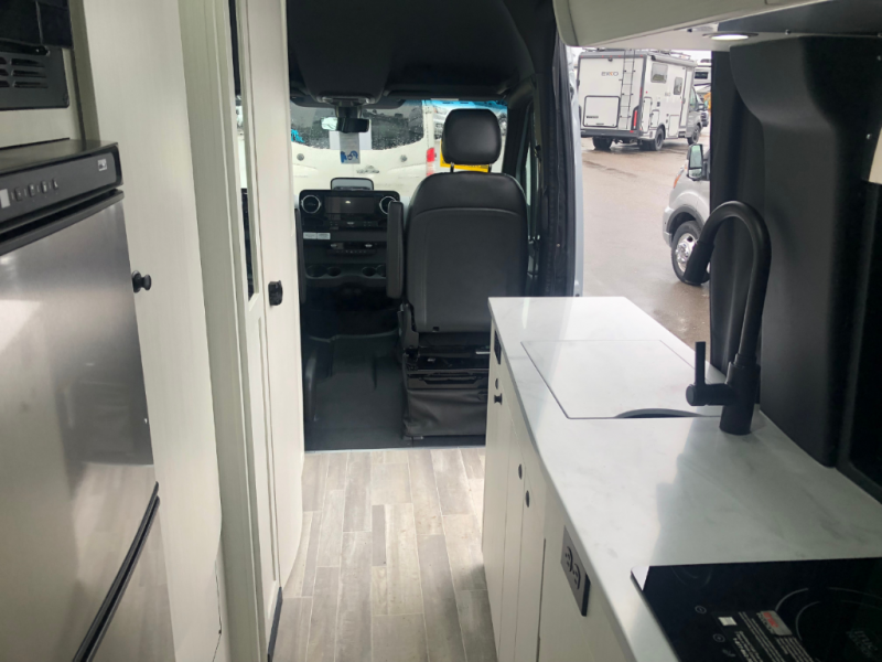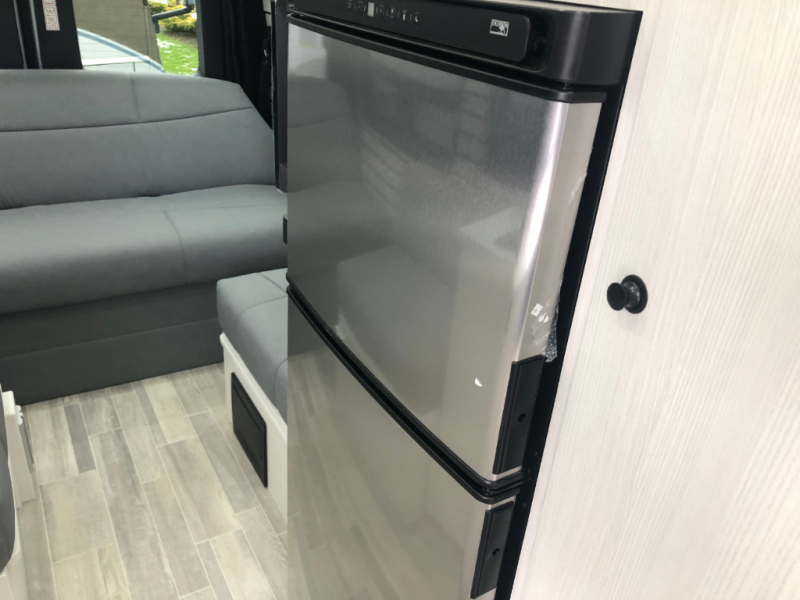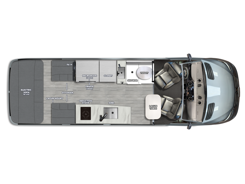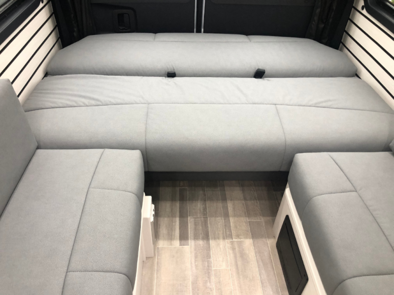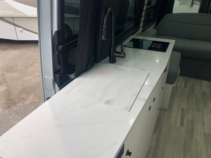 The Plateau TS layout provides for a large bathroom, eight cubic foot refrigerator, full-size wardrobe and extended galley area, while still leaving the bank of passenger side windows clear and unobstructed. The combination of the fully opening side door, roll up screen package and generous 6 foot Corian® countertop allow for a preparation and serving area that lets you enjoy the outdoors wherever you are camped.