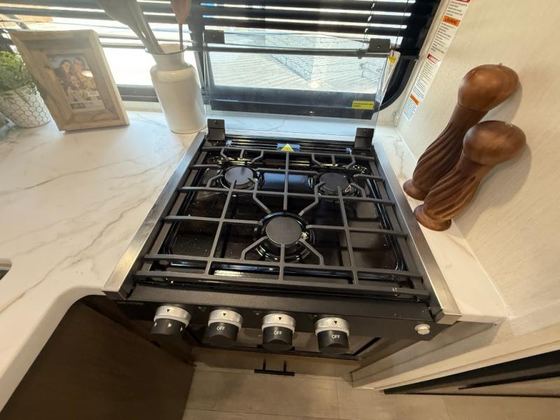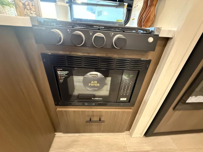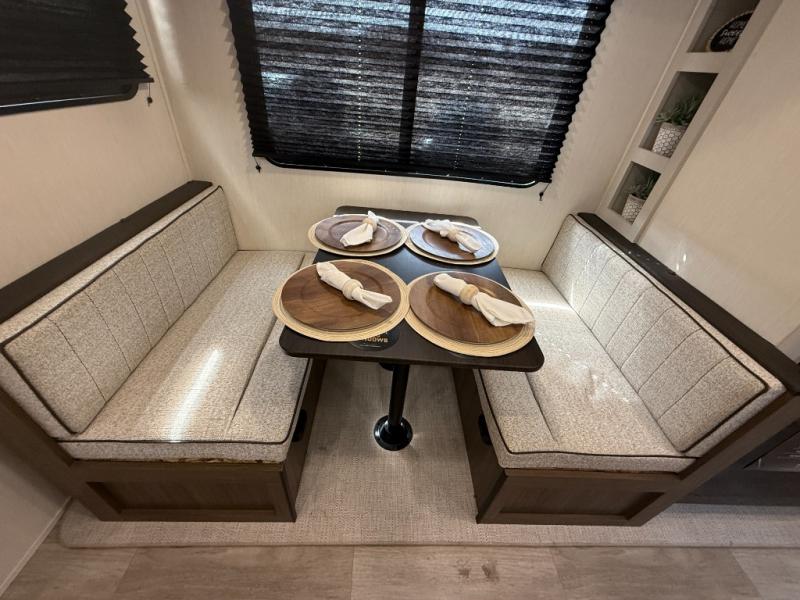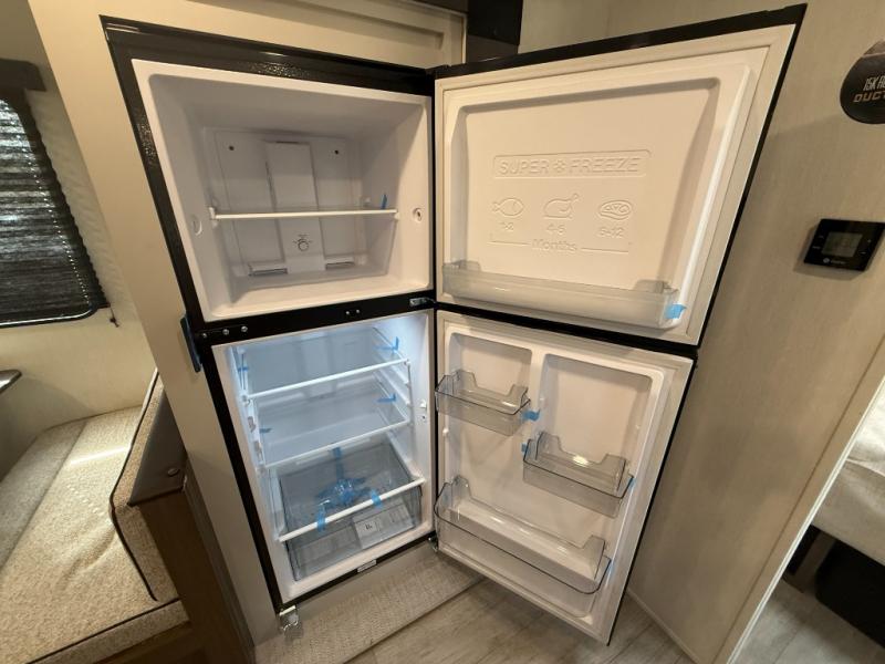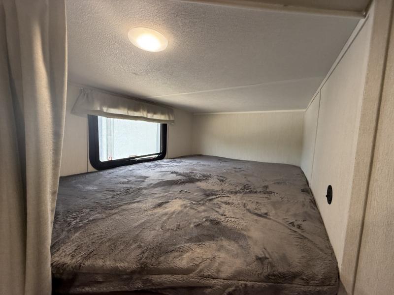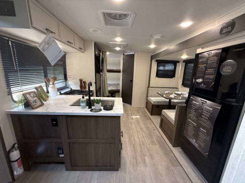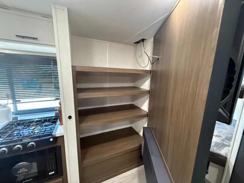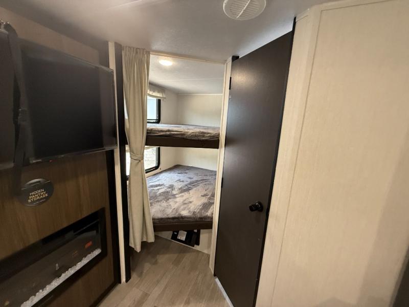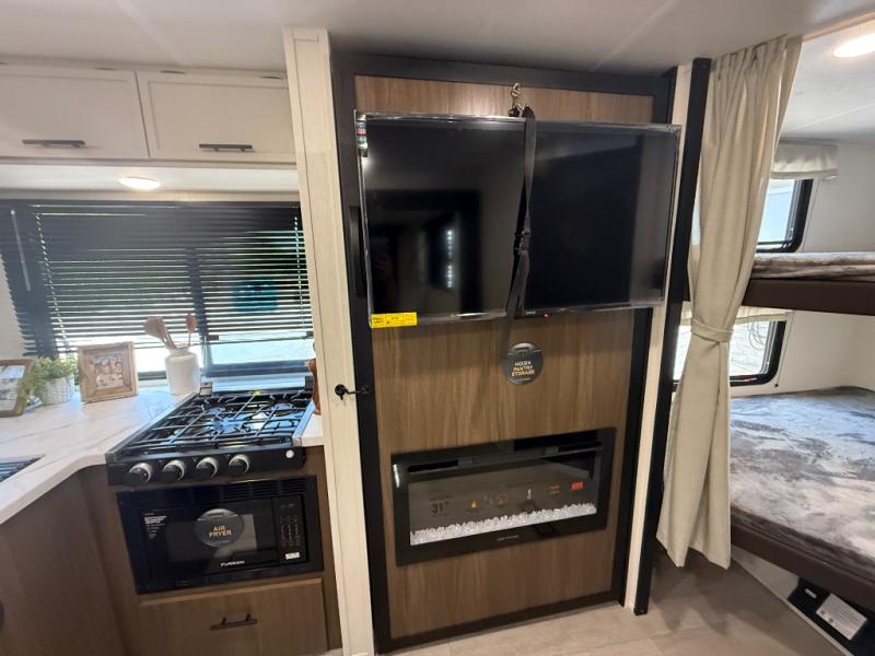 You'll appreciate the added sleeping space in this unit with double-size bunks! You'll have your own space up front in the private bedroom, complete with a camp king bed and storage for your things, and if you need even more sleeping space, the dinette can be used as well. The chef of your group will find a three-burner cooktop and a built-in convection microwave with an air fryer to cook meals, plus there is a 12V refrigerator and large hidden pantry for food storage. This unit also includes a power awning outdoors and an outside refrigerator to keep cold drinks close by.