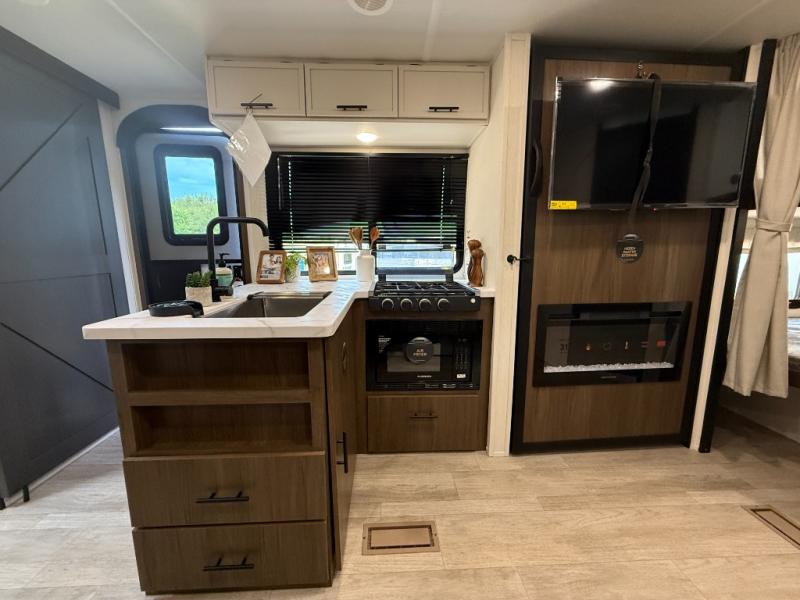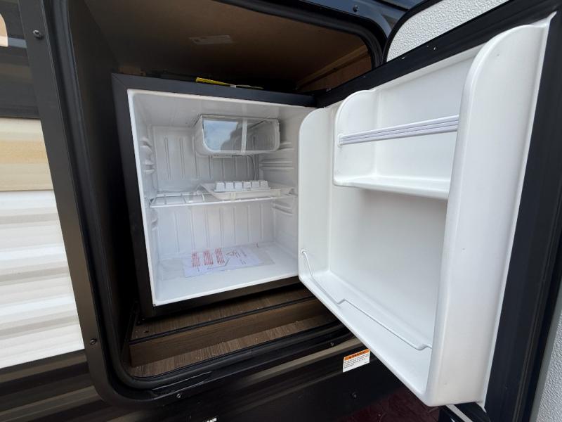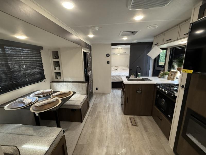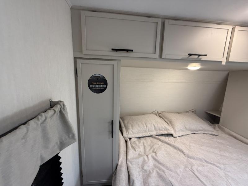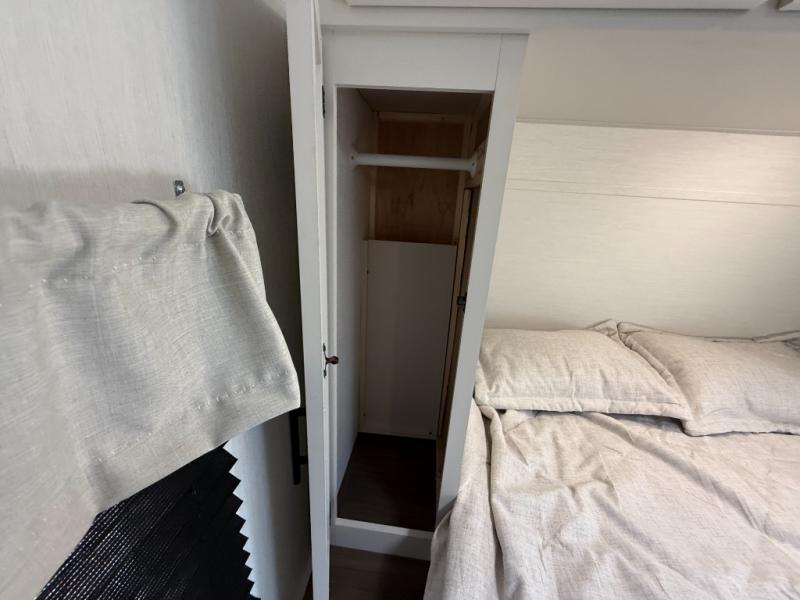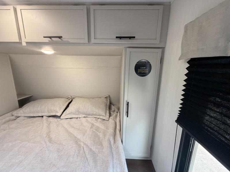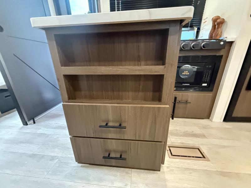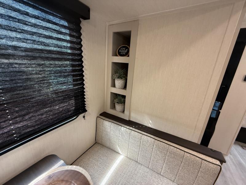 You'll appreciate the added sleeping space in this unit with double-size bunks! You'll have your own space up front in the private bedroom, complete with a camp king bed and storage for your things, and if you need even more sleeping space, the dinette can be used as well. The chef of your group will find a three-burner cooktop and a built-in convection microwave with an air fryer to cook meals, plus there is a 12V refrigerator and large hidden pantry for food storage. This unit also includes a power awning outdoors and an outside refrigerator to keep cold drinks close by.