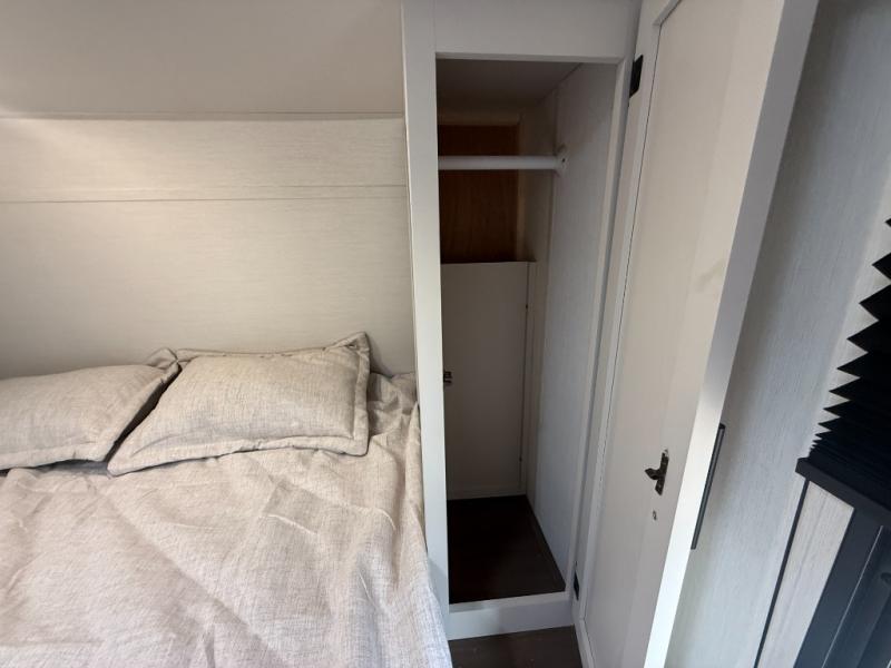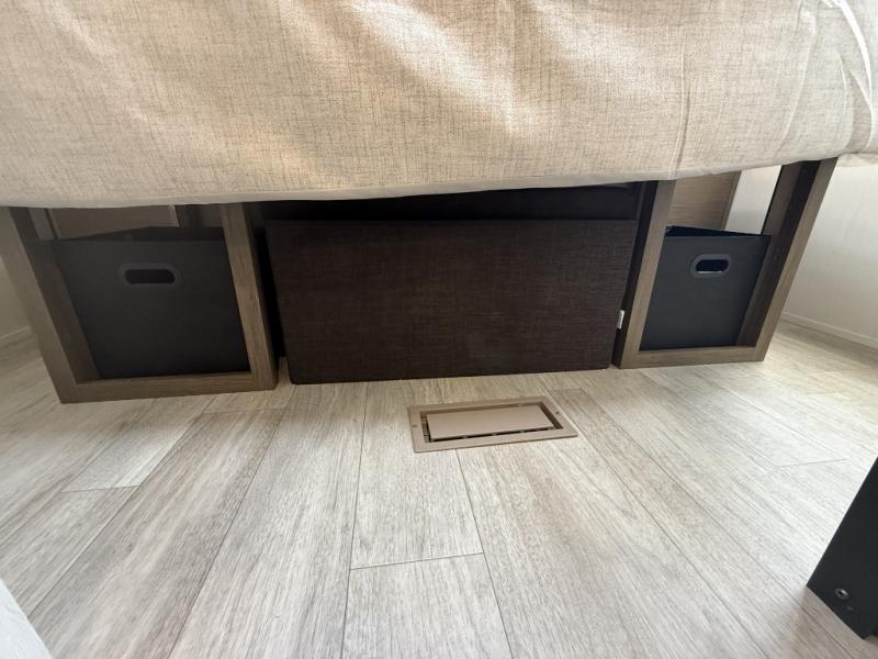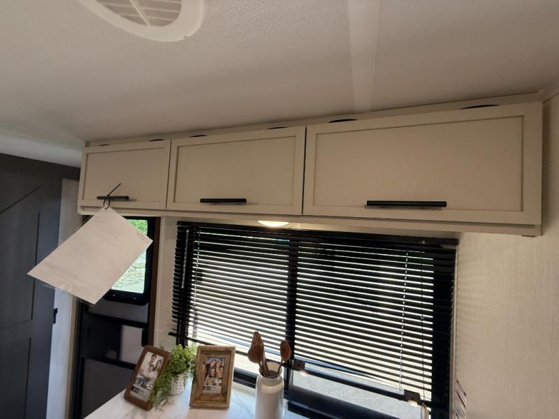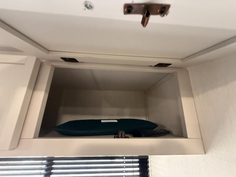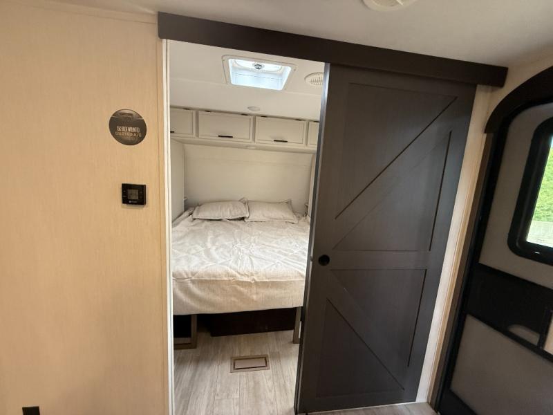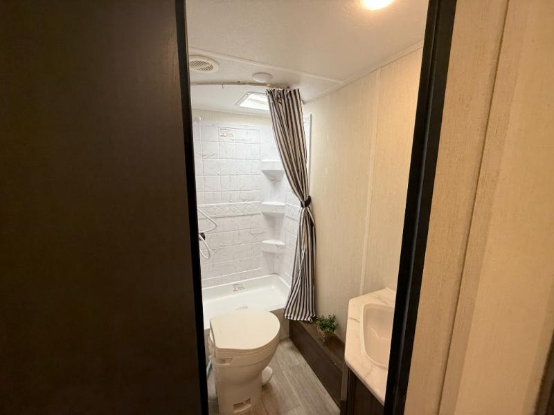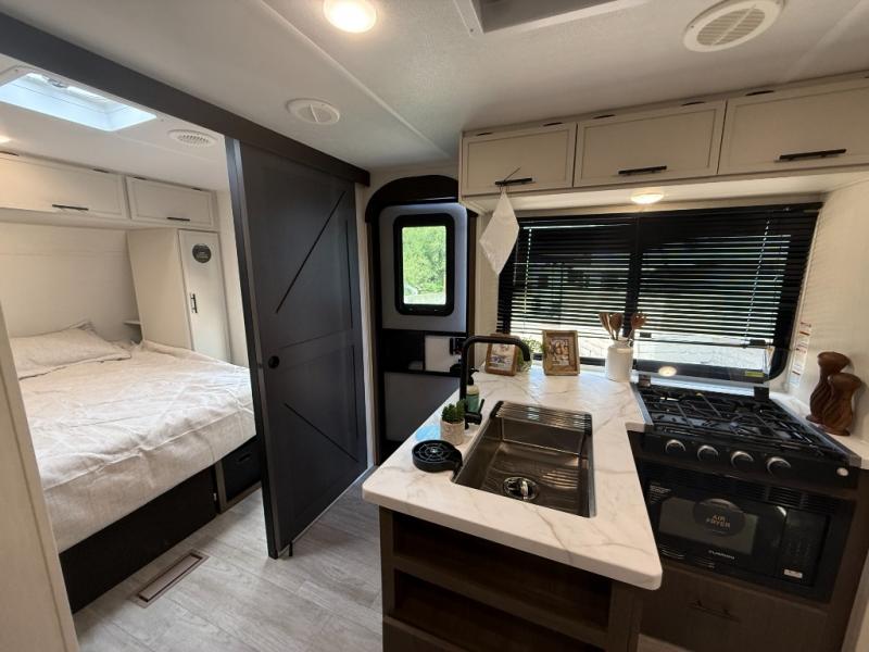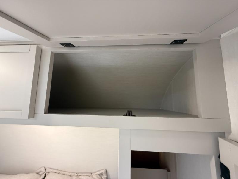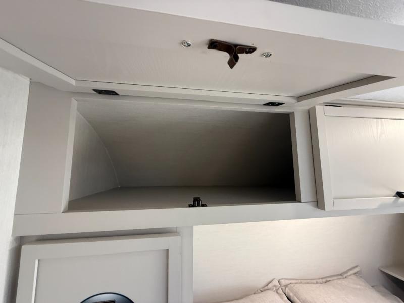 You'll appreciate the added sleeping space in this unit with double-size bunks! You'll have your own space up front in the private bedroom, complete with a camp king bed and storage for your things, and if you need even more sleeping space, the dinette can be used as well. The chef of your group will find a three-burner cooktop and a built-in convection microwave with an air fryer to cook meals, plus there is a 12V refrigerator and large hidden pantry for food storage. This unit also includes a power awning outdoors and an outside refrigerator to keep cold drinks close by.