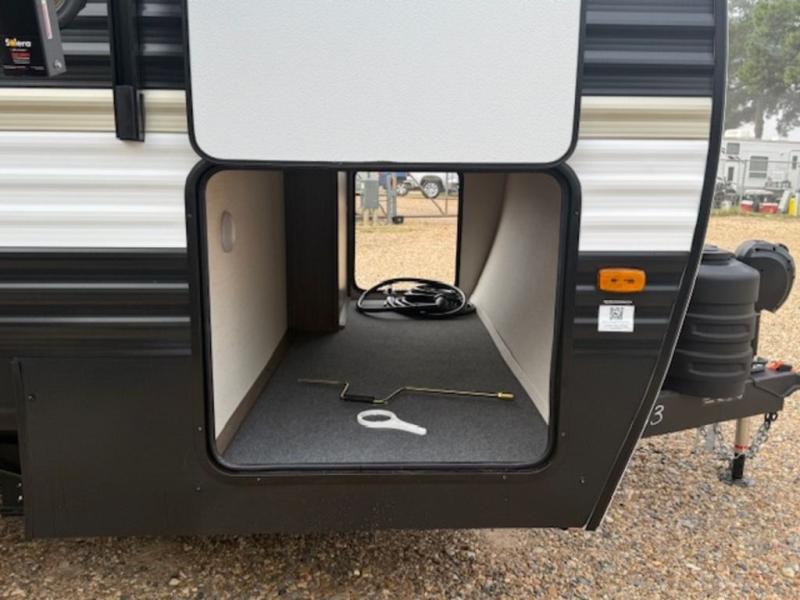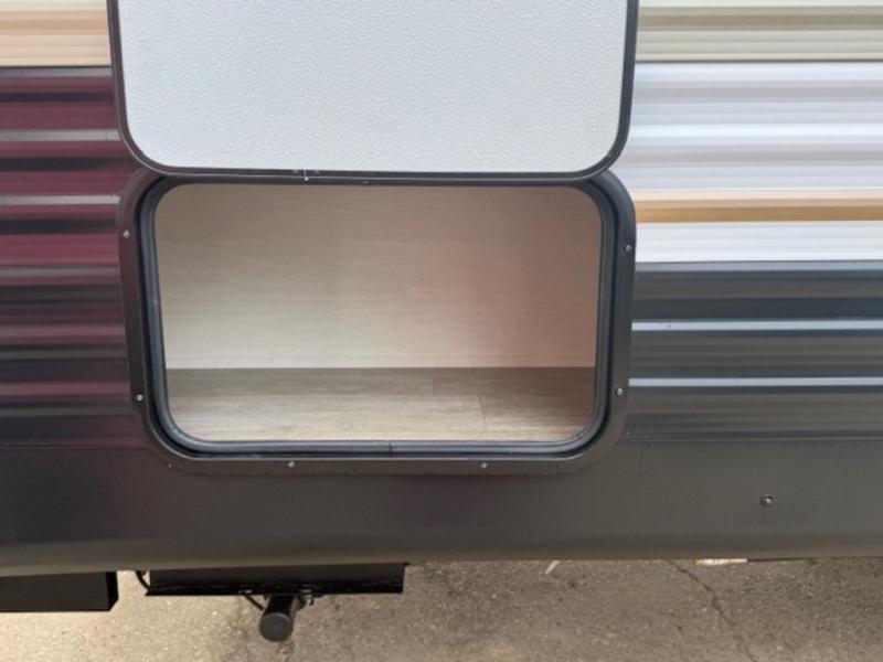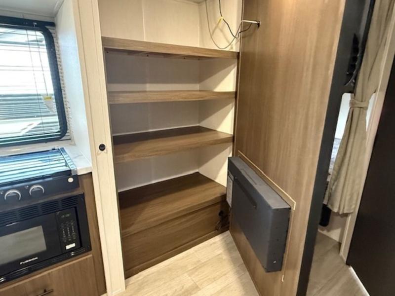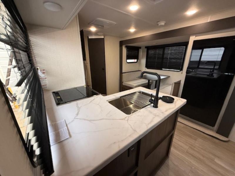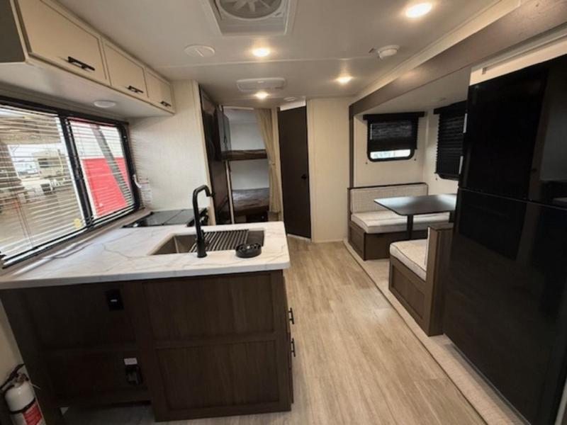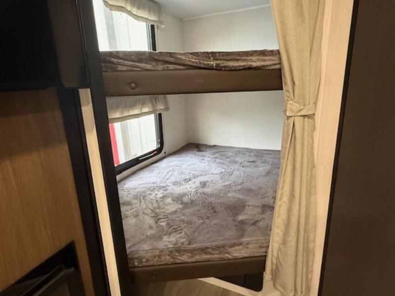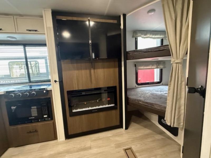 You'll appreciate the added sleeping space in this unit with double-size bunks! You'll have your own space up front in the private bedroom, complete with a camp king bed and storage for your things, and if you need even more sleeping space, the dinette can be used as well. The chef of your group will find a three-burner cooktop and a built-in convection microwave with an air fryer to cook meals, plus there is a 12V refrigerator and large hidden pantry for food storage. This unit also includes a power awning outdoors and an outside refrigerator to keep cold drinks close by.