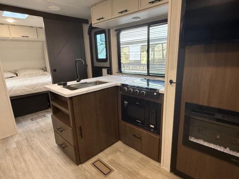 With any Avenger travel trailer by Prime Time RV, you will find innovation, a solid build, and comfort at every turn. Each model is built with Tuff Coat on the exterior metal, a fully enclosed underbelly, and a PVC roof membrane to help extend the life of your trailer. You will also find automotive name badging on the exterior, along with an exterior shower, front rail LED light strips, plus an XL padded entry grab handle to name a few conveniences. There are plenty of storage spaces inside, as well as Congoleum flooring and woven PVC marine grade slide out flooring, a designer shower surround, and seamless pressed countertops. You are sure to appreciate the onboard water filtration system, tankless water heater, plus 30K BTU furnace and 15K ducted A/C to help keep you comfortable.