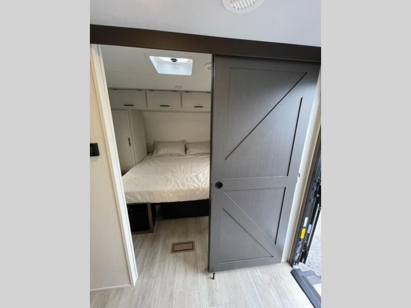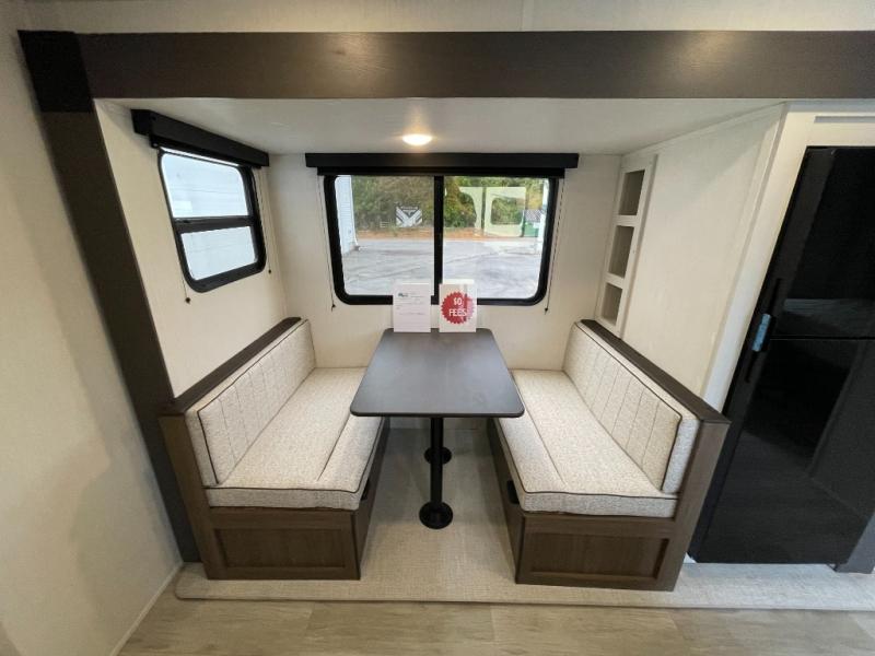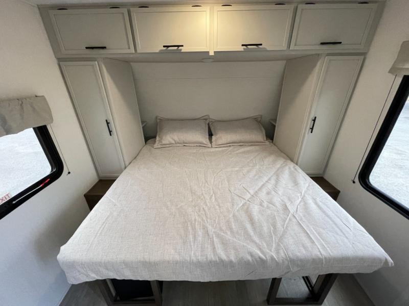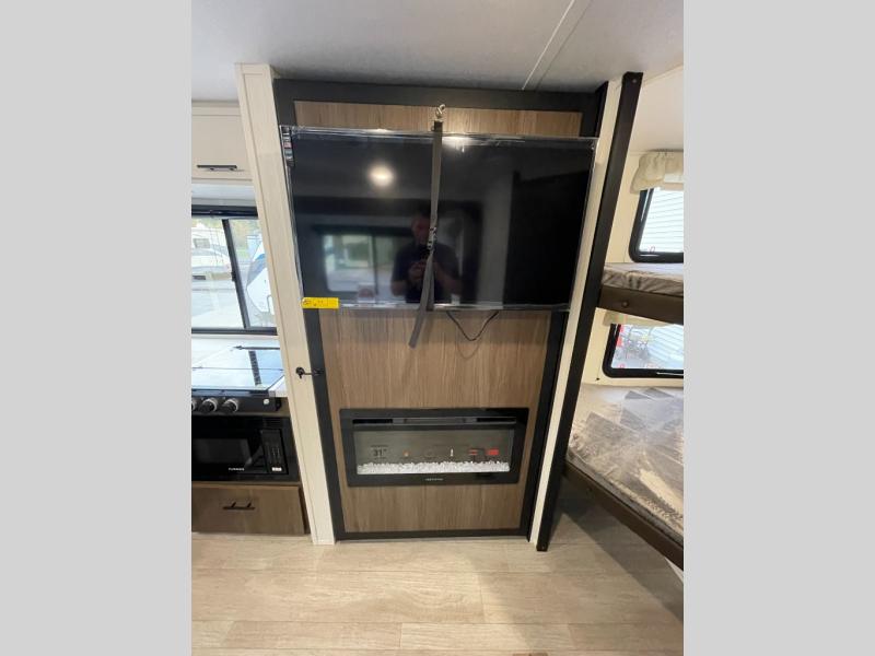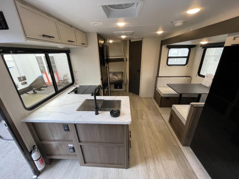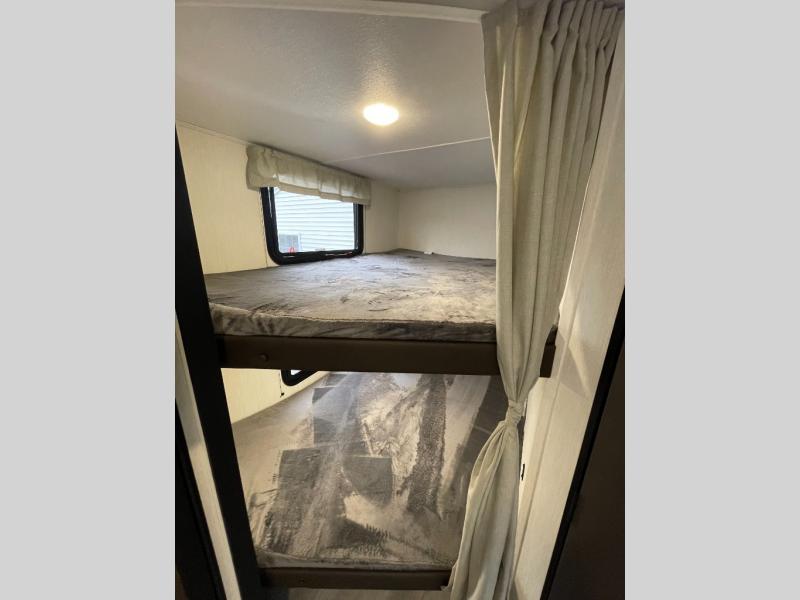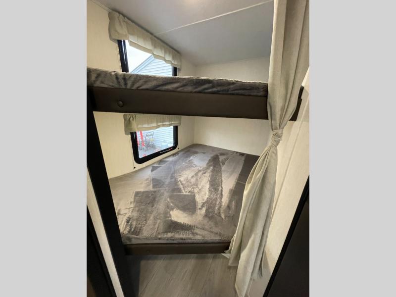 You'll appreciate the added sleeping space in this unit with double-size bunks! You'll have your own space up front in the private bedroom, complete with a camp king bed and storage for your things, and if you need even more sleeping space, the dinette can be used as well. The chef of your group will find a three-burner cooktop and a built-in convection microwave with an air fryer to cook meals, plus there is a 12V refrigerator and large hidden pantry for food storage. This unit also includes a power awning outdoors and an outside refrigerator to keep cold drinks close by.