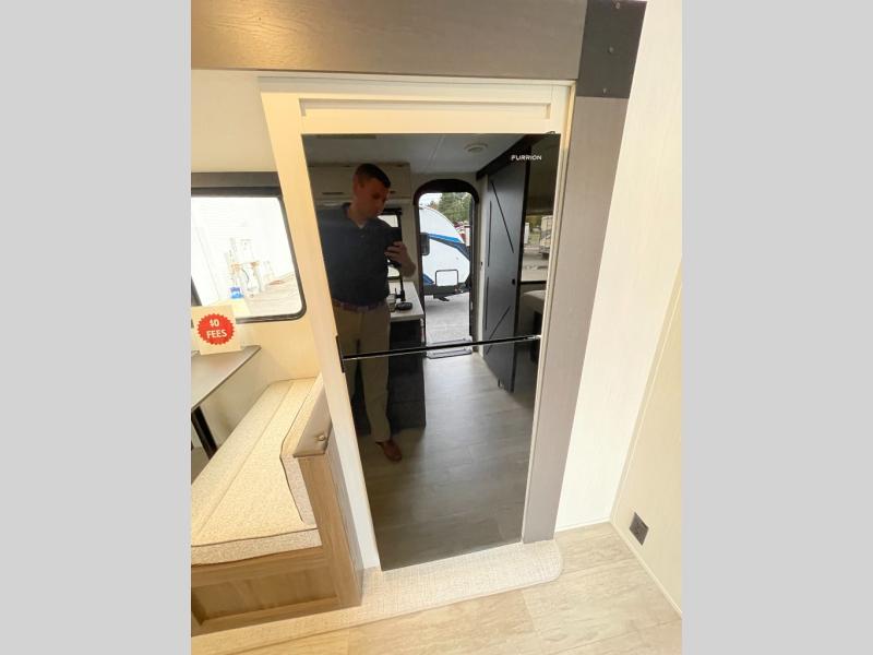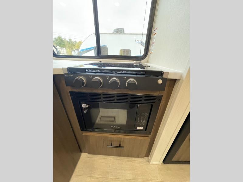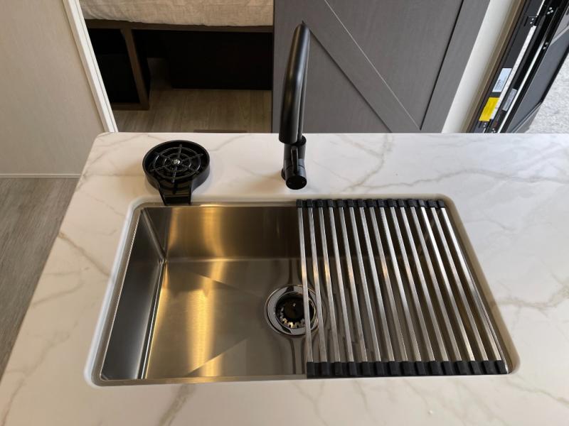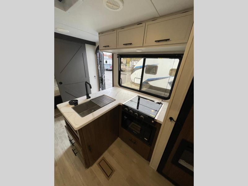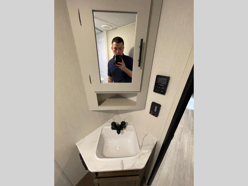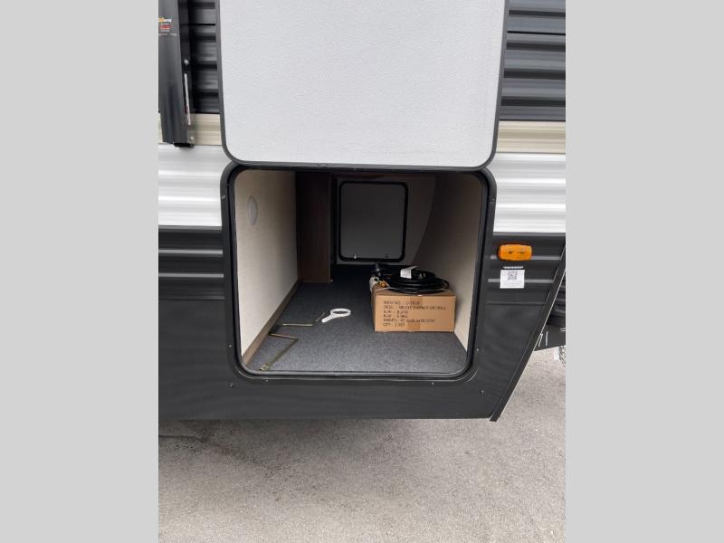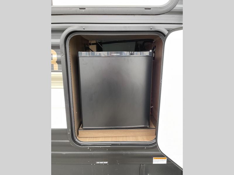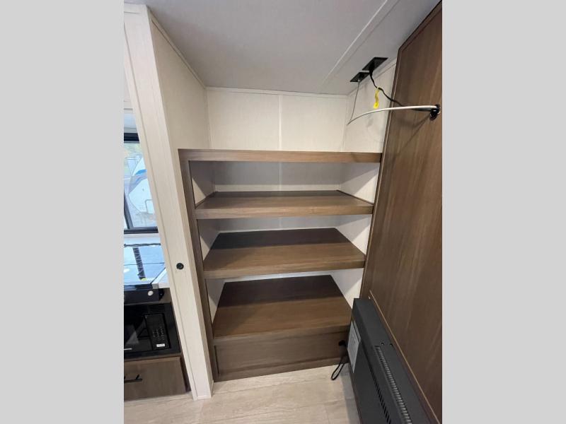 You'll appreciate the added sleeping space in this unit with double-size bunks! You'll have your own space up front in the private bedroom, complete with a camp king bed and storage for your things, and if you need even more sleeping space, the dinette can be used as well. The chef of your group will find a three-burner cooktop and a built-in convection microwave with an air fryer to cook meals, plus there is a 12V refrigerator and large hidden pantry for food storage. This unit also includes a power awning outdoors and an outside refrigerator to keep cold drinks close by.