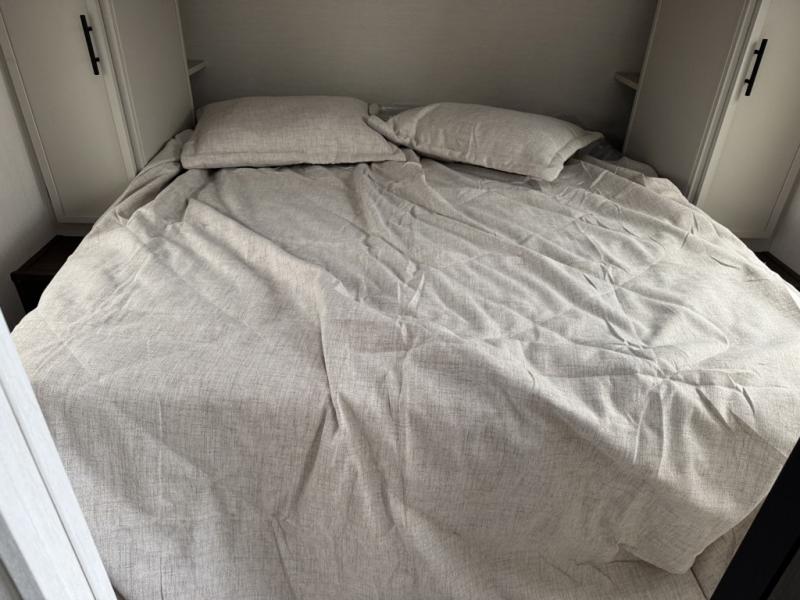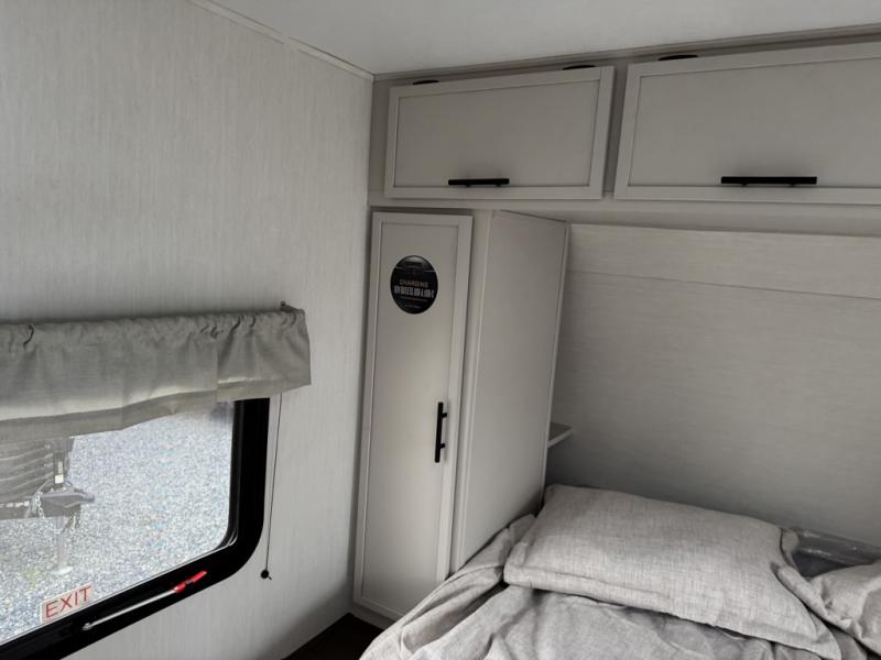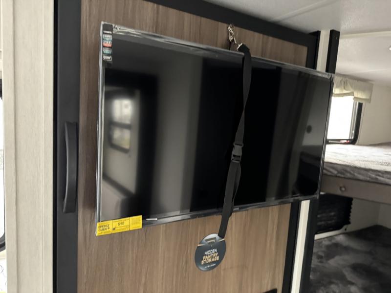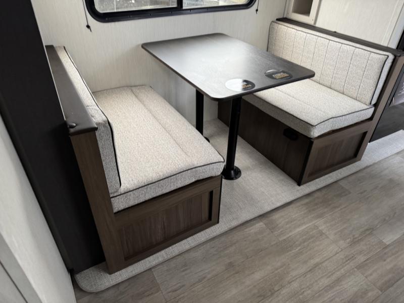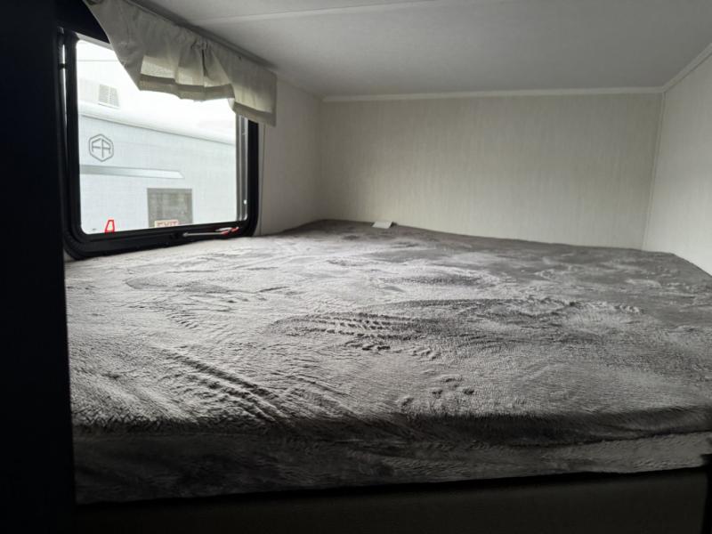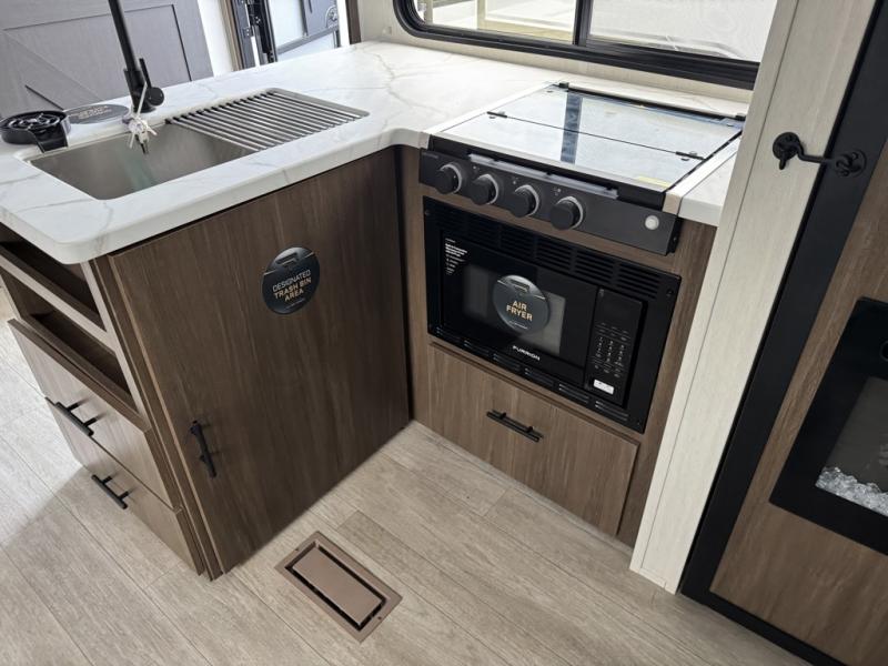 You'll appreciate the added sleeping space in this unit with double-size bunks! You'll have your own space up front in the private bedroom, complete with a camp king bed and storage for your things, and if you need even more sleeping space, the dinette can be used as well. The chef of your group will find a three-burner cooktop and a built-in convection microwave with an air fryer to cook meals, plus there is a 12V refrigerator and large hidden pantry for food storage. This unit also includes a power awning outdoors and an outside refrigerator to keep cold drinks close by.