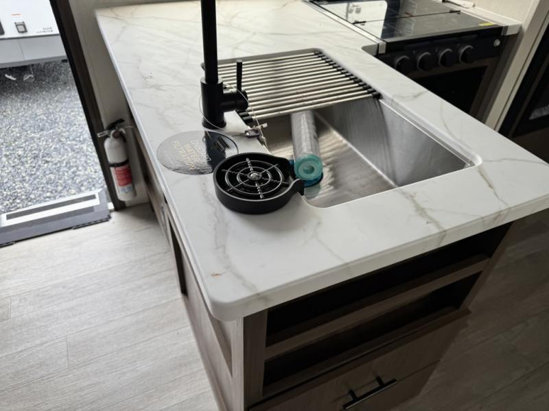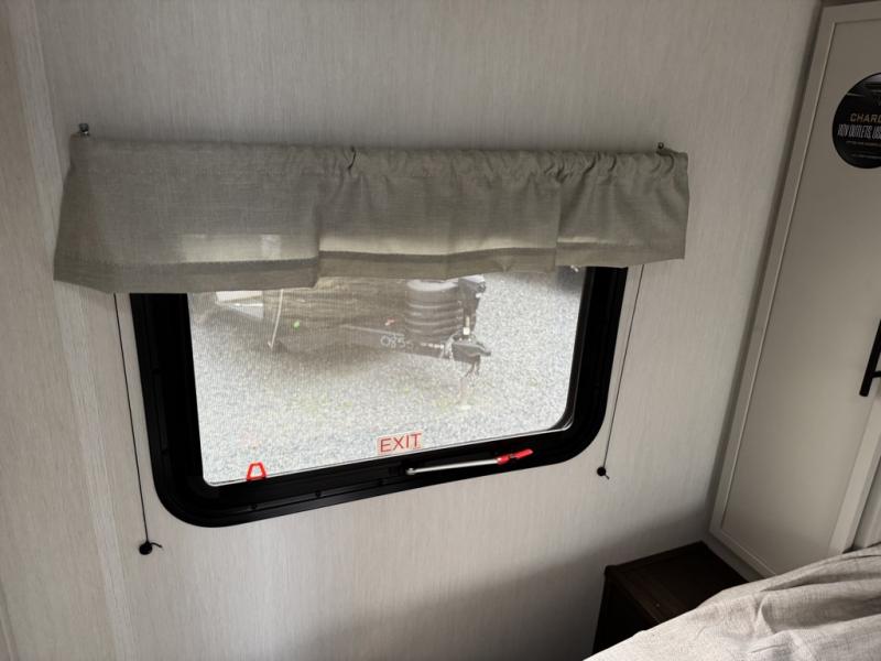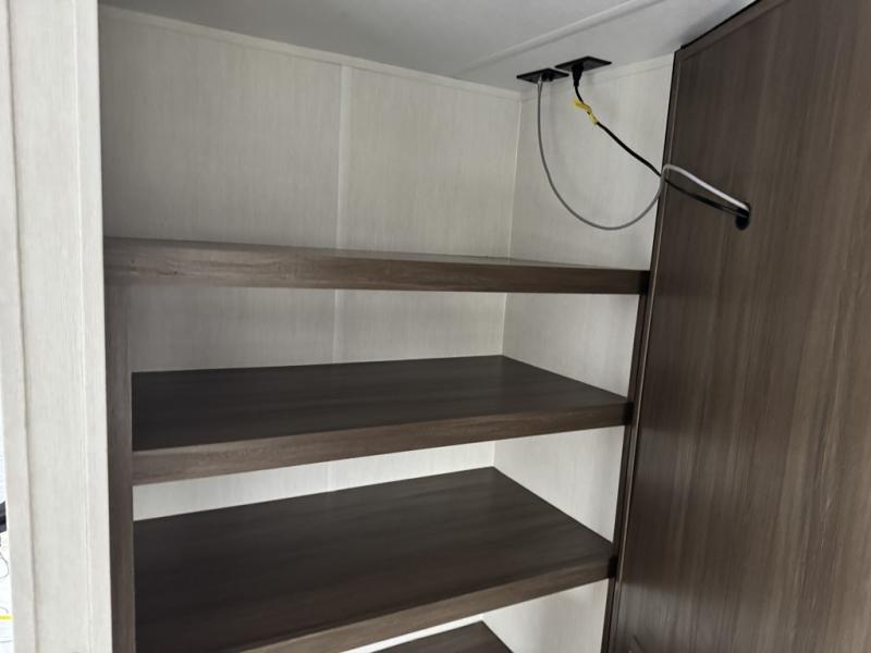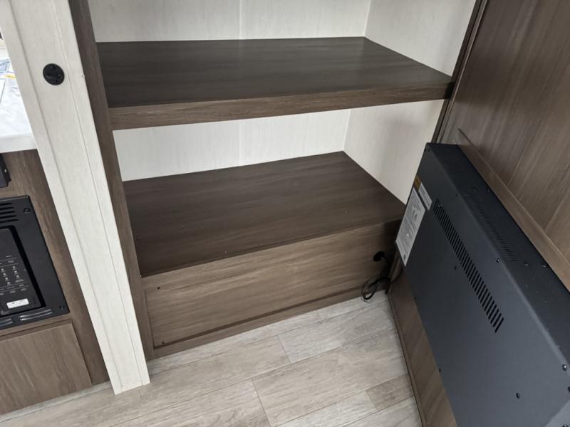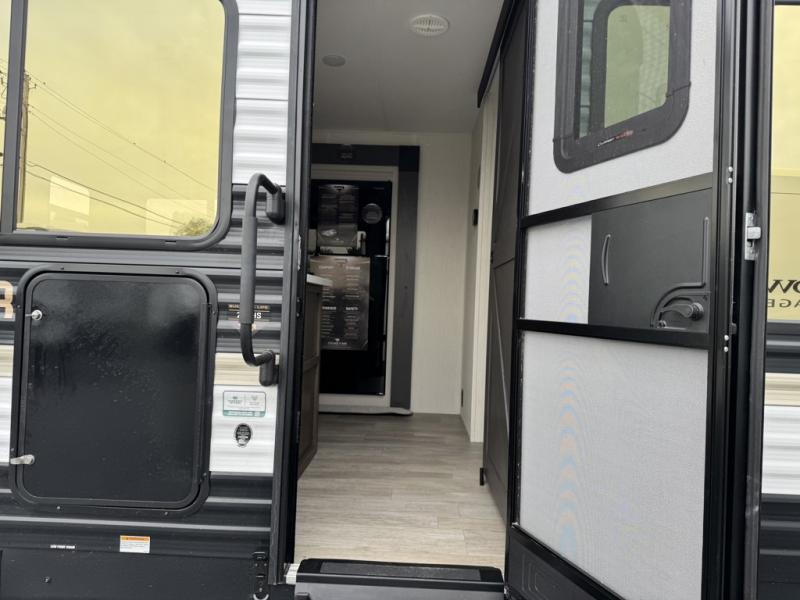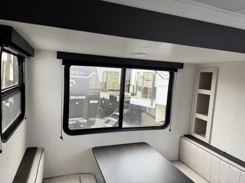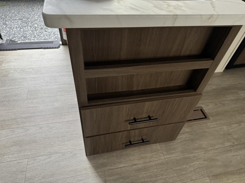 You'll appreciate the added sleeping space in this unit with double-size bunks! You'll have your own space up front in the private bedroom, complete with a camp king bed and storage for your things, and if you need even more sleeping space, the dinette can be used as well. The chef of your group will find a three-burner cooktop and a built-in convection microwave with an air fryer to cook meals, plus there is a 12V refrigerator and large hidden pantry for food storage. This unit also includes a power awning outdoors and an outside refrigerator to keep cold drinks close by.