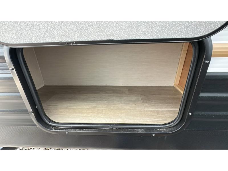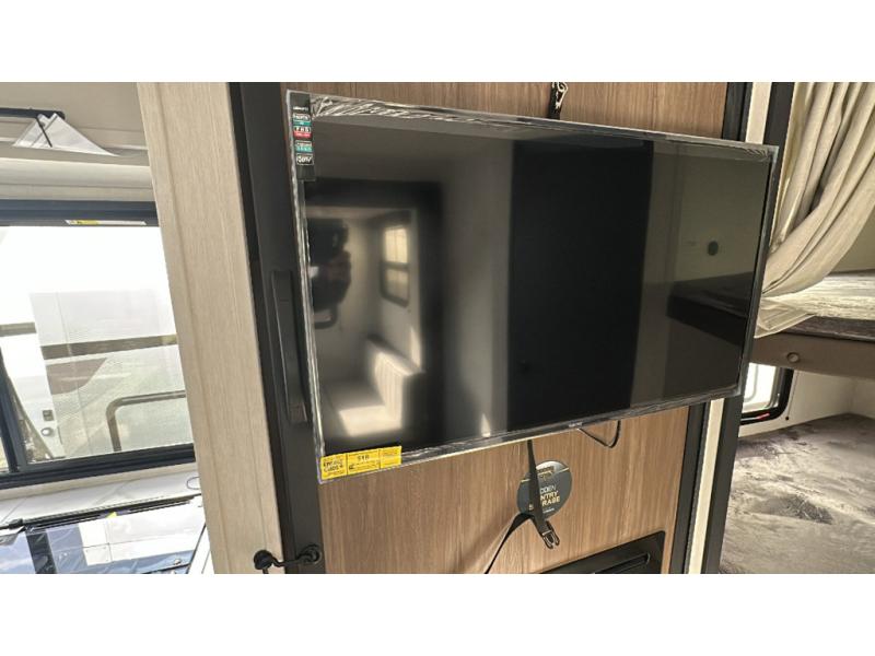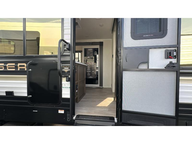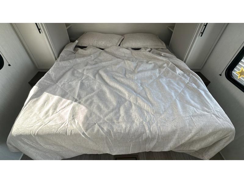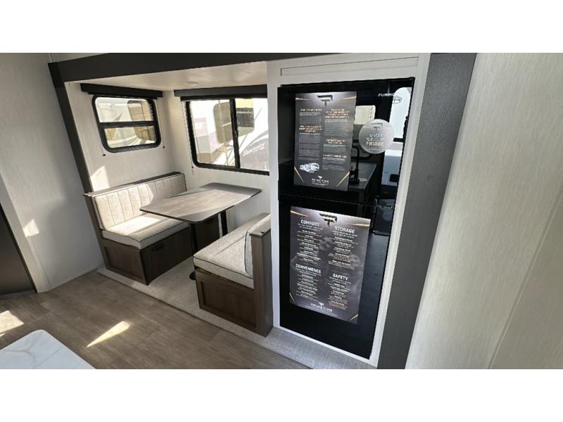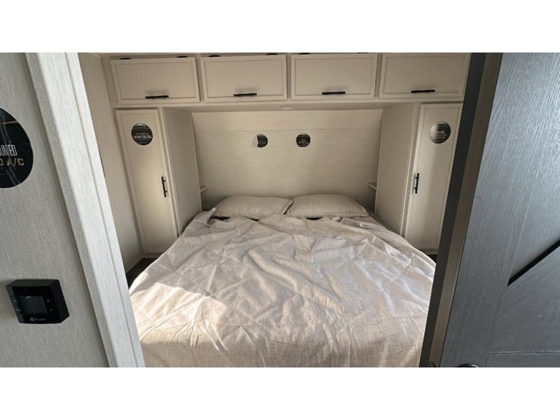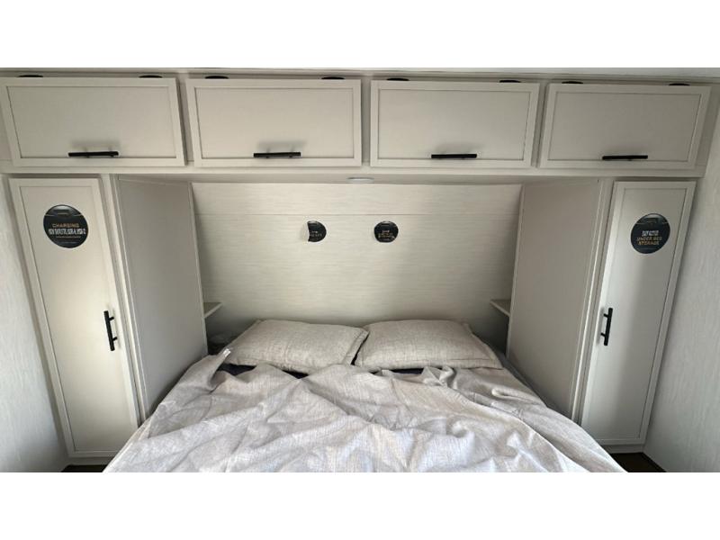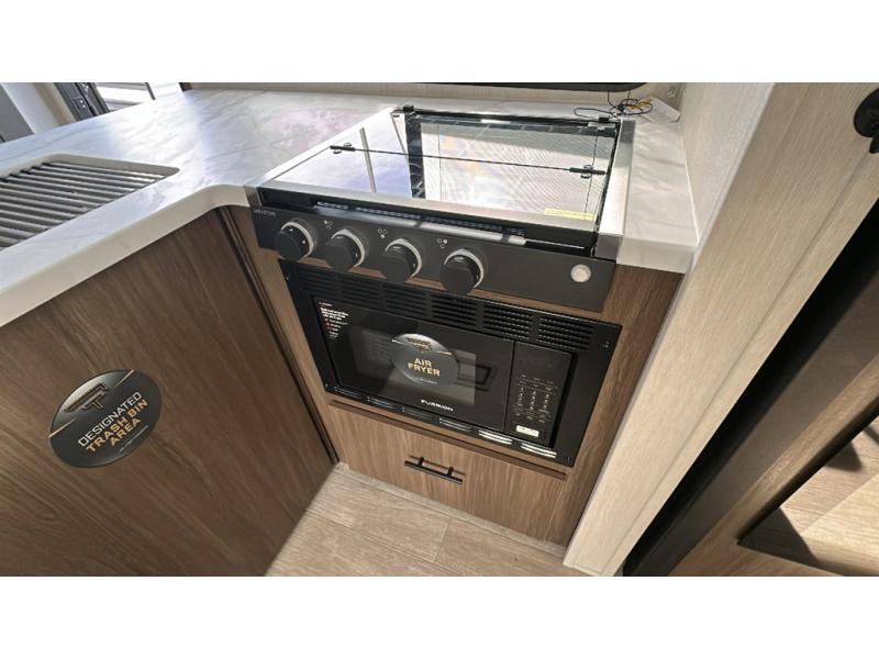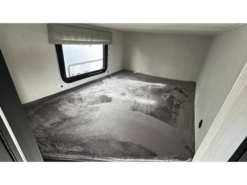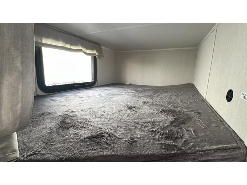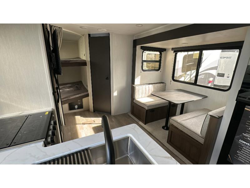 You'll appreciate the added sleeping space in this unit with double-size bunks! You'll have your own space up front in the private bedroom, complete with a camp king bed and storage for your things, and if you need even more sleeping space, the dinette can be used as well. The chef of your group will find a three-burner cooktop and a built-in convection microwave with an air fryer to cook meals, plus there is a 12V refrigerator and large hidden pantry for food storage. This unit also includes a power awning outdoors and an outside refrigerator to keep cold drinks close by.