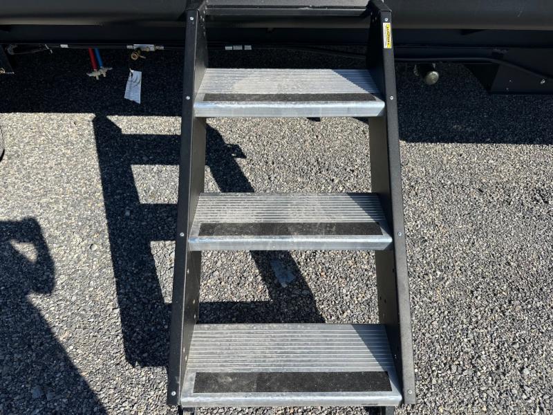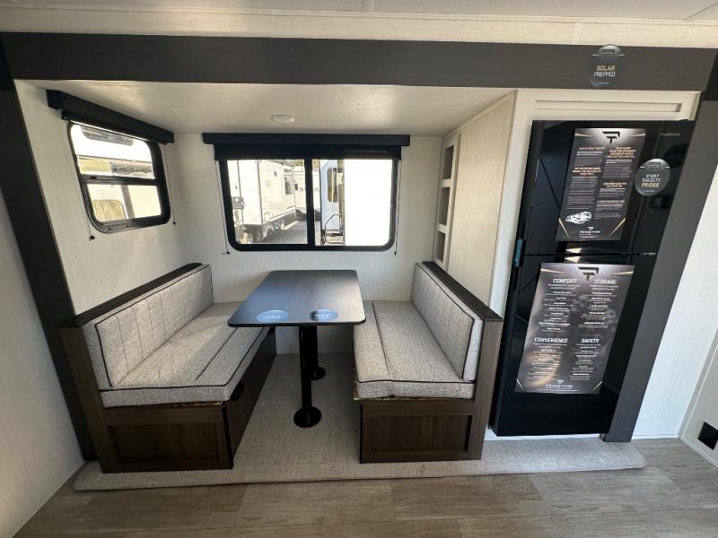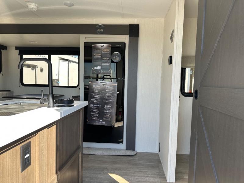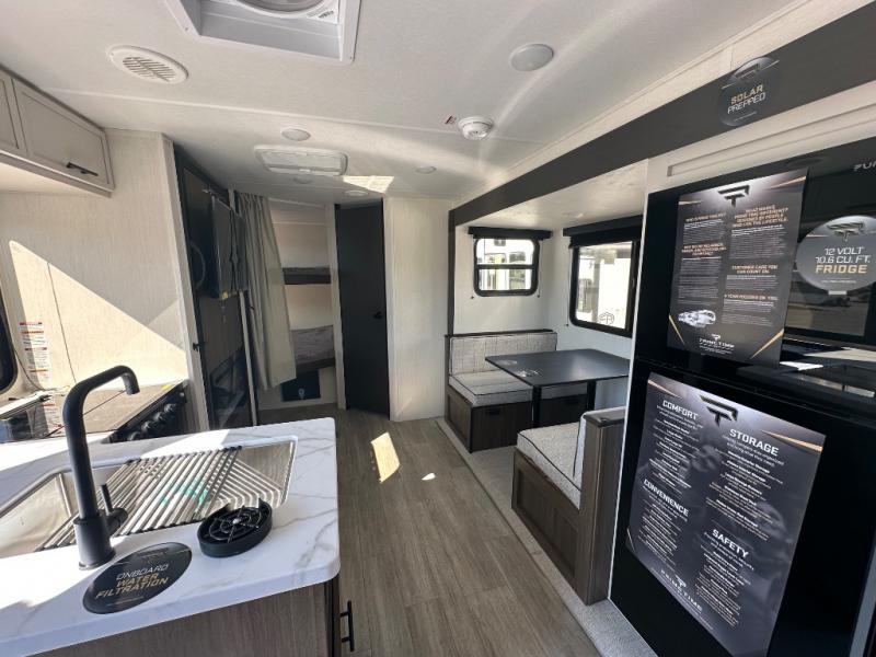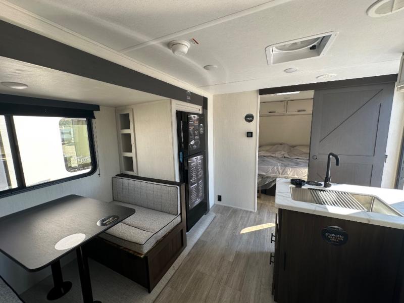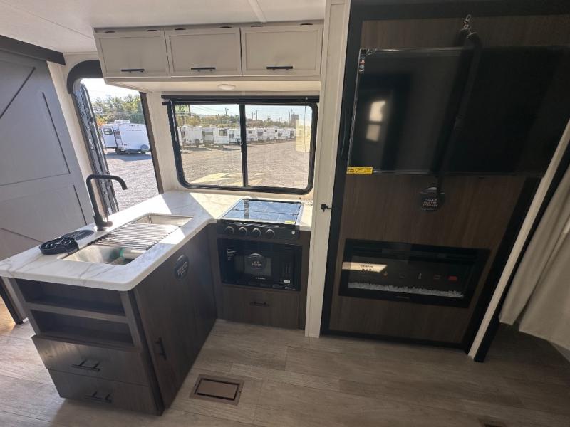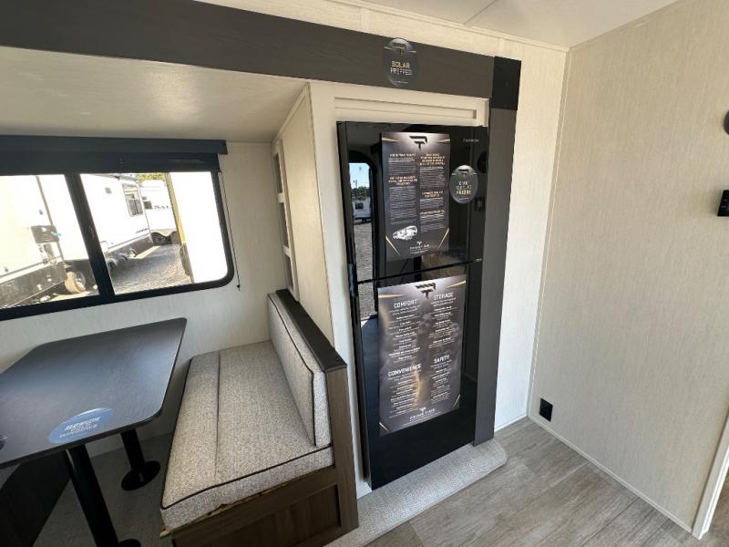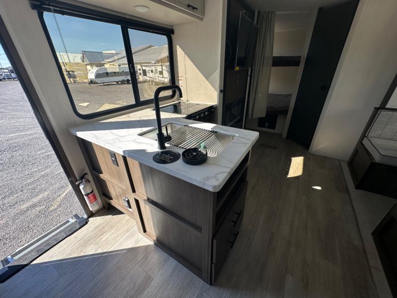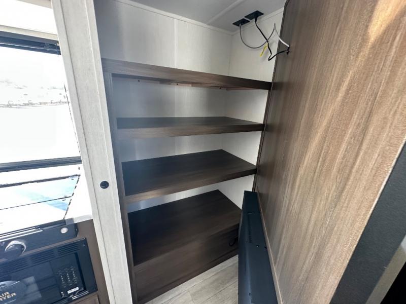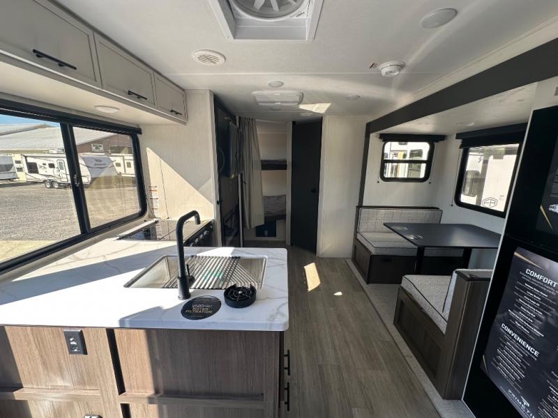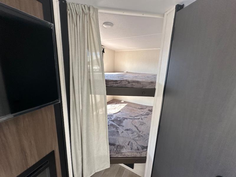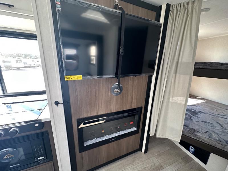 You'll appreciate the added sleeping space in this unit with double-size bunks! You'll have your own space up front in the private bedroom, complete with a camp king bed and storage for your things, and if you need even more sleeping space, the dinette can be used as well. The chef of your group will find a three-burner cooktop and a built-in convection microwave with an air fryer to cook meals, plus there is a 12V refrigerator and large hidden pantry for food storage. This unit also includes a power awning outdoors and an outside refrigerator to keep cold drinks close by.