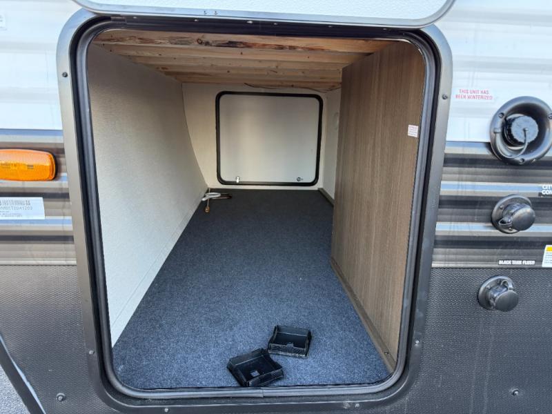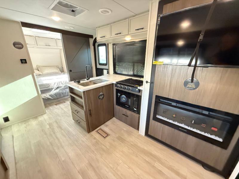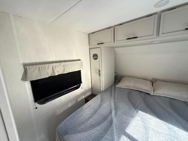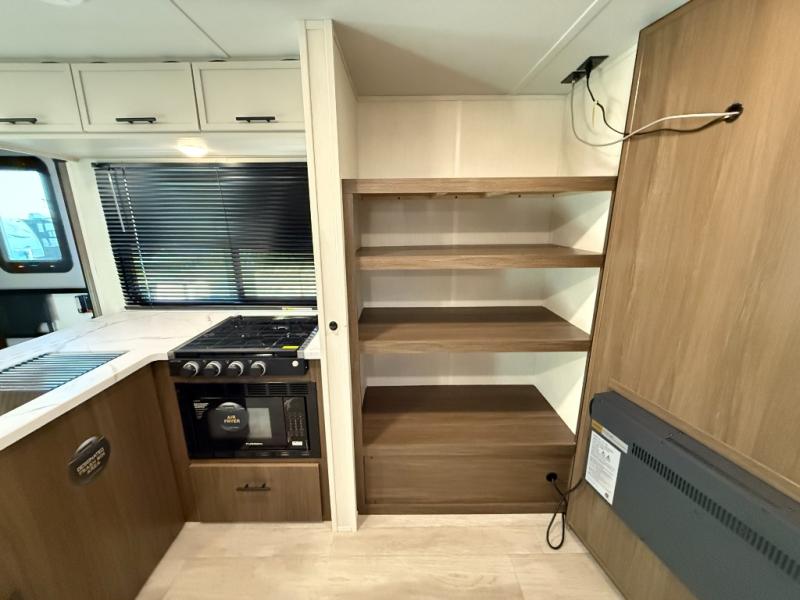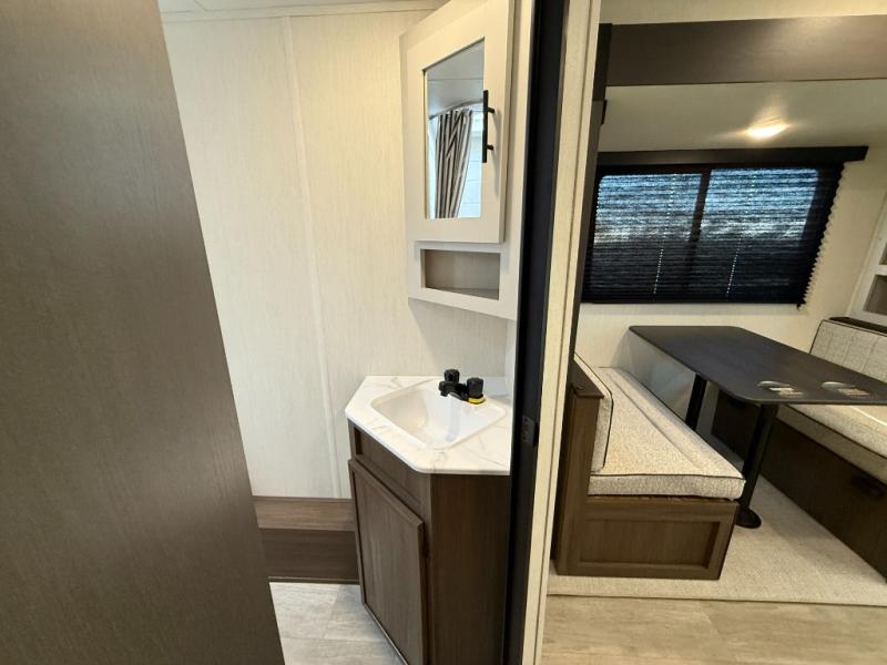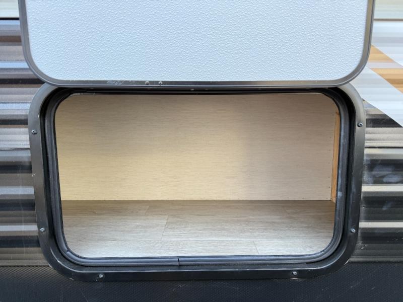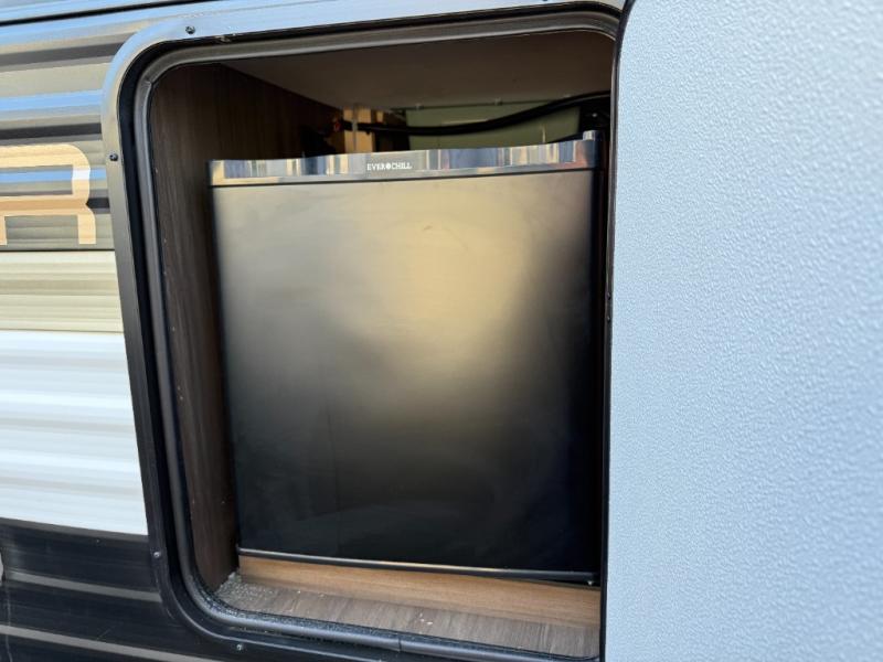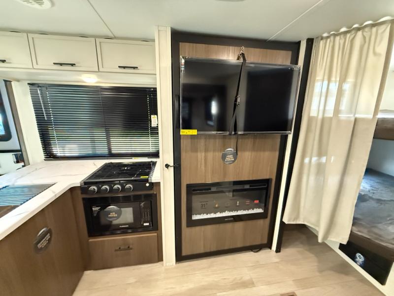 You'll appreciate the added sleeping space in this unit with double-size bunks! You'll have your own space up front in the private bedroom, complete with a camp king bed and storage for your things, and if you need even more sleeping space, the dinette can be used as well. The chef of your group will find a three-burner cooktop and a built-in convection microwave with an air fryer to cook meals, plus there is a 12V refrigerator and large hidden pantry for food storage. This unit also includes a power awning outdoors and an outside refrigerator to keep cold drinks close by.