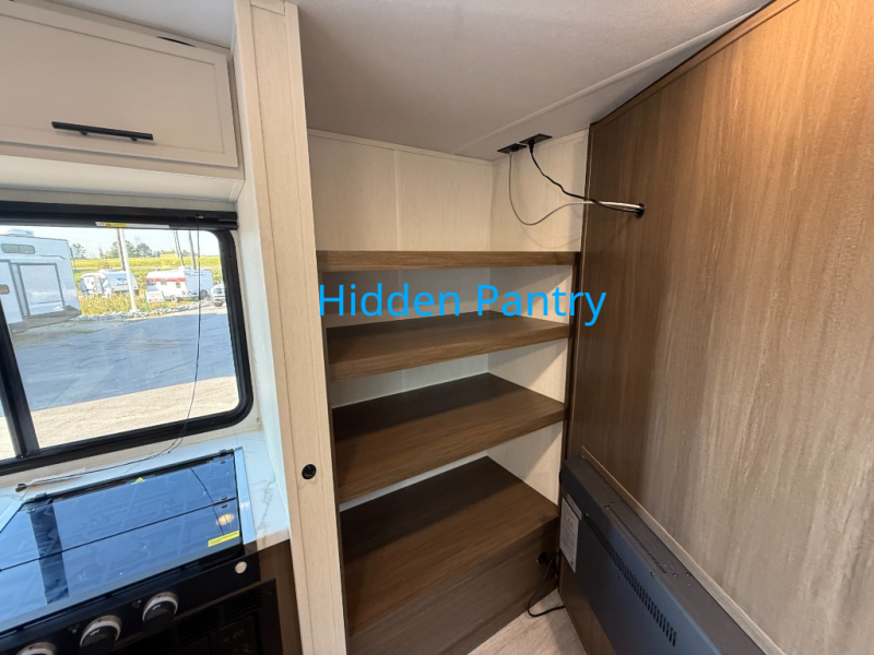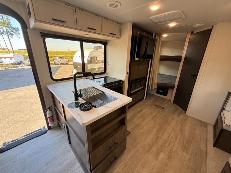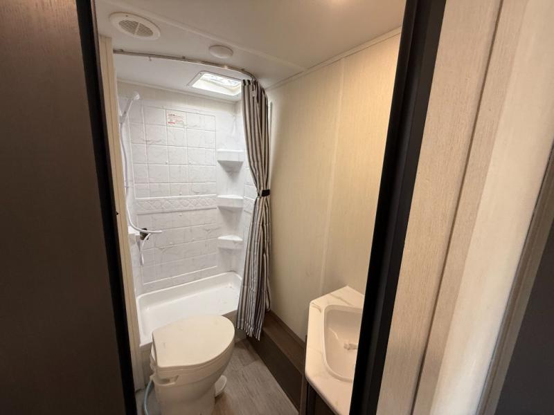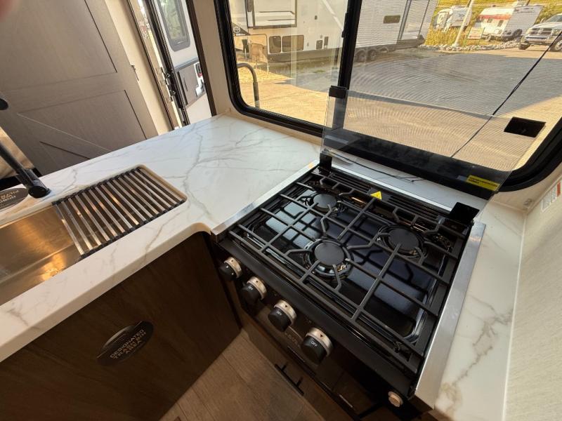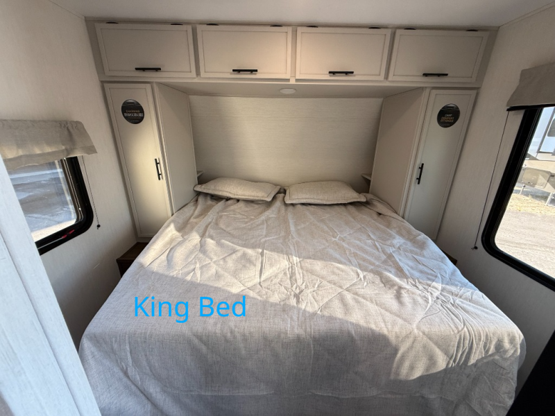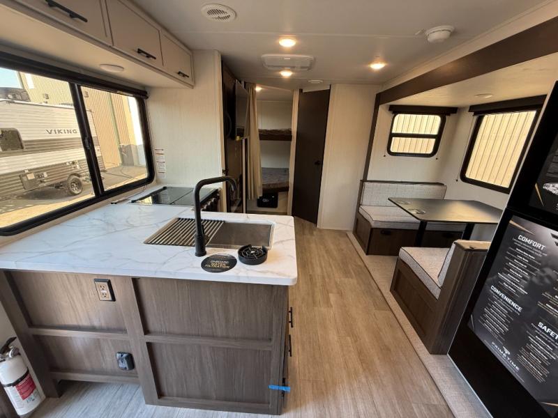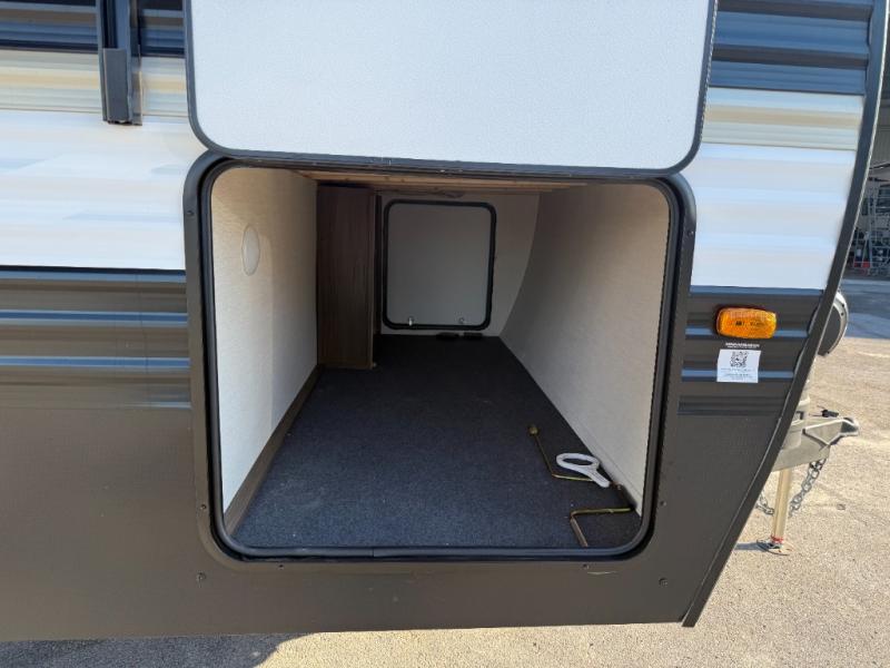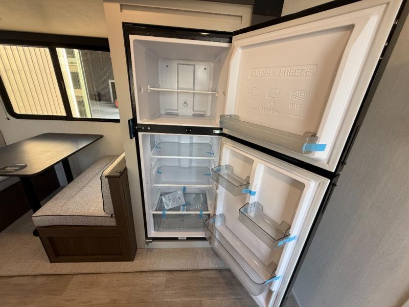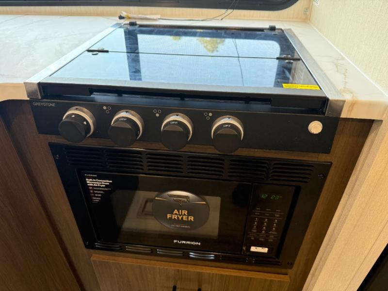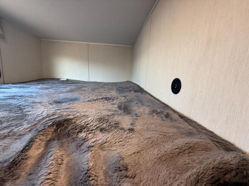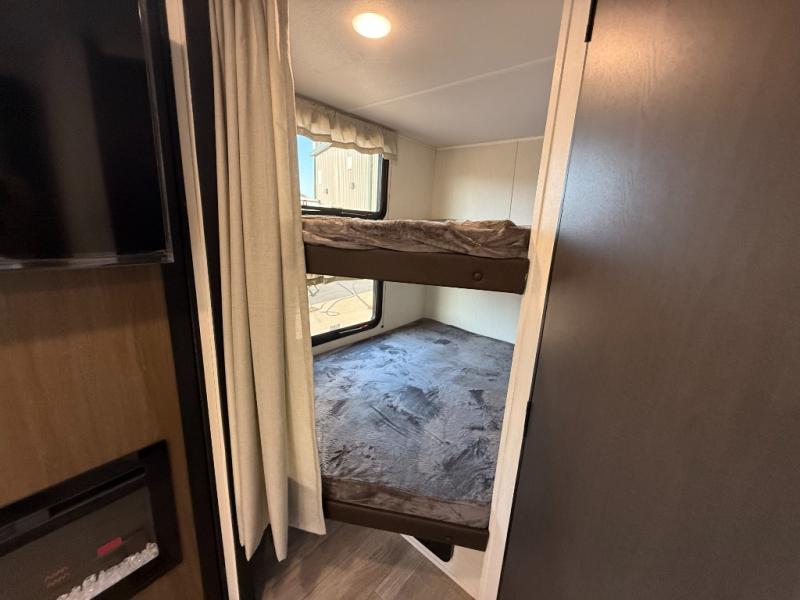 You'll appreciate the added sleeping space in this unit with double-size bunks! You'll have your own space up front in the private bedroom, complete with a camp king bed and storage for your things, and if you need even more sleeping space, the dinette can be used as well. The chef of your group will find a three-burner cooktop and a built-in convection microwave with an air fryer to cook meals, plus there is a 12V refrigerator and large hidden pantry for food storage. This unit also includes a power awning outdoors and an outside refrigerator to keep cold drinks close by.