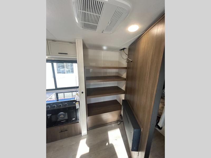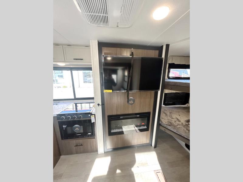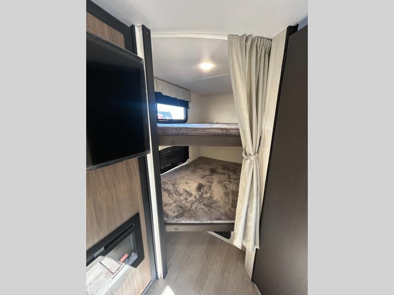 You'll appreciate the added sleeping space in this unit with double-size bunks! You'll have your own space up front in the private bedroom, complete with a camp king bed and storage for your things, and if you need even more sleeping space, the dinette can be used as well. The chef of your group will find a three-burner cooktop and a built-in convection microwave with an air fryer to cook meals, plus there is a 12V refrigerator and large hidden pantry for food storage. This unit also includes a power awning outdoors and an outside refrigerator to keep cold drinks close by.