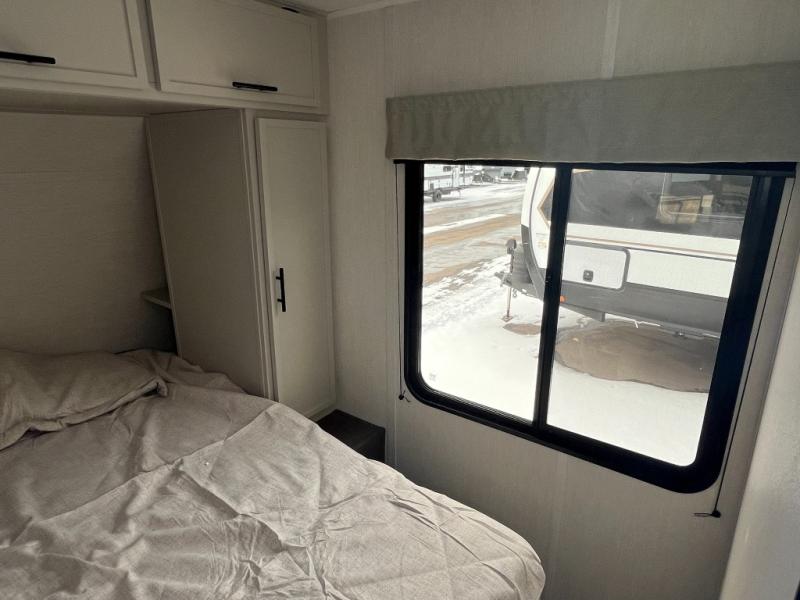 You'll appreciate the added sleeping space in this unit with double-size bunks! You'll have your own space up front in the private bedroom, complete with a camp king bed and storage for your things, and if you need even more sleeping space, the dinette can be used as well. The chef of your group will find a three-burner cooktop and a built-in convection microwave with an air fryer to cook meals, plus there is a 12V refrigerator and large hidden pantry for food storage. This unit also includes a power awning outdoors and an outside refrigerator to keep cold drinks close by.