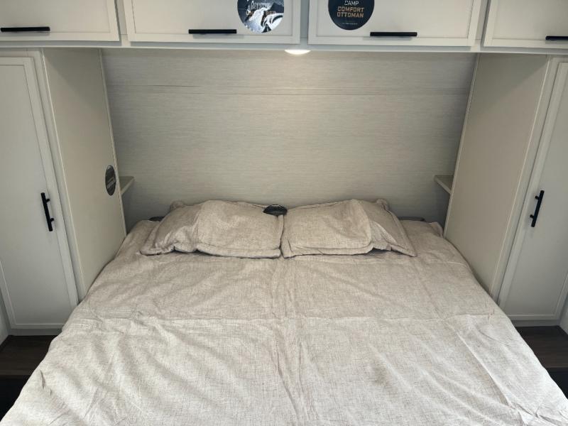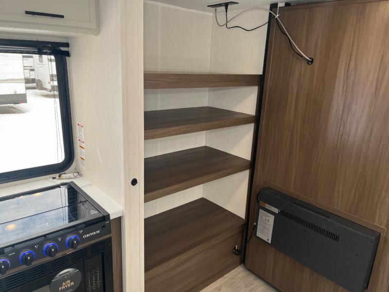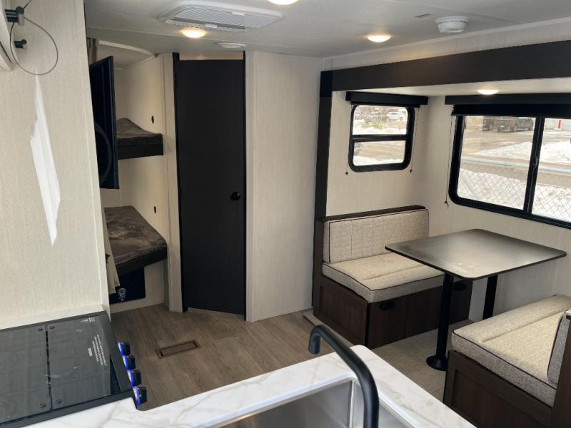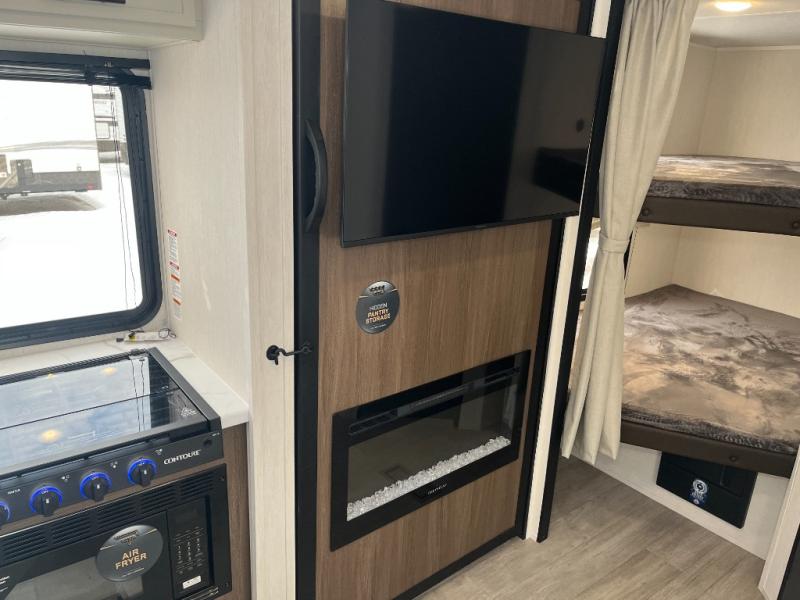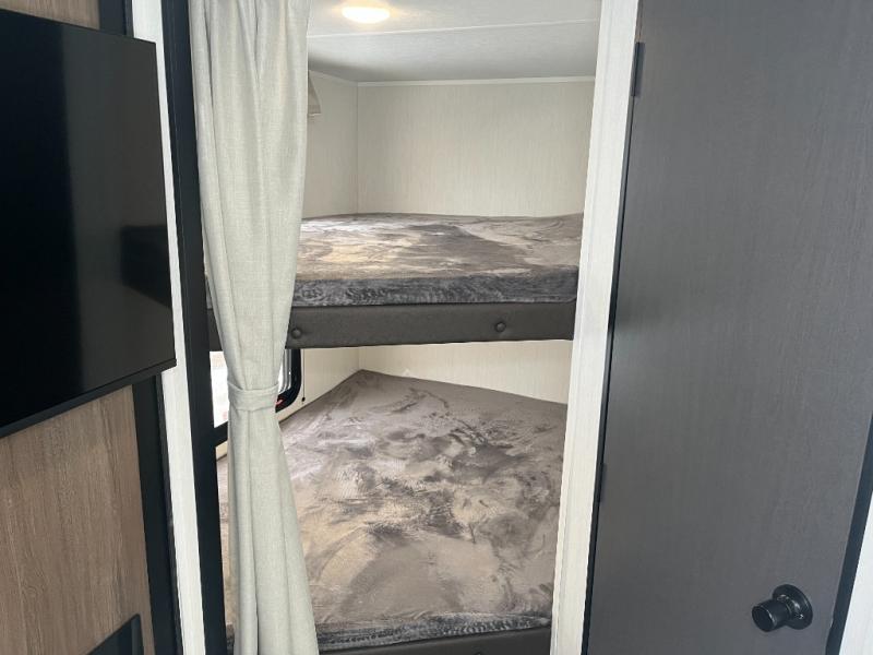You'll appreciate the added sleeping space in this unit with double-size bunks! You'll have your own space up front in the private bedroom, complete with a camp king bed and storage for your things, and if you need even more sleeping space, the dinette can be used as well. The chef of your group will find a three-burner cooktop and a built-in convection microwave with an air fryer to cook meals, plus there is a 12V refrigerator and large hidden pantry for food storage. This unit also includes a power awning outdoors and an outside refrigerator to keep cold drinks close by.