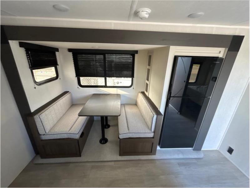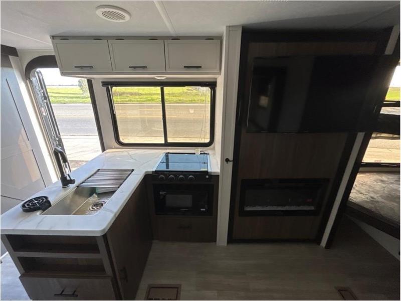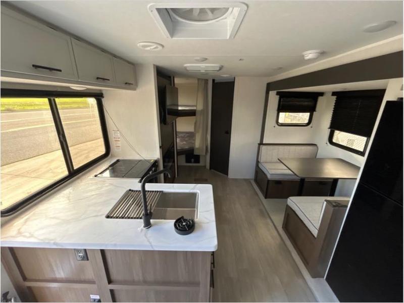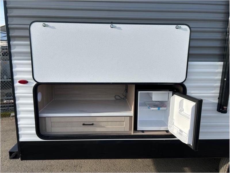 You'll appreciate the added sleeping space in this unit with double-size bunks! You'll have your own space up front in the private bedroom, complete with a camp king bed and storage for your things, and if you need even more sleeping space, the dinette can be used as well. The chef of your group will find a three-burner cooktop and a built-in convection microwave with an air fryer to cook meals, plus there is a 12V refrigerator and large hidden pantry for food storage. This unit also includes a power awning outdoors and an outside refrigerator to keep cold drinks close by.