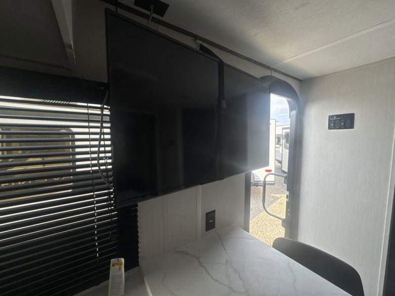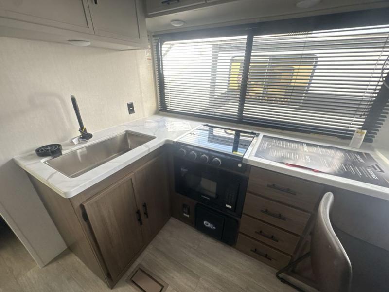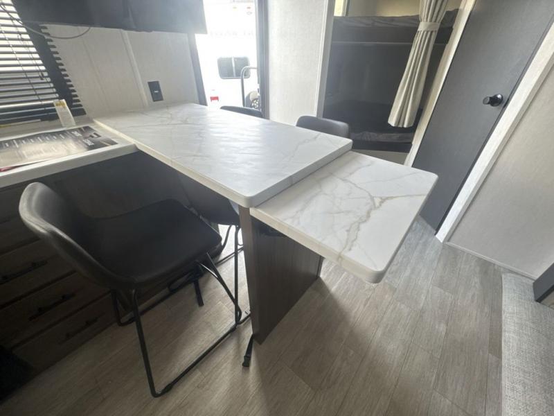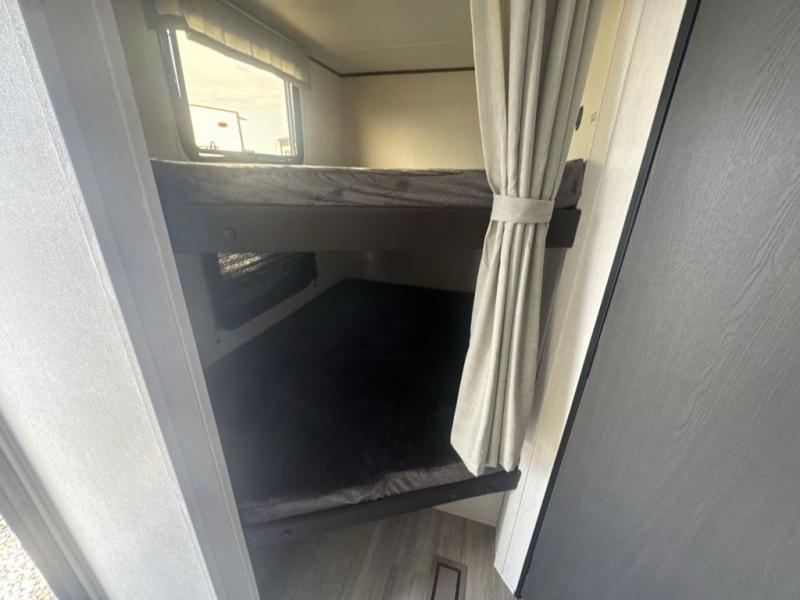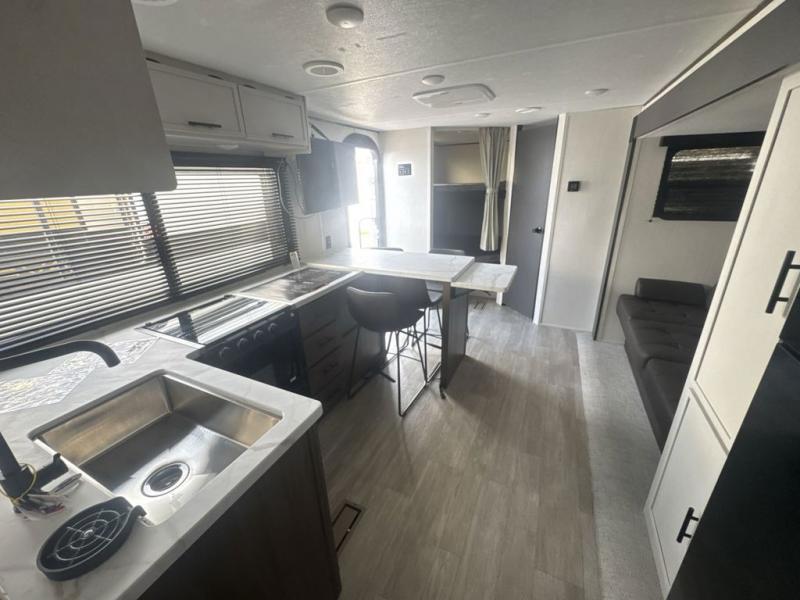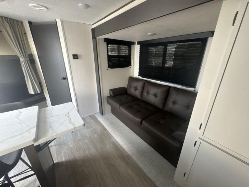 Head to your local state park in this spacious travel trailer! You'll love the oversized windows to let more natural light in, and the sofa slide out will provide more interior space. An L-shaped counter with stools provides a place to enjoy your morning coffee at, or you may find yourselves on the sofa within the slide out. The 12V refrigerator and pantry can hold all your food for the week. You'll feel right at home in the front private bedroom that includes a camp king bed, dual wardrobes, and an overhead cabinet for even more storage, while your guests take the double-size bunks in the back!