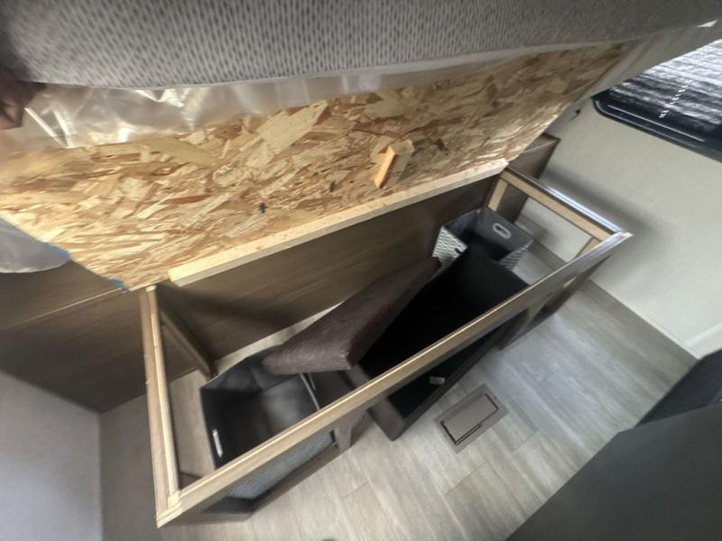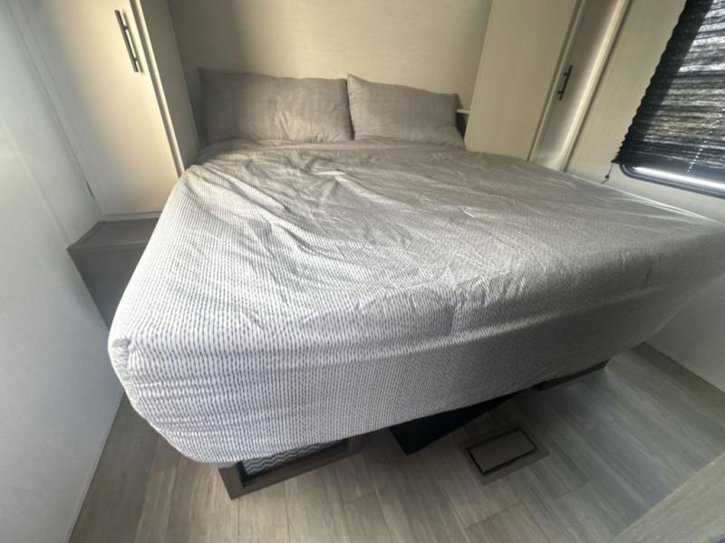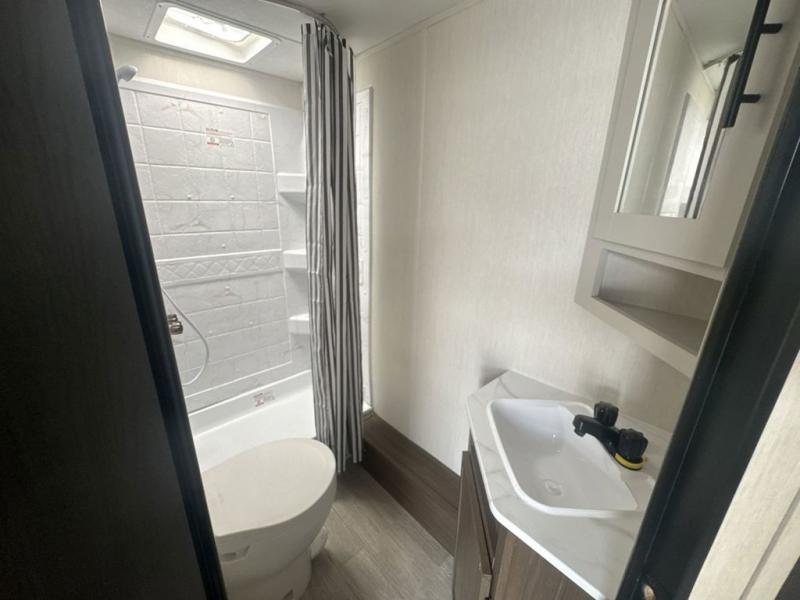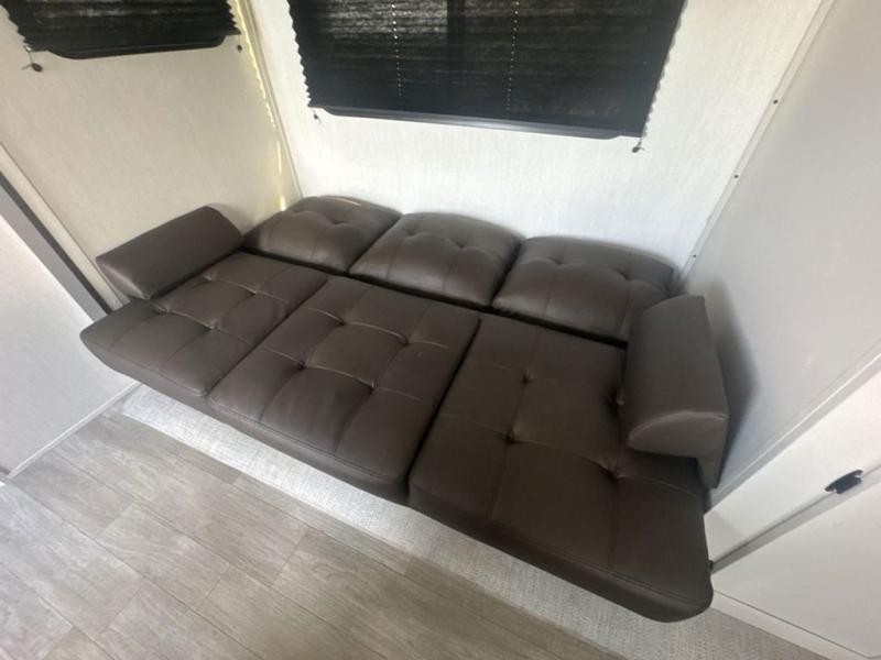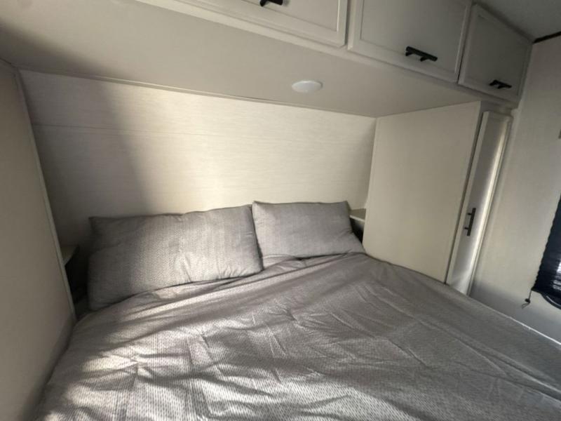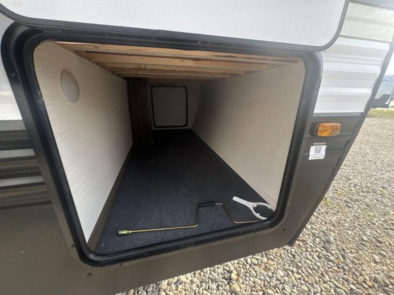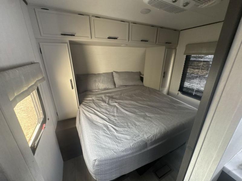 Head to your local state park in this spacious travel trailer! You'll love the oversized windows to let more natural light in, and the sofa slide out will provide more interior space. An L-shaped counter with stools provides a place to enjoy your morning coffee at, or you may find yourselves on the sofa within the slide out. The 12V refrigerator and pantry can hold all your food for the week. You'll feel right at home in the front private bedroom that includes a camp king bed, dual wardrobes, and an overhead cabinet for even more storage, while your guests take the double-size bunks in the back!