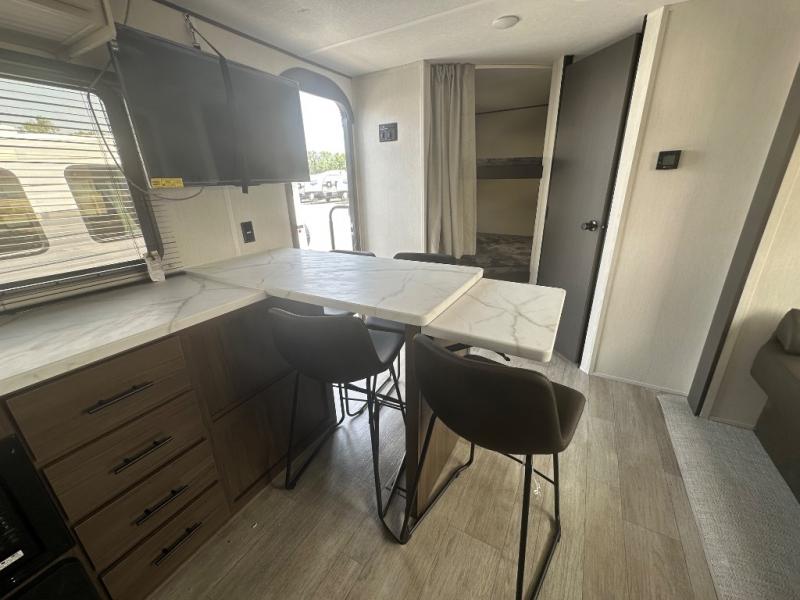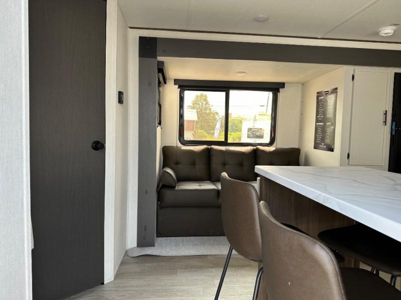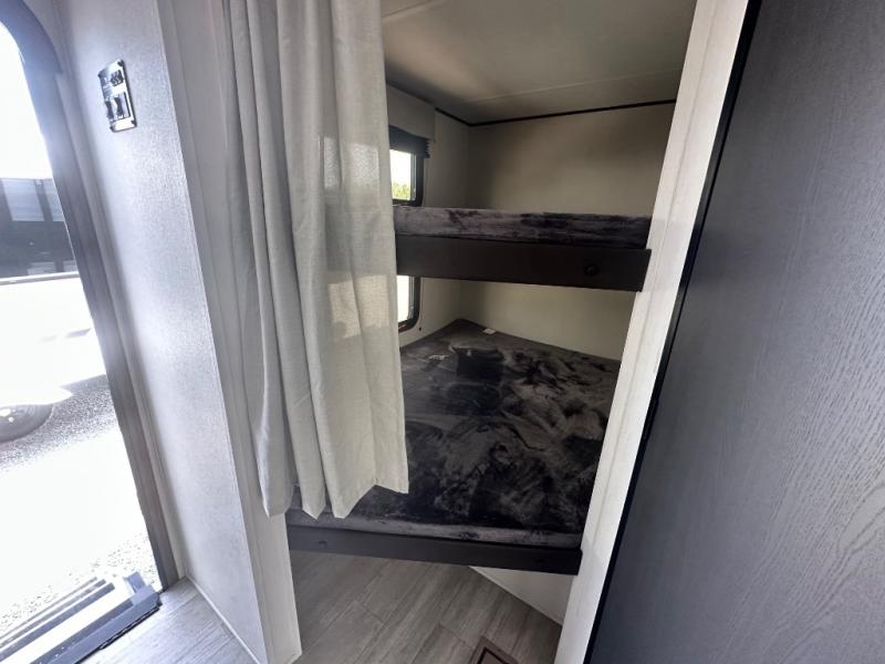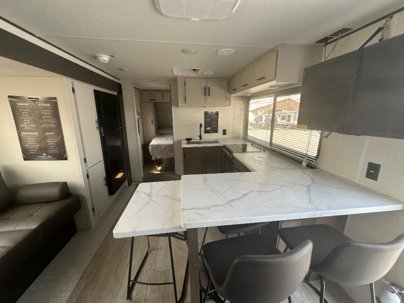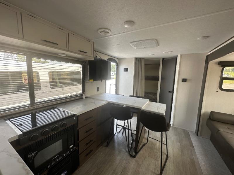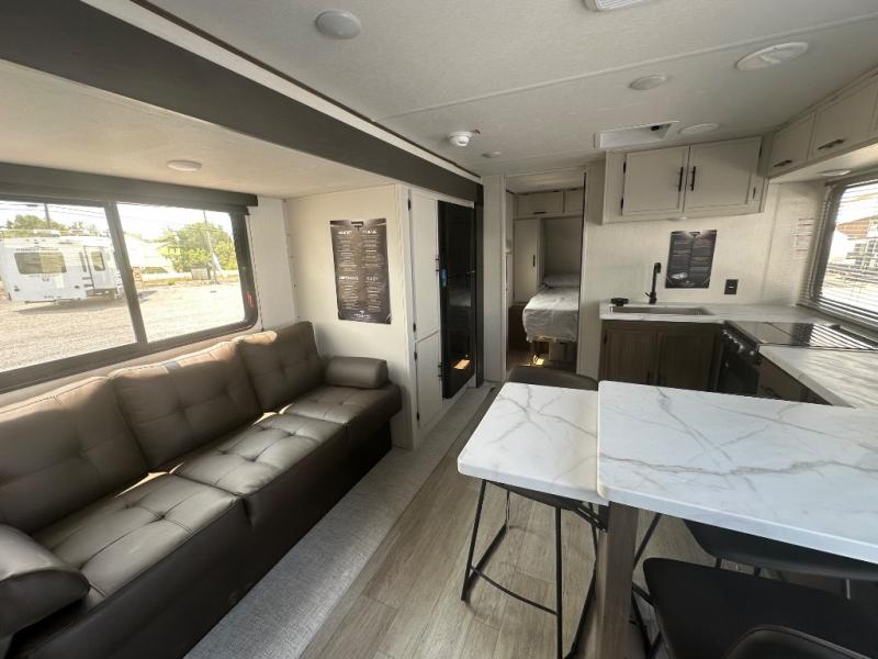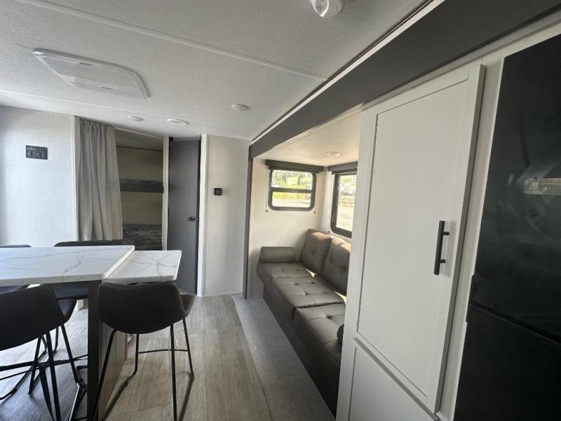 Head to your local state park in this spacious travel trailer! You'll love the oversized windows to let more natural light in, and the sofa slide out will provide more interior space. An L-shaped counter with stools provides a place to enjoy your morning coffee at, or you may find yourselves on the sofa within the slide out. The 12V refrigerator and pantry can hold all your food for the week. You'll feel right at home in the front private bedroom that includes a camp king bed, dual wardrobes, and an overhead cabinet for even more storage, while your guests take the double-size bunks in the back!