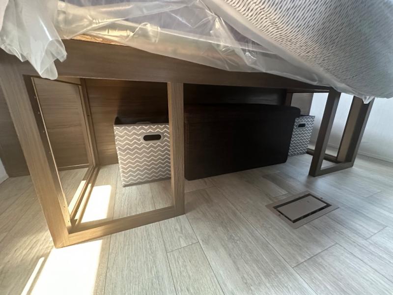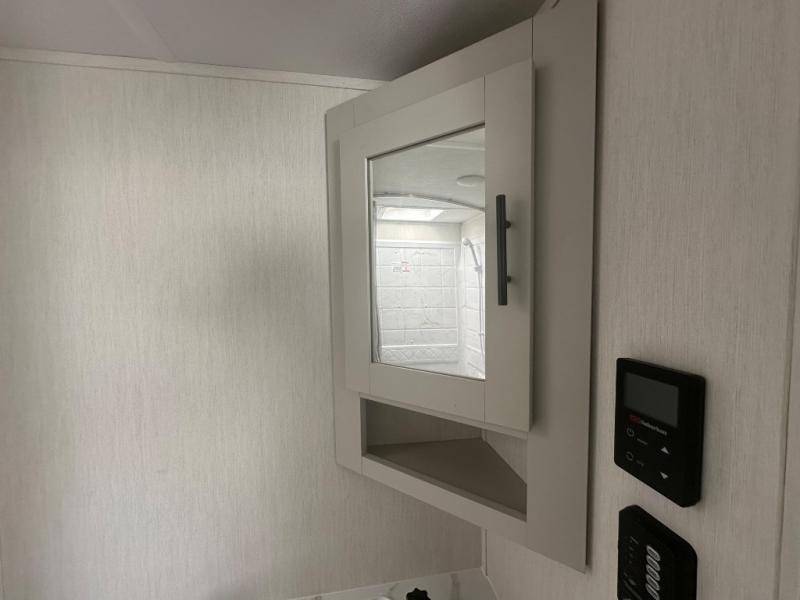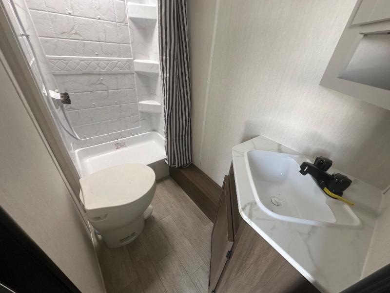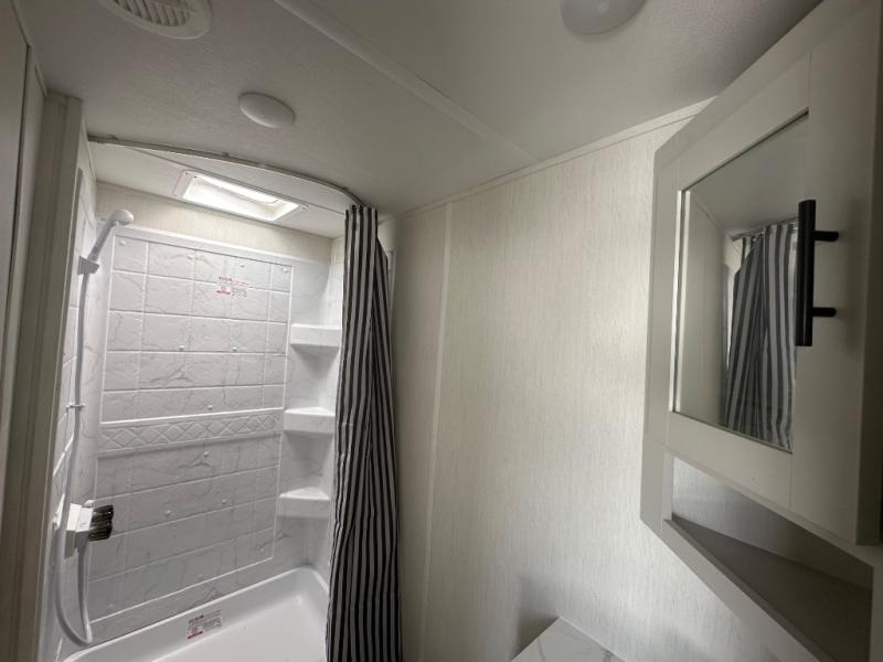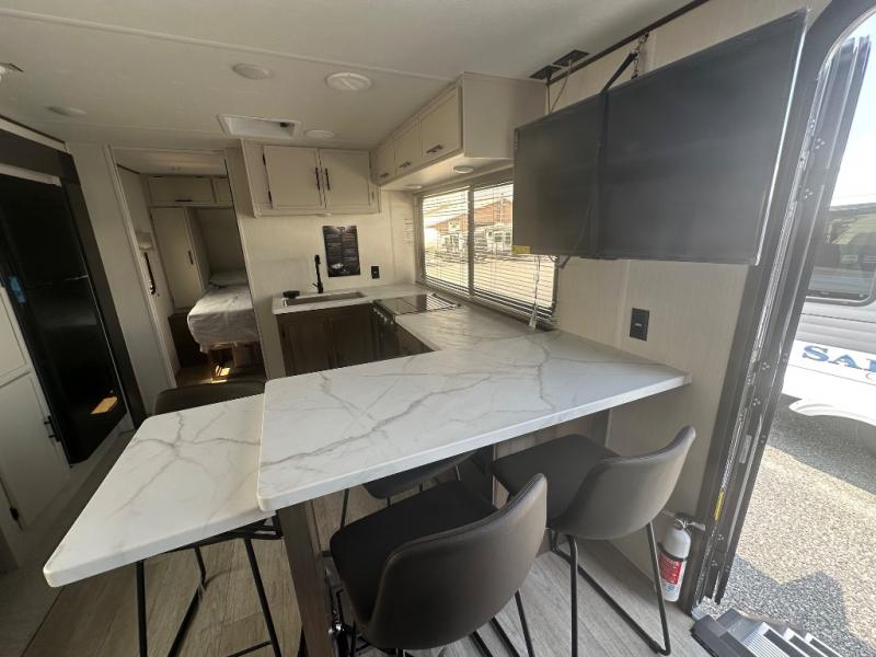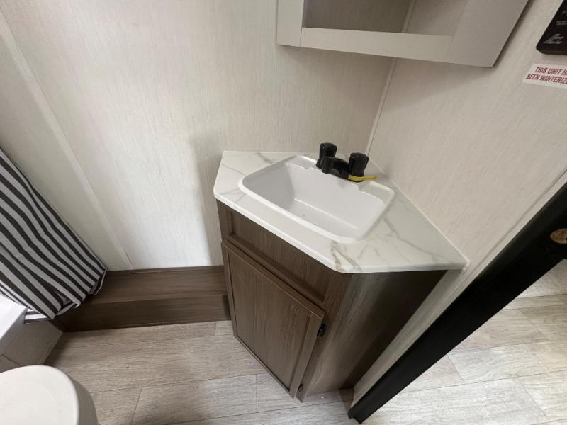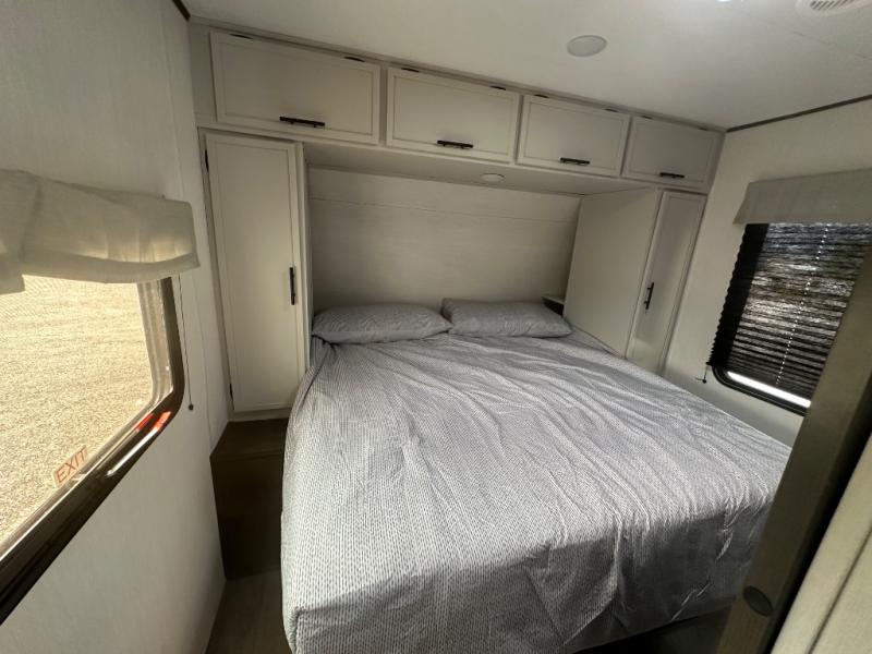 Head to your local state park in this spacious travel trailer! You'll love the oversized windows to let more natural light in, and the sofa slide out will provide more interior space. An L-shaped counter with stools provides a place to enjoy your morning coffee at, or you may find yourselves on the sofa within the slide out. The 12V refrigerator and pantry can hold all your food for the week. You'll feel right at home in the front private bedroom that includes a camp king bed, dual wardrobes, and an overhead cabinet for even more storage, while your guests take the double-size bunks in the back!