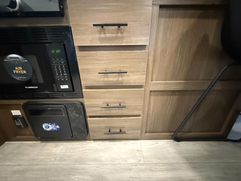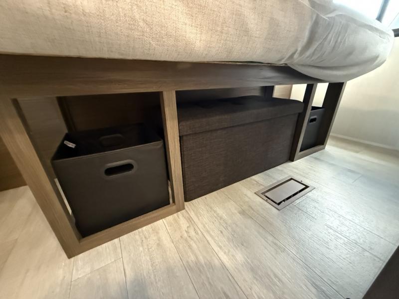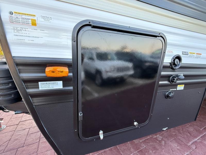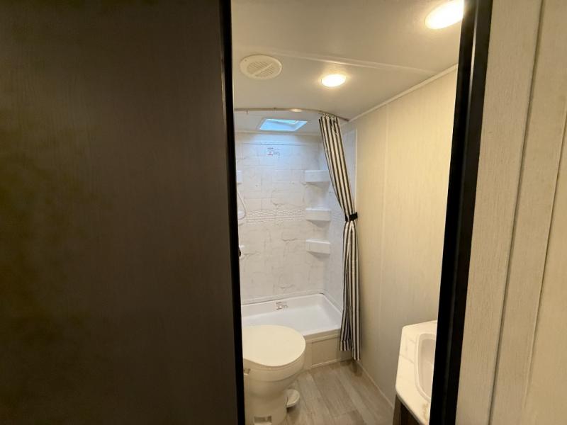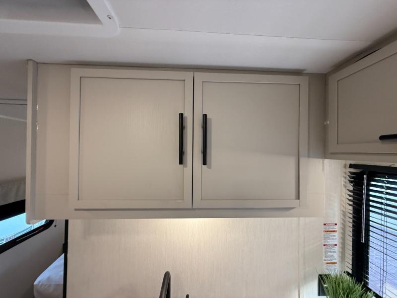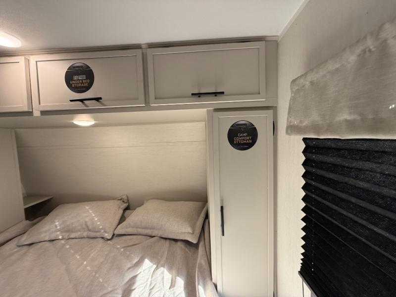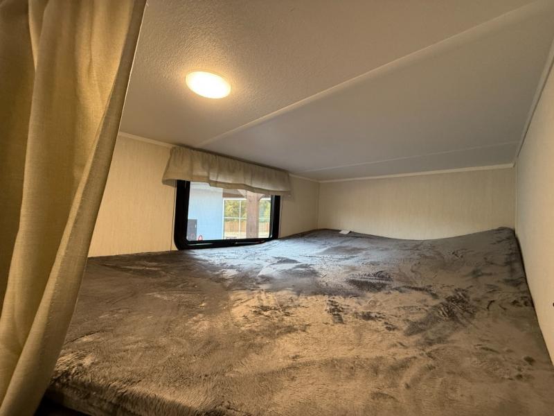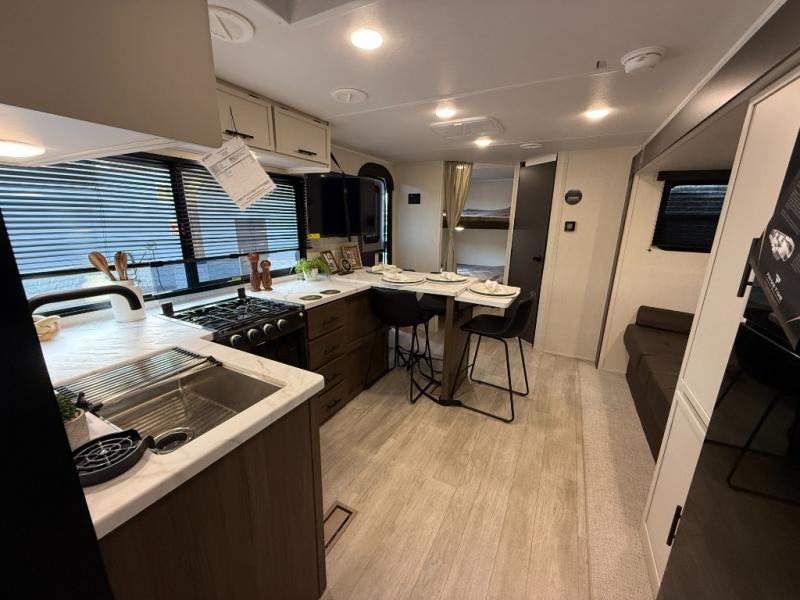 Head to your local state park in this spacious travel trailer! You'll love the oversized windows to let more natural light in, and the sofa slide out will provide more interior space. An L-shaped counter with stools provides a place to enjoy your morning coffee at, or you may find yourselves on the sofa within the slide out. The 12V refrigerator and pantry can hold all your food for the week. You'll feel right at home in the front private bedroom that includes a camp king bed, dual wardrobes, and an overhead cabinet for even more storage, while your guests take the double-size bunks in the back!