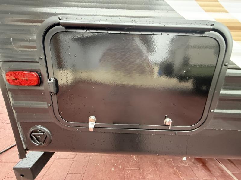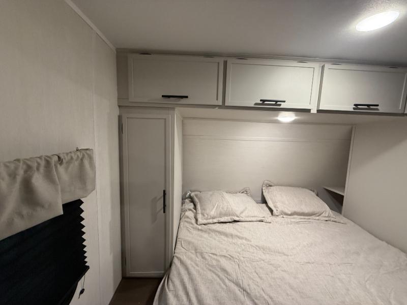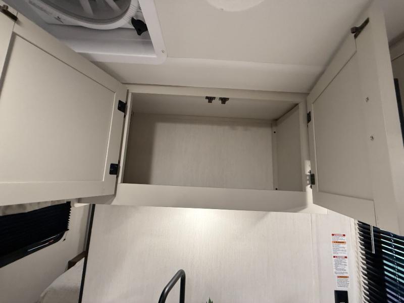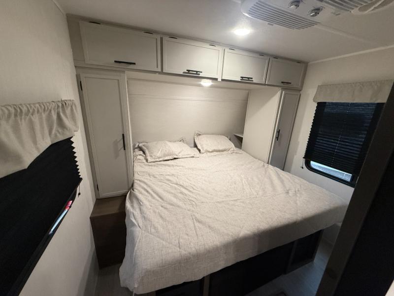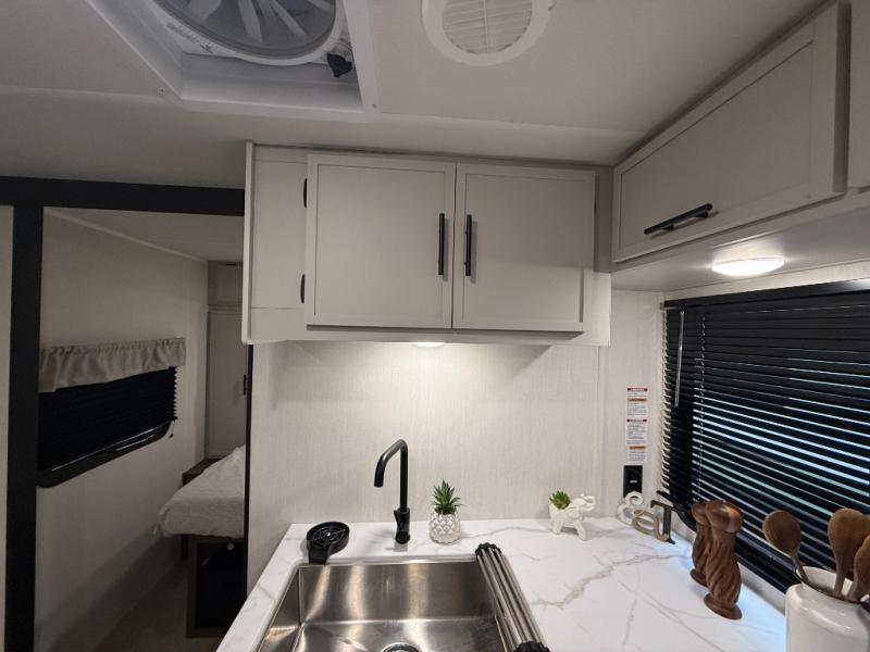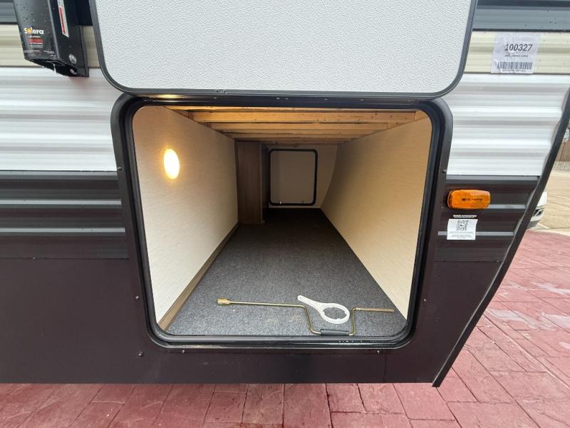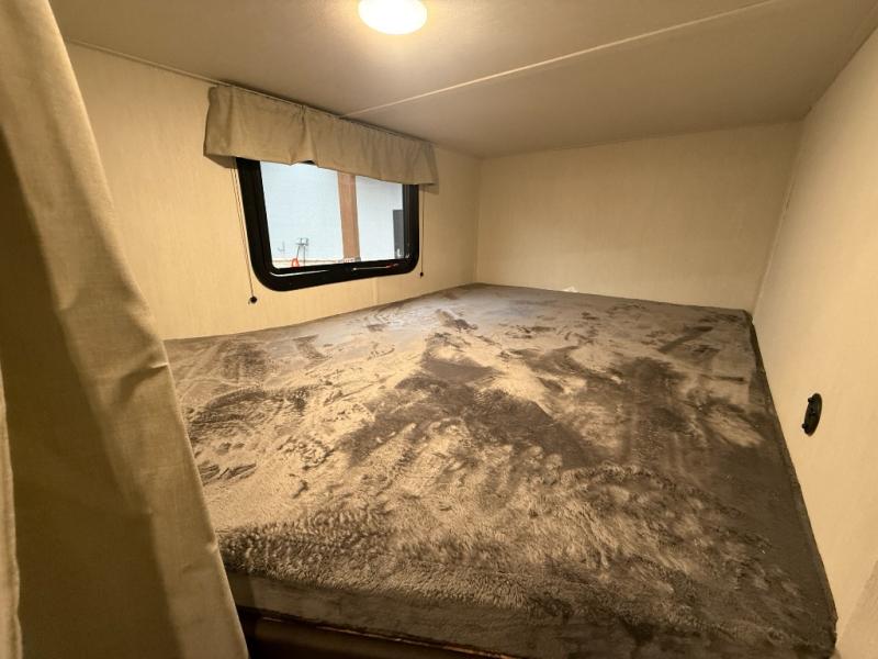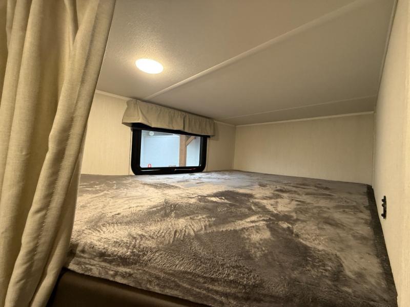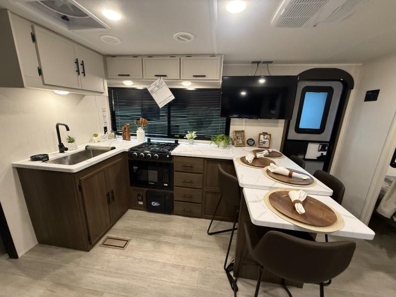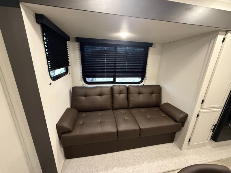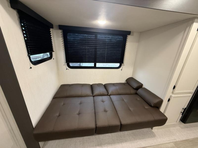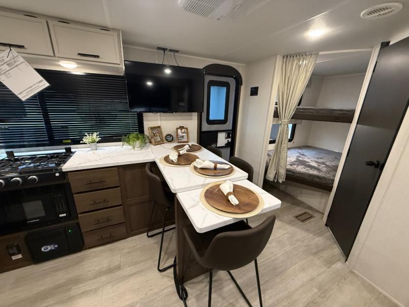 Head to your local state park in this spacious travel trailer! You'll love the oversized windows to let more natural light in, and the sofa slide out will provide more interior space. An L-shaped counter with stools provides a place to enjoy your morning coffee at, or you may find yourselves on the sofa within the slide out. The 12V refrigerator and pantry can hold all your food for the week. You'll feel right at home in the front private bedroom that includes a camp king bed, dual wardrobes, and an overhead cabinet for even more storage, while your guests take the double-size bunks in the back!