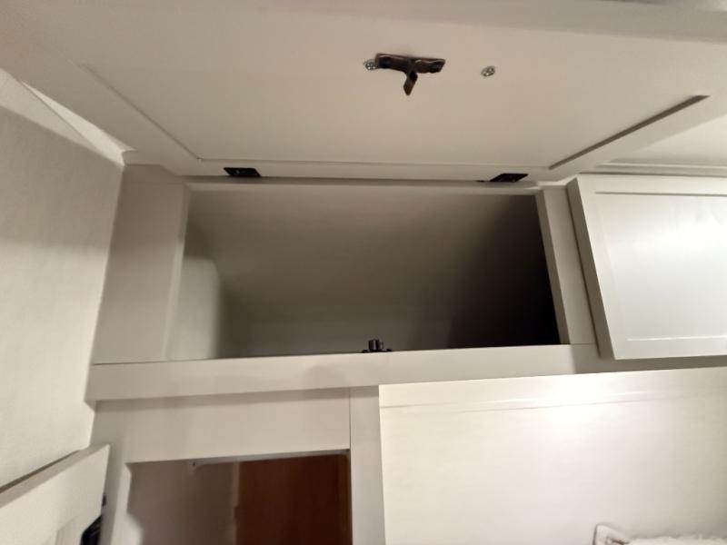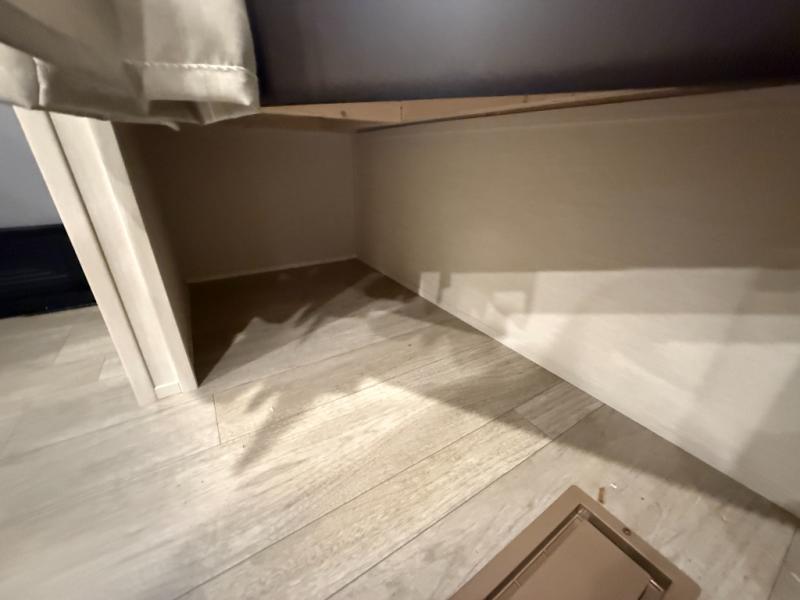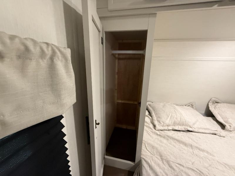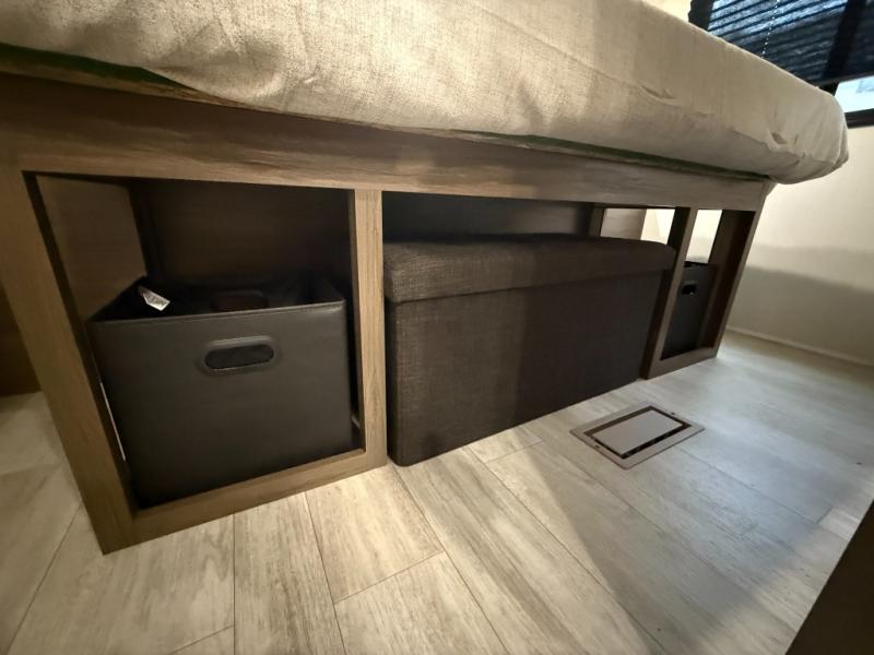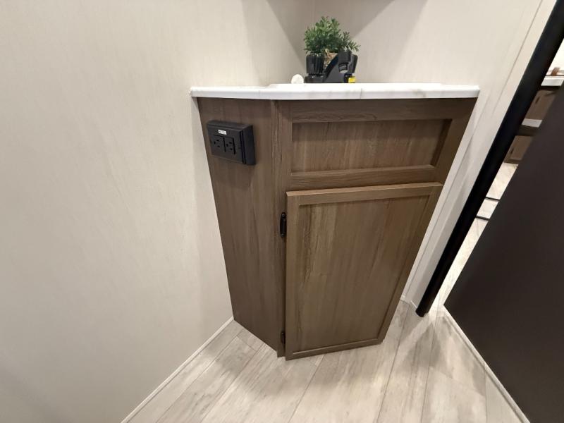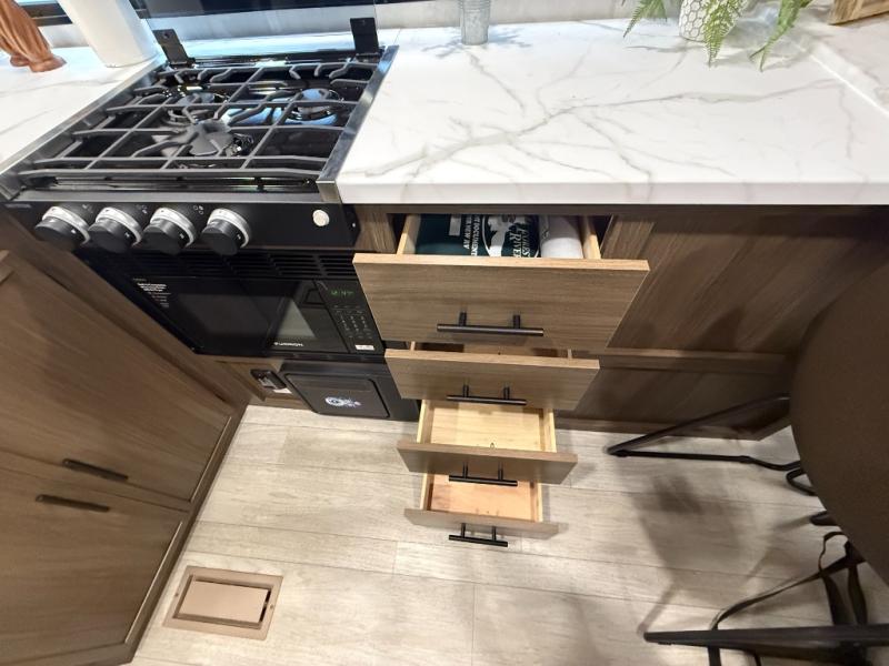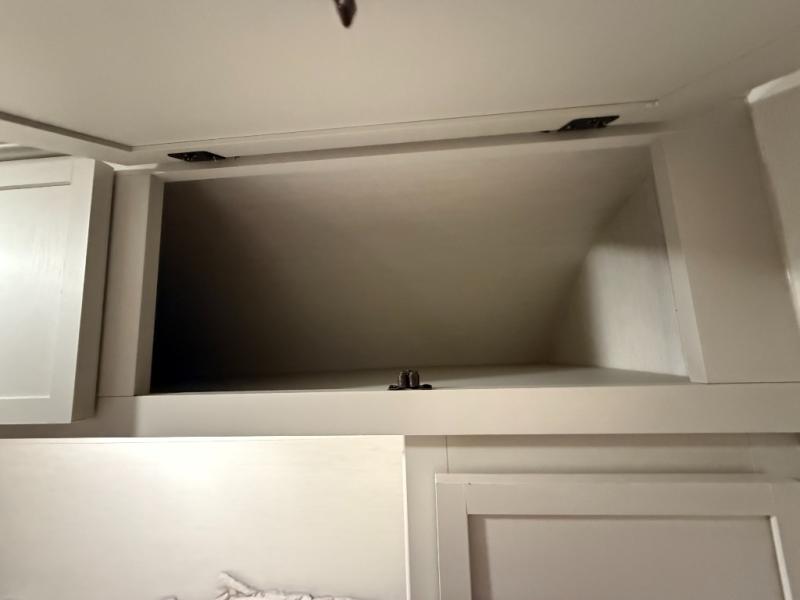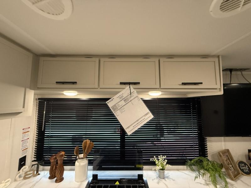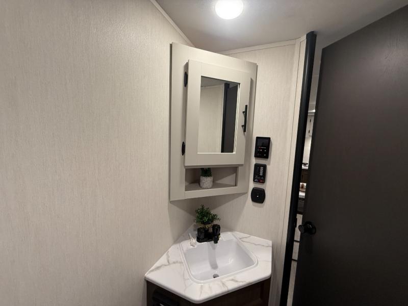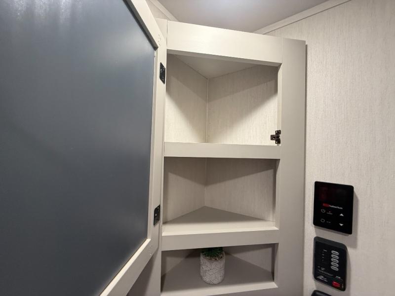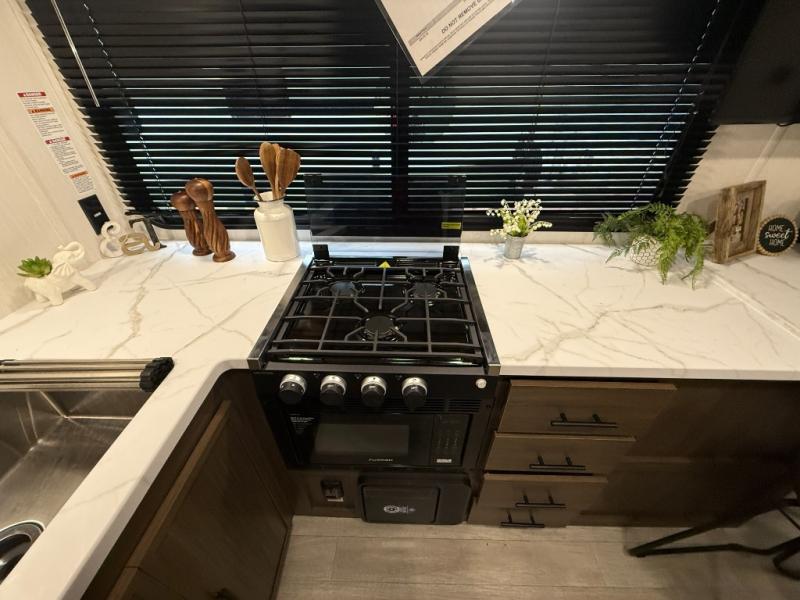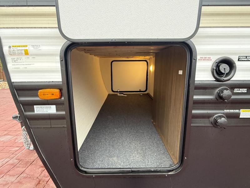Head to your local state park in this spacious travel trailer! You'll love the oversized windows to let more natural light in, and the sofa slide out will provide more interior space. An L-shaped counter with stools provides a place to enjoy your morning coffee at, or you may find yourselves on the sofa within the slide out. The 12V refrigerator and pantry can hold all your food for the week. You'll feel right at home in the front private bedroom that includes a camp king bed, dual wardrobes, and an overhead cabinet for even more storage, while your guests take the double-size bunks in the back!