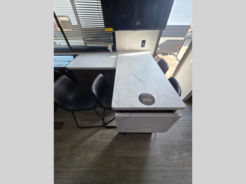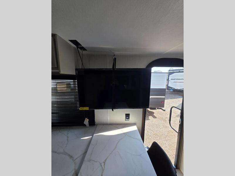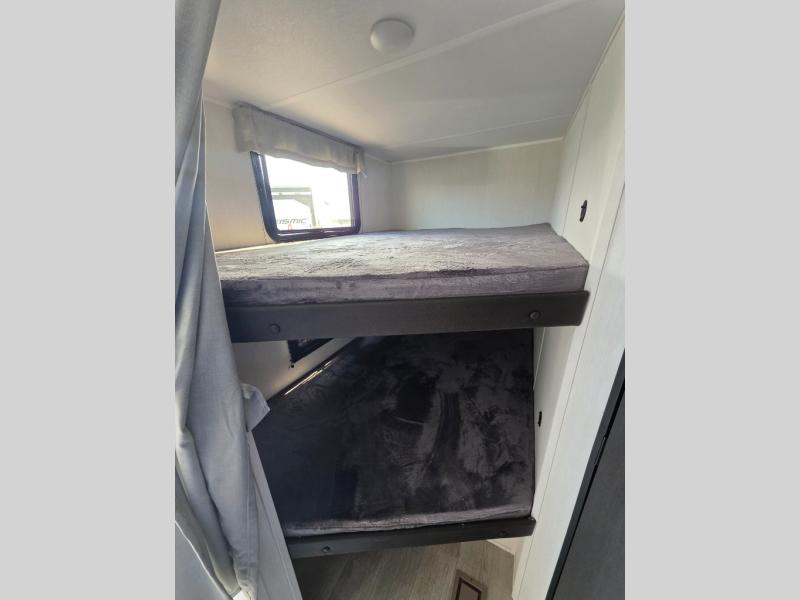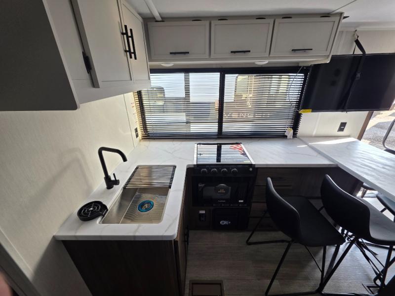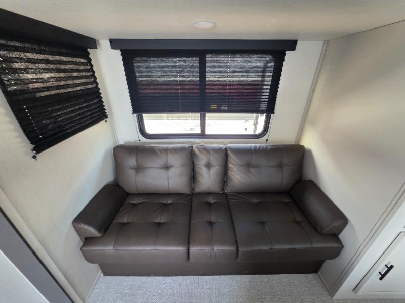 Head to your local state park in this spacious travel trailer! You'll love the oversized windows to let more natural light in, and the sofa slide out will provide more interior space. An L-shaped counter with stools provides a place to enjoy your morning coffee at, or you may find yourselves on the sofa within the slide out. The 12V refrigerator and pantry can hold all your food for the week. You'll feel right at home in the front private bedroom that includes a camp king bed, dual wardrobes, and an overhead cabinet for even more storage, while your guests take the double-size bunks in the back!