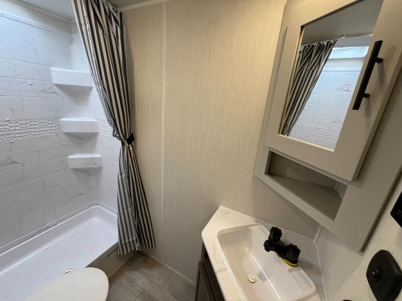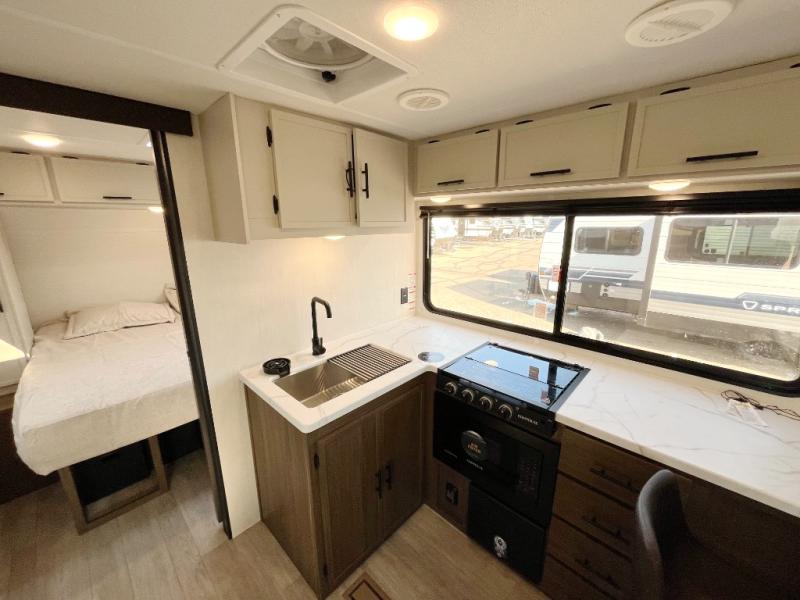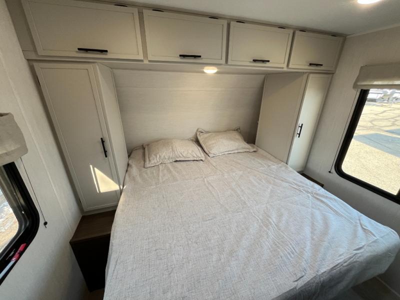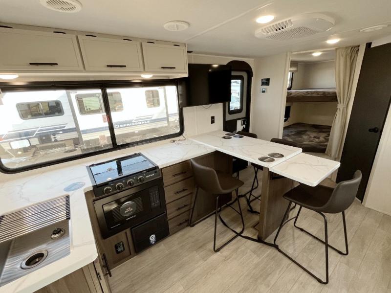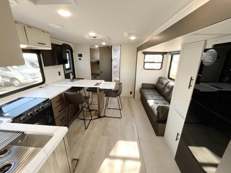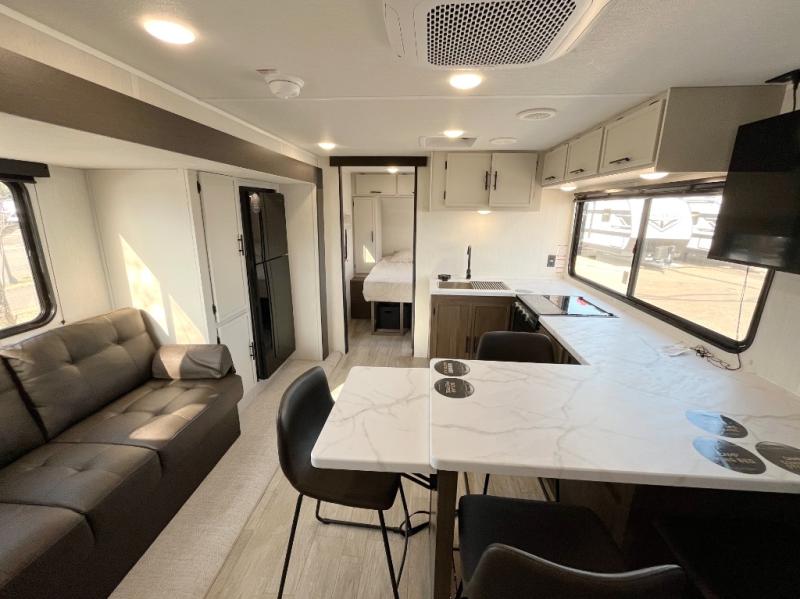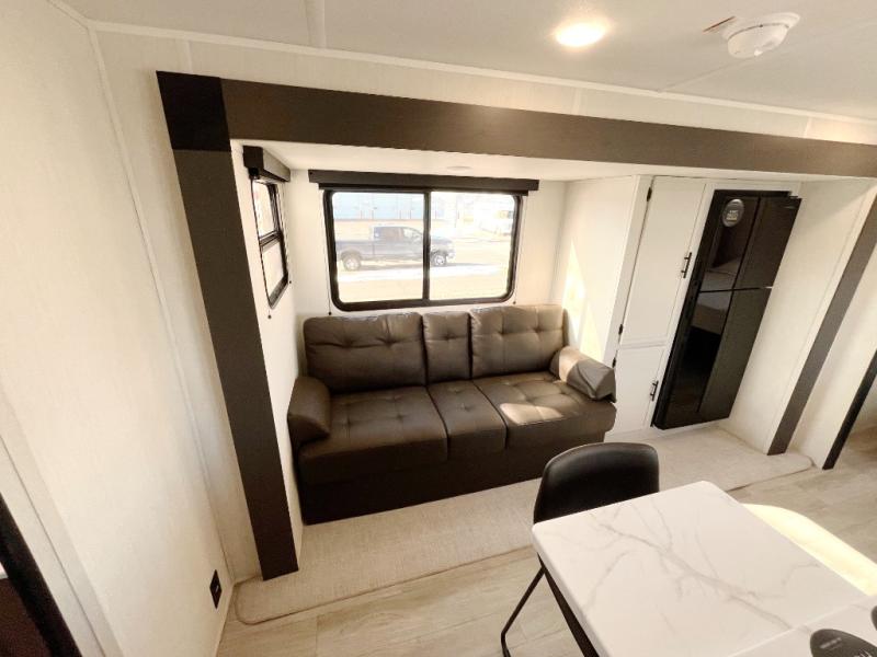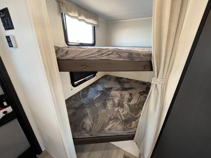 Head to your local state park in this spacious travel trailer! You'll love the oversized windows to let more natural light in, and the sofa slide out will provide more interior space. An L-shaped counter with stools provides a place to enjoy your morning coffee at, or you may find yourselves on the sofa within the slide out. The 12V refrigerator and pantry can hold all your food for the week. You'll feel right at home in the front private bedroom that includes a camp king bed, dual wardrobes, and an overhead cabinet for even more storage, while your guests take the double-size bunks in the back!