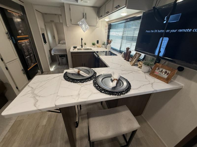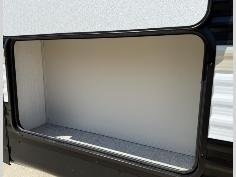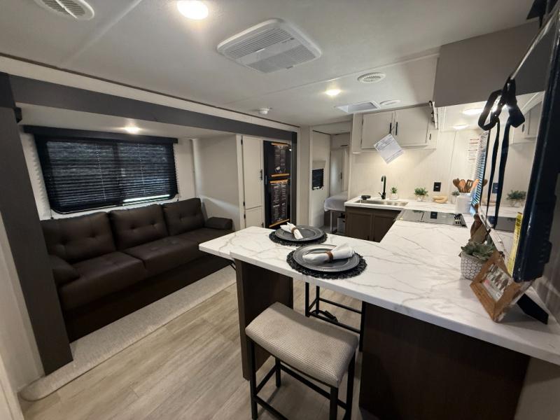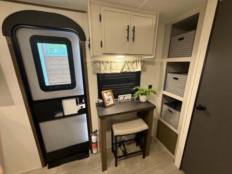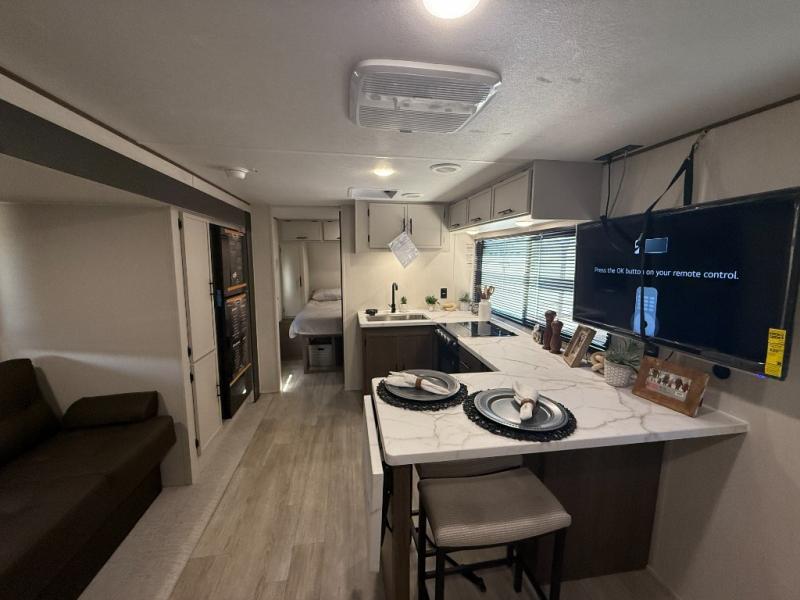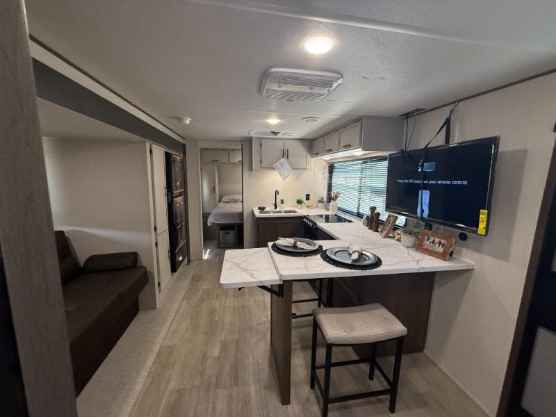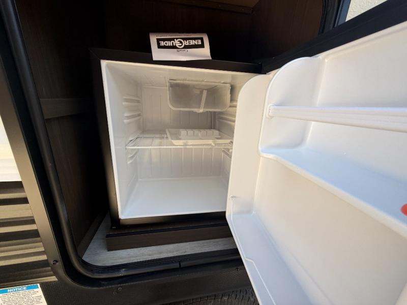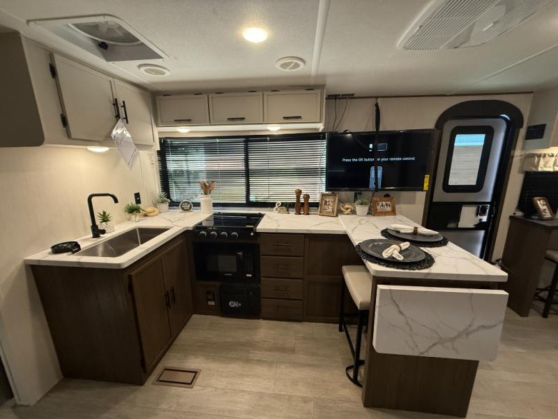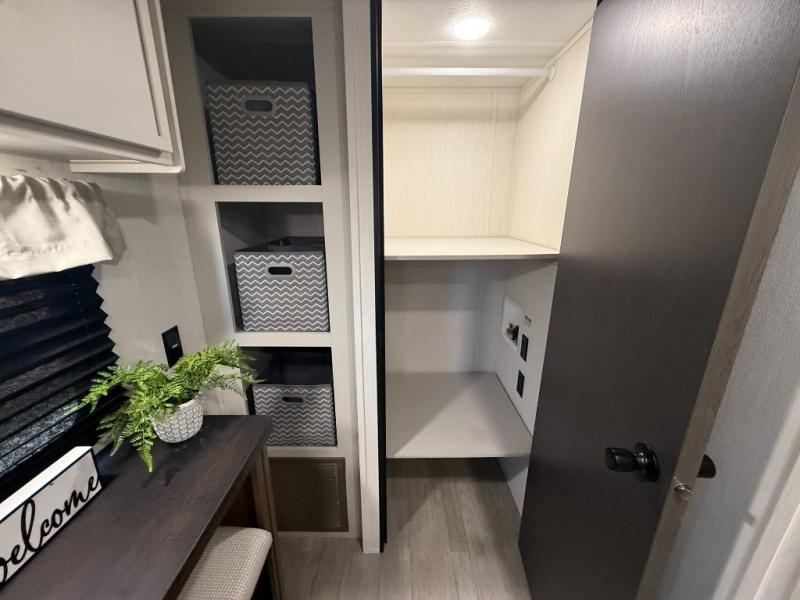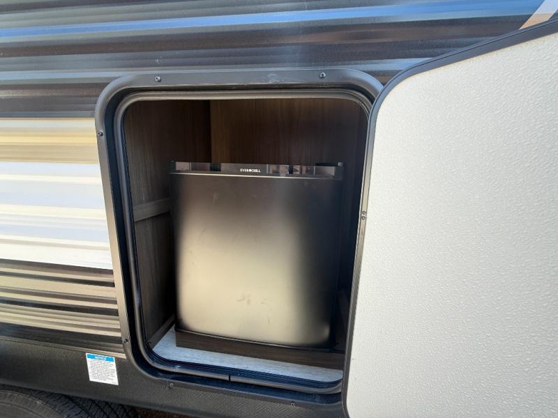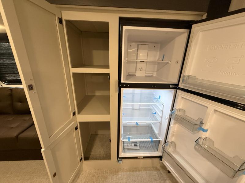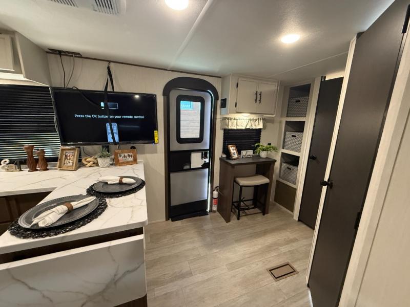 Head to your local state park in this spacious travel trailer! Once you arrive at the campground, you can grab a cold drink from the exterior refrigerator, then head inside to make lunch. An L-shaped counter with two chairs provides a place to enjoy your morning coffee at, or you may find yourselves on the theater seat within the large slide out. The French door refrigerator and pantry is also found here and can hold all your food for the week. You'll feel right at home in the front private bedroom that includes a queen bed, dual wardrobes, and an overhead cabinet for even more storage. This model also includes washer and dryer prep if you choose to add those appliances!
