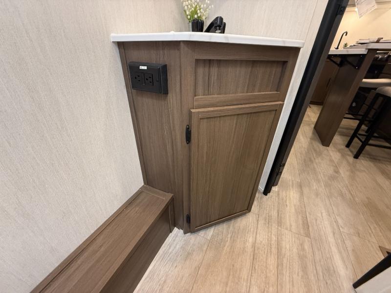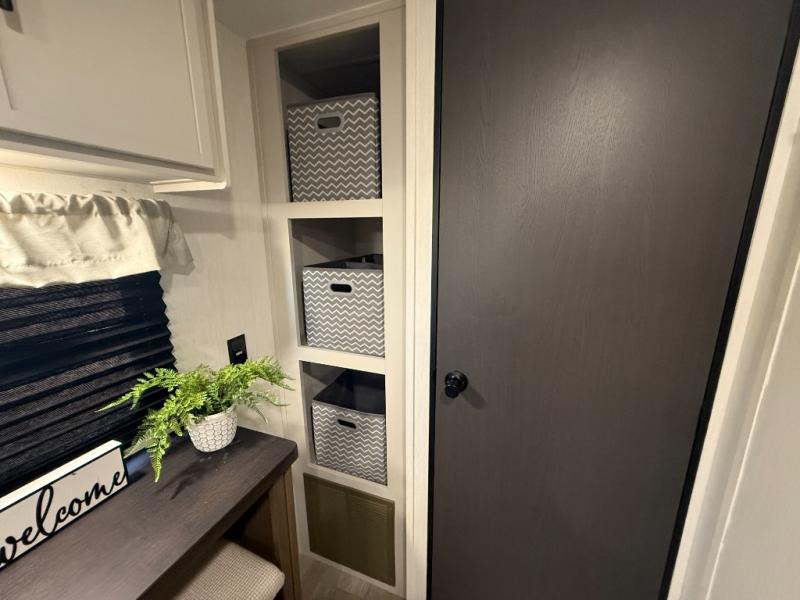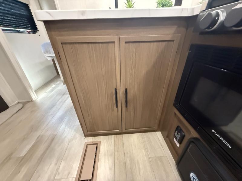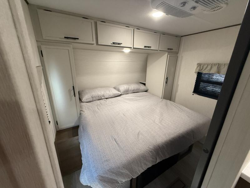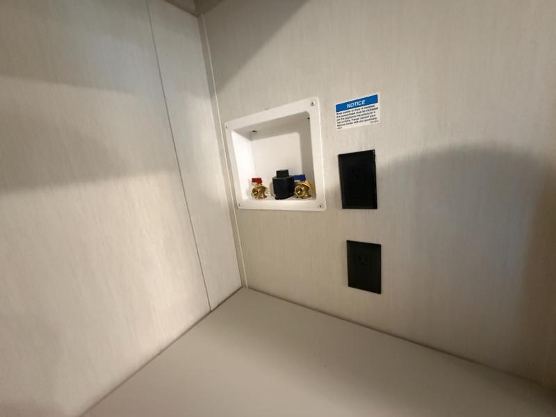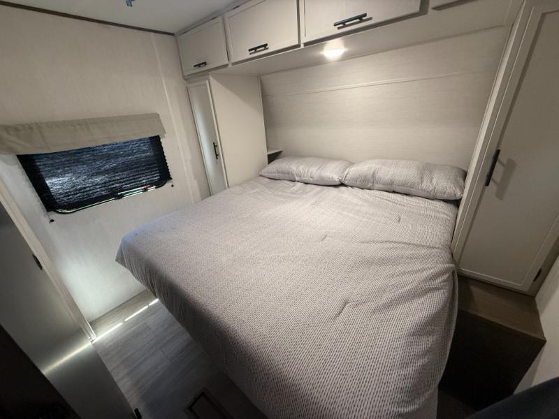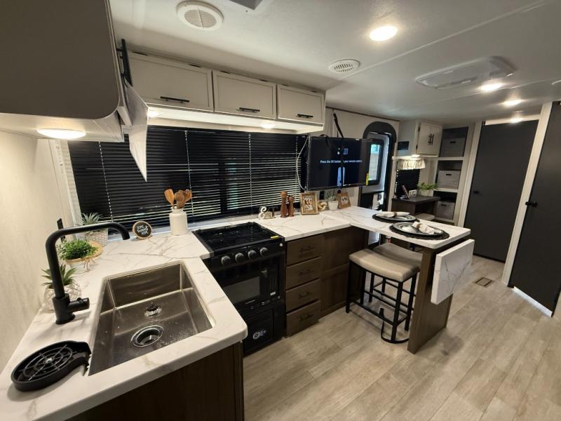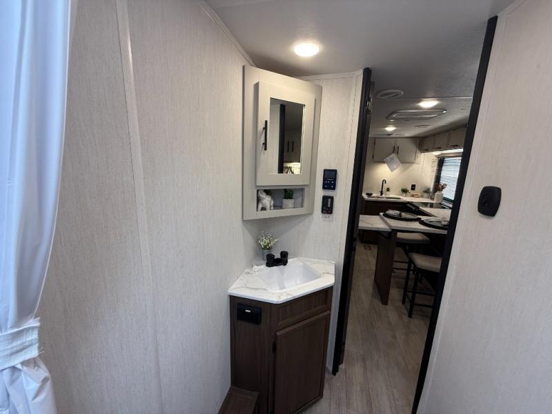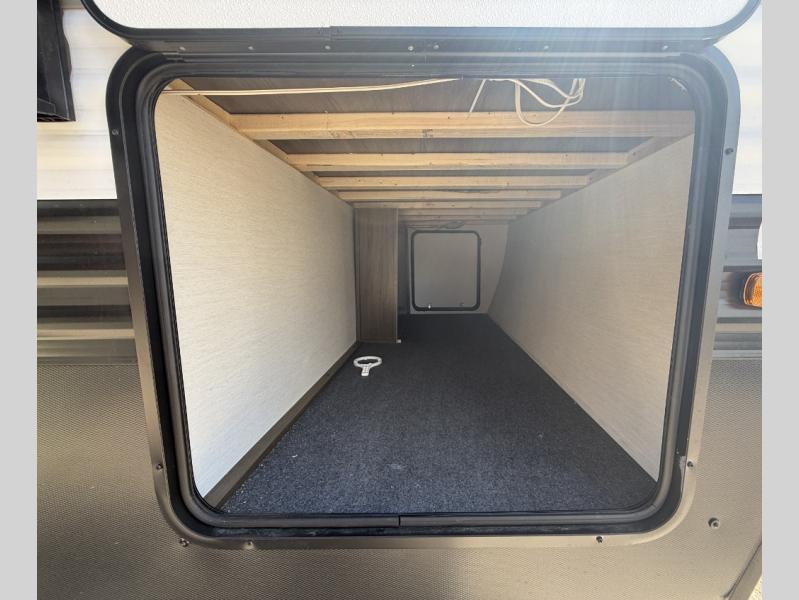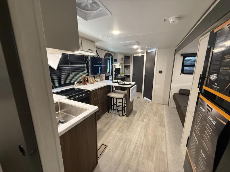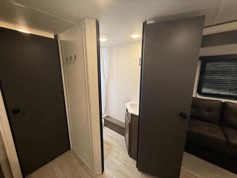 Head to your local state park in this spacious travel trailer! Once you arrive at the campground, you can grab a cold drink from the exterior refrigerator, then head inside to make lunch. An L-shaped counter with two chairs provides a place to enjoy your morning coffee at, or you may find yourselves on the theater seat within the large slide out. The French door refrigerator and pantry is also found here and can hold all your food for the week. You'll feel right at home in the front private bedroom that includes a queen bed, dual wardrobes, and an overhead cabinet for even more storage. This model also includes washer and dryer prep if you choose to add those appliances!