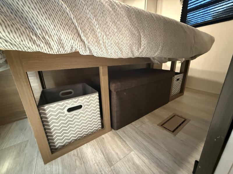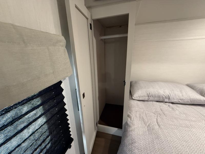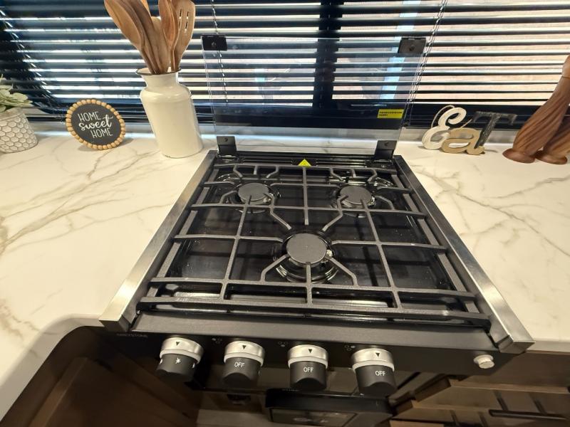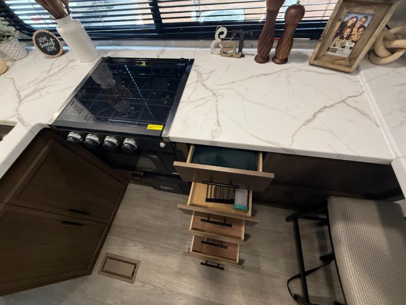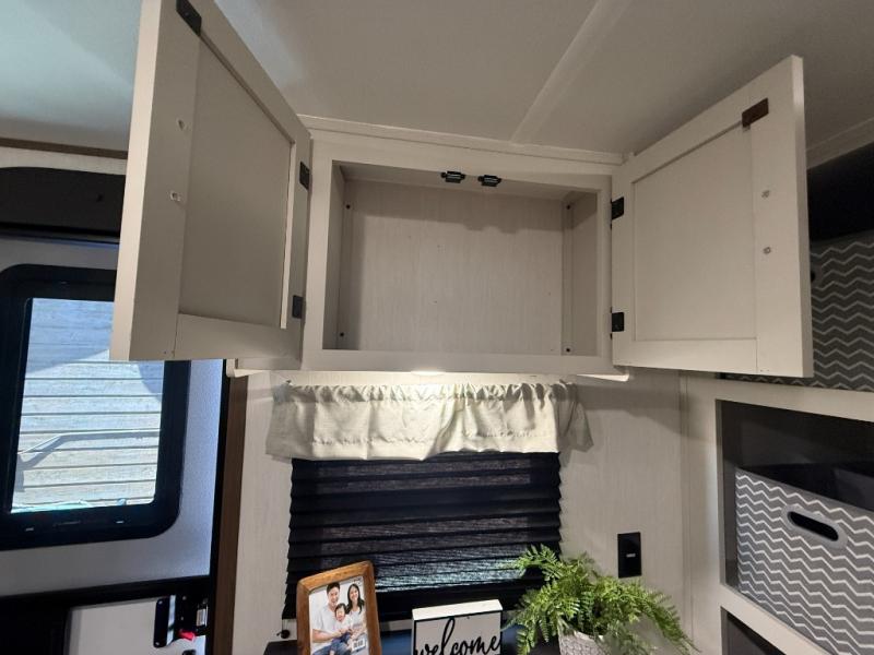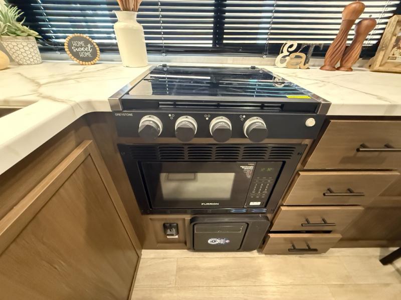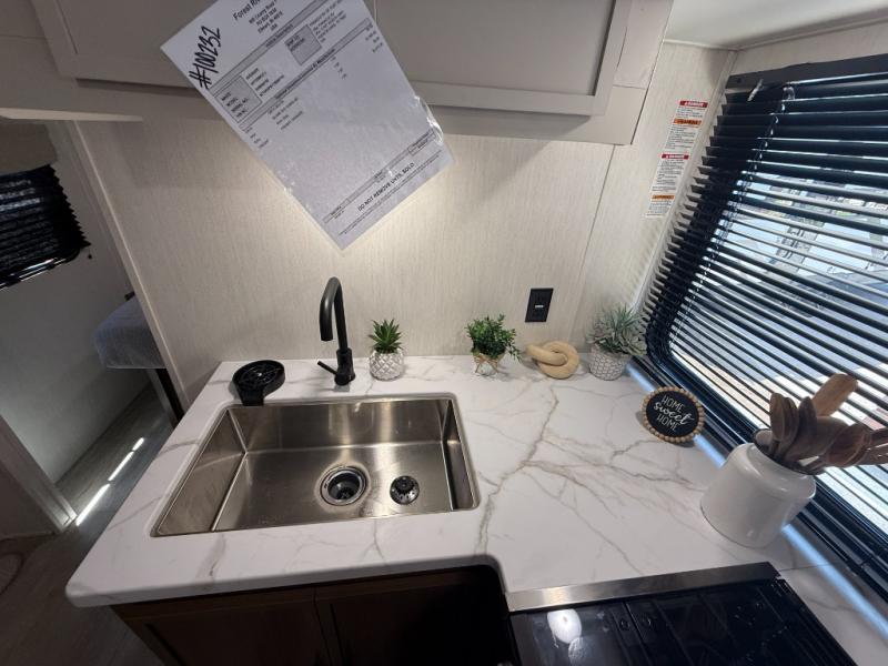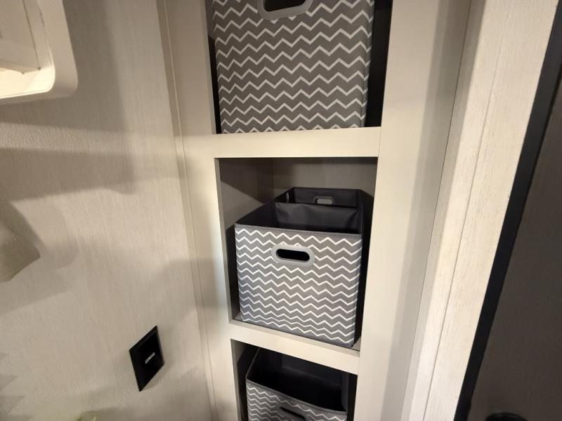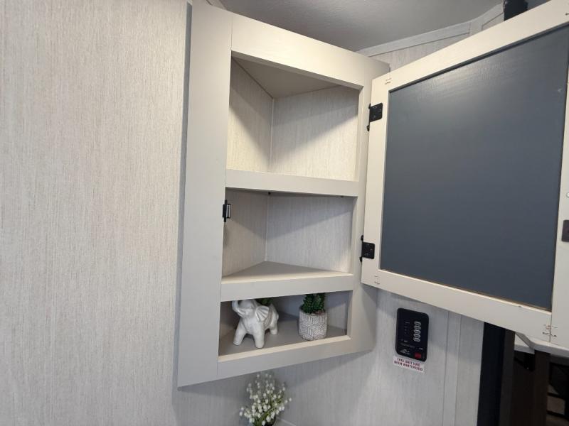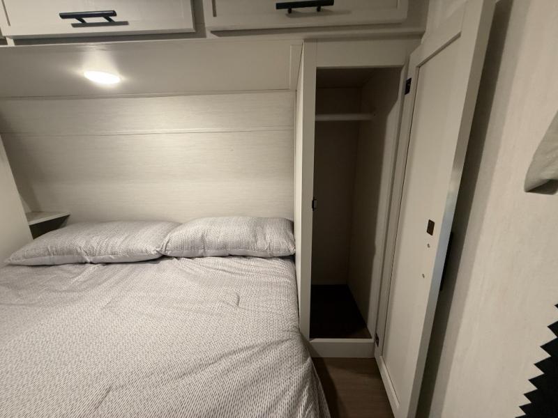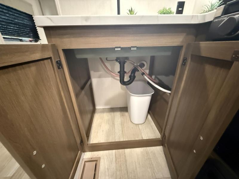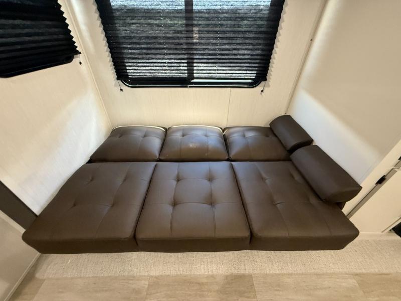 Head to your local state park in this spacious travel trailer! Once you arrive at the campground, you can grab a cold drink from the exterior refrigerator, then head inside to make lunch. An L-shaped counter with two chairs provides a place to enjoy your morning coffee at, or you may find yourselves on the theater seat within the large slide out. The French door refrigerator and pantry is also found here and can hold all your food for the week. You'll feel right at home in the front private bedroom that includes a queen bed, dual wardrobes, and an overhead cabinet for even more storage. This model also includes washer and dryer prep if you choose to add those appliances!