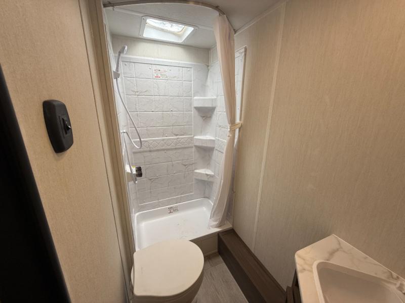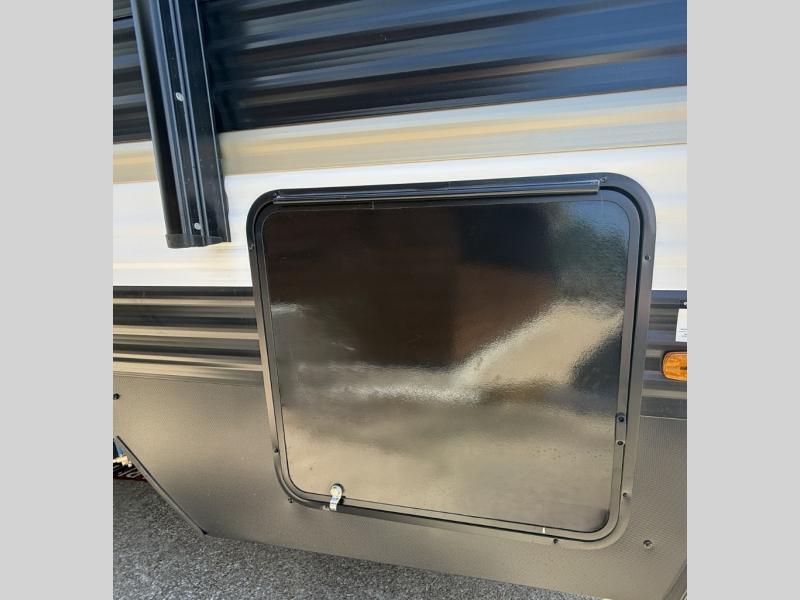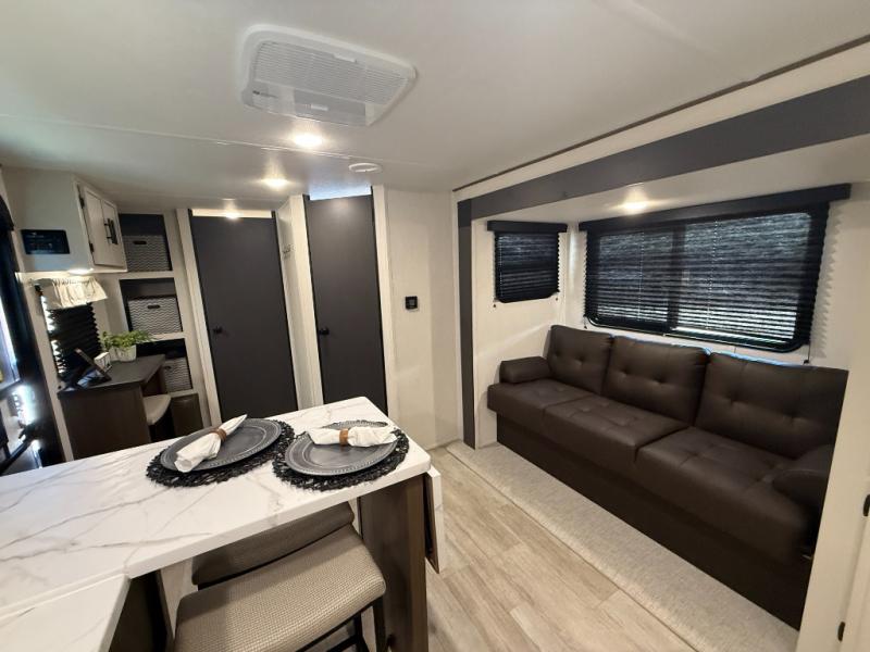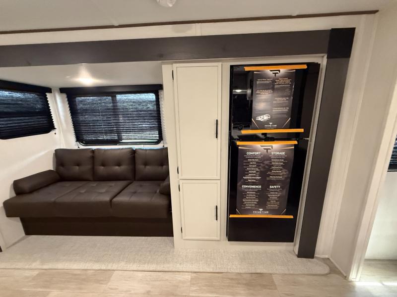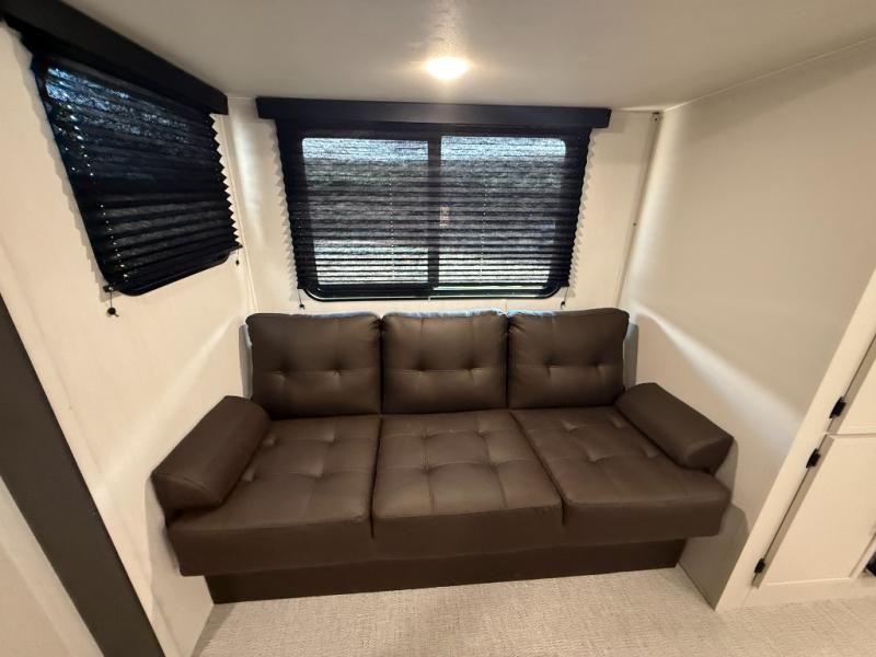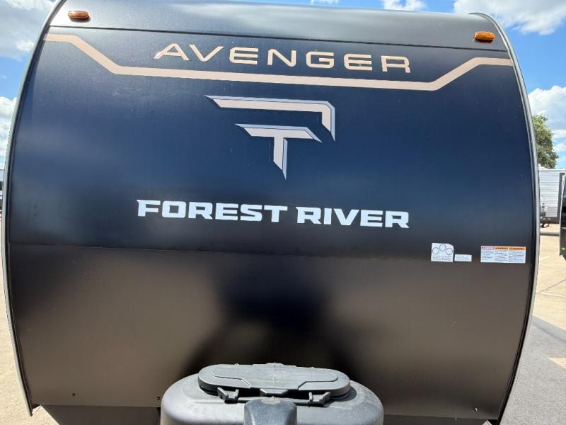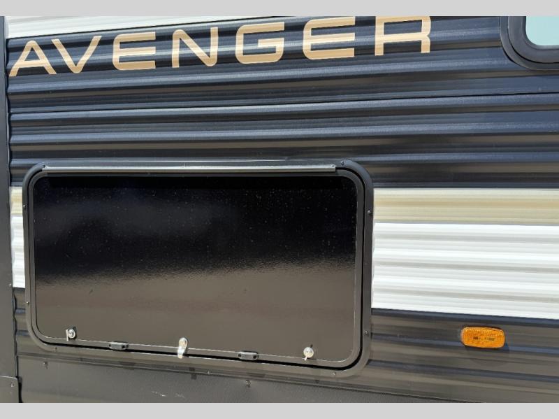 With any Avenger travel trailer by Prime Time, the exterior includes an aerodynamic smooth front metal, a diamond plate front rock guard for protection on the road, and four stabilizer jacks to keep your unit secure. There is a fully walkable roof plus an enclosed and heated underbelly that will help extend your camping season. The interior offers a 15,000 BTU air conditioner for the perfect climate inside, in-floor ducted heat, a systems monitor panel, and a Winegard 360+ antenna with Wi-Fi prep that will give you the option to stay connected as you camp. Each model also includes seamless Carefree Congoleum flooring, kitchen backsplash, shower pans in all models, and pleated nightshades throughout to name a few interior comforts!