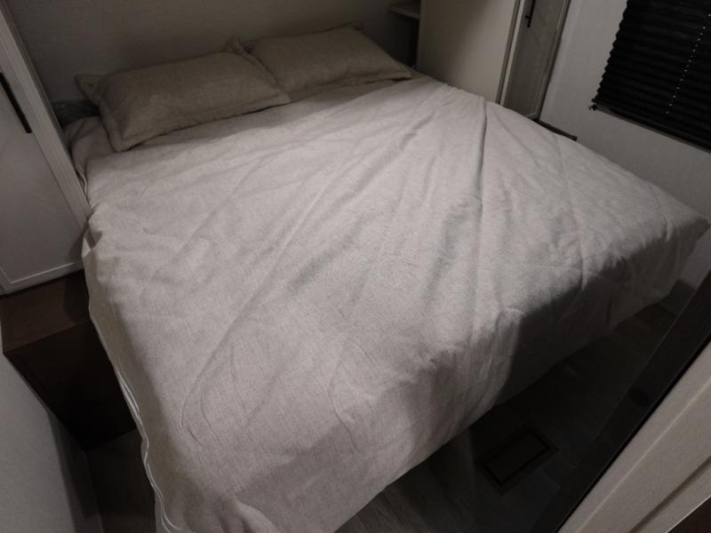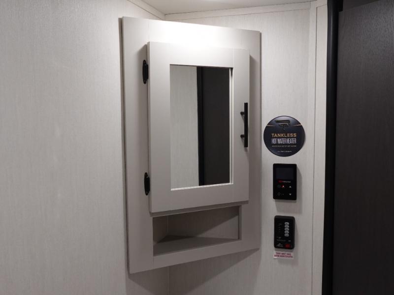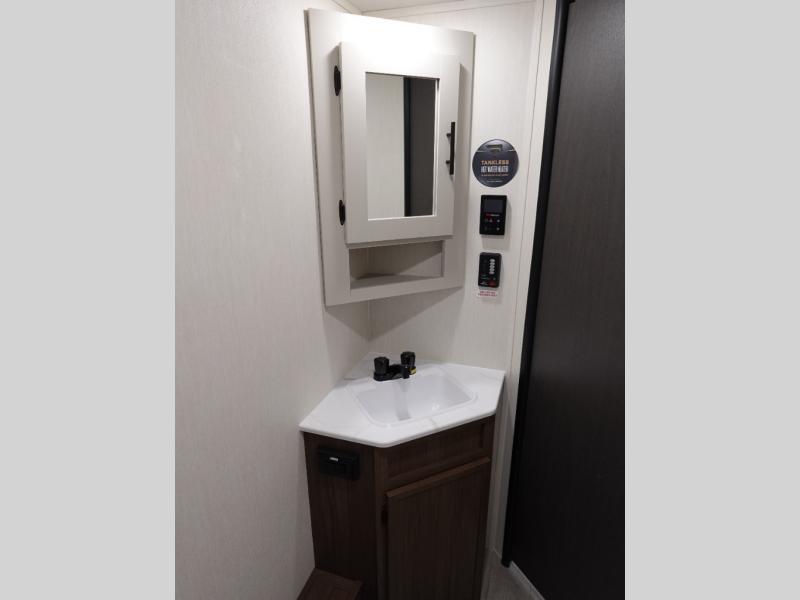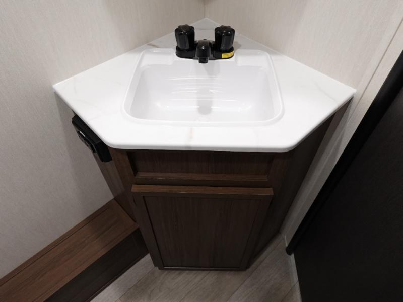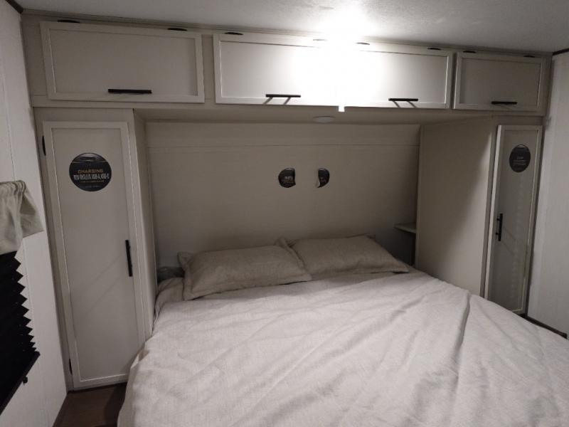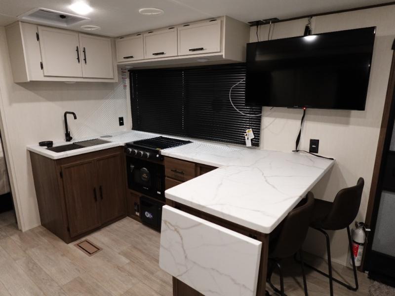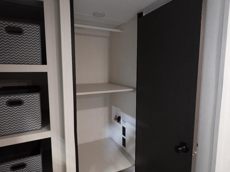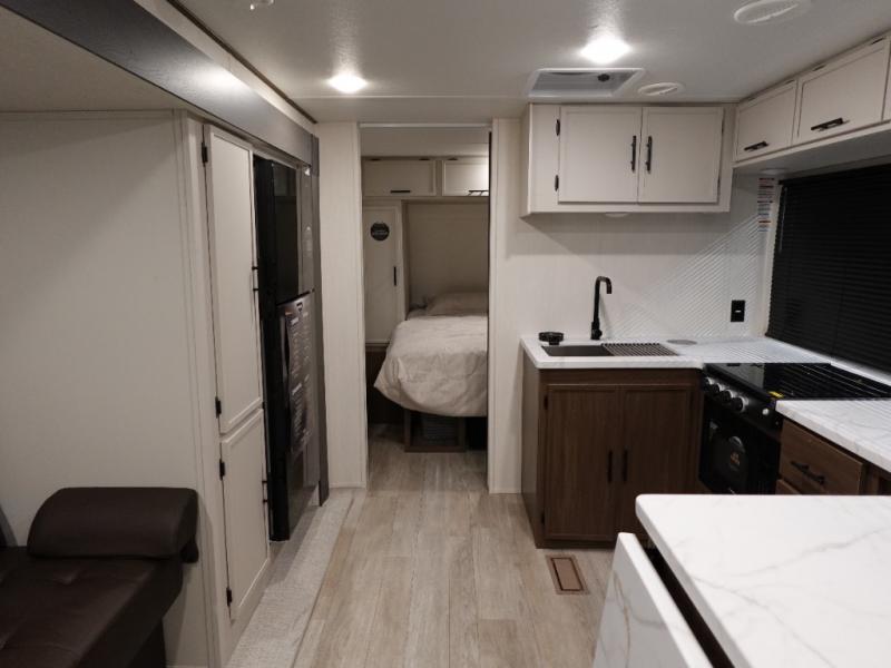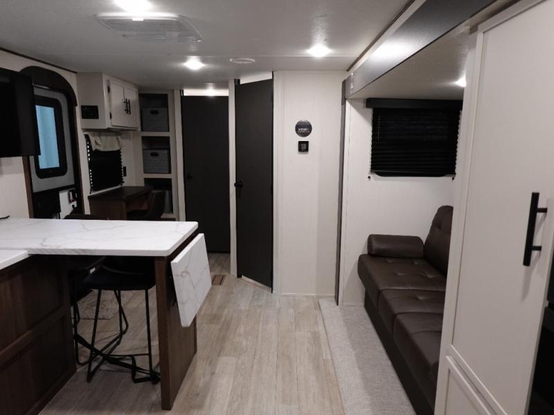 Head to your local state park in this spacious travel trailer! Once you arrive at the campground, you can grab a cold drink from the exterior refrigerator, then head inside to make lunch. An L-shaped counter with two stools provides a place to enjoy your morning coffee at, or you may find yourselves on the sofa within the slide out. The pantry and 12V refrigerator is also found here and can hold all your food for the week. You'll feel right at home in the front private bedroom that includes a camp king bed, dual wardrobes, and an overhead cabinet for even more storage. This model also includes washer and dryer prep if you choose to add those appliances!