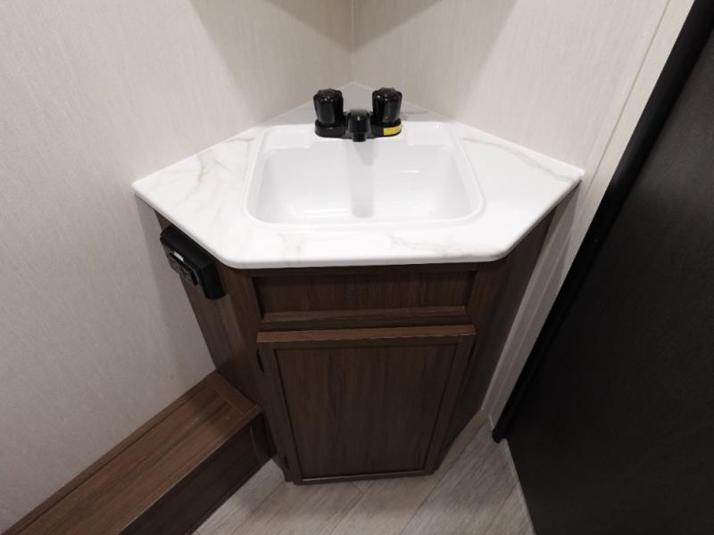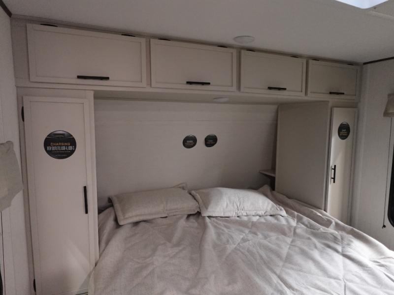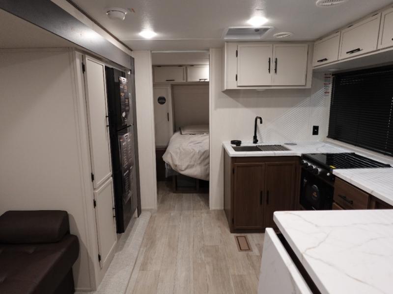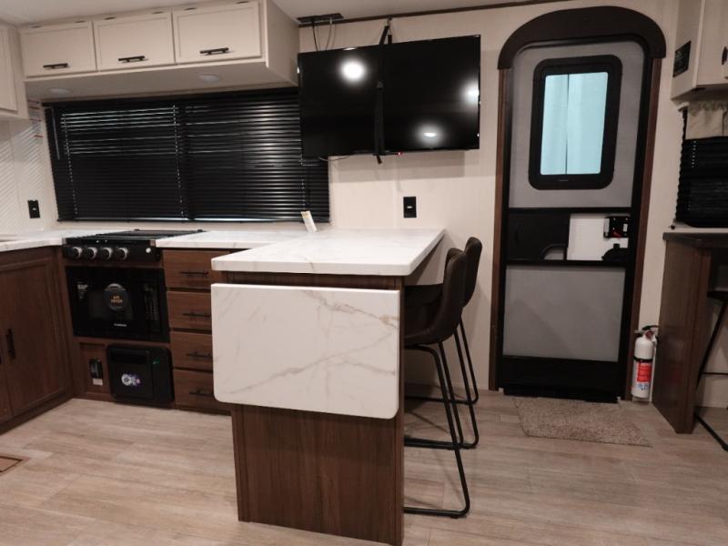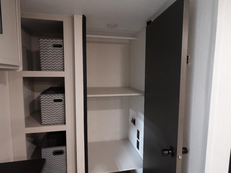 Head to your local state park in this spacious travel trailer! Once you arrive at the campground, you can grab a cold drink from the exterior refrigerator, then head inside to make lunch. An L-shaped counter with two stools provides a place to enjoy your morning coffee at, or you may find yourselves on the sofa within the slide out. The pantry and 12V refrigerator is also found here and can hold all your food for the week. You'll feel right at home in the front private bedroom that includes a camp king bed, dual wardrobes, and an overhead cabinet for even more storage.