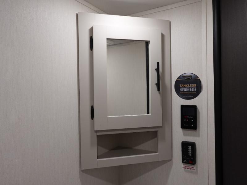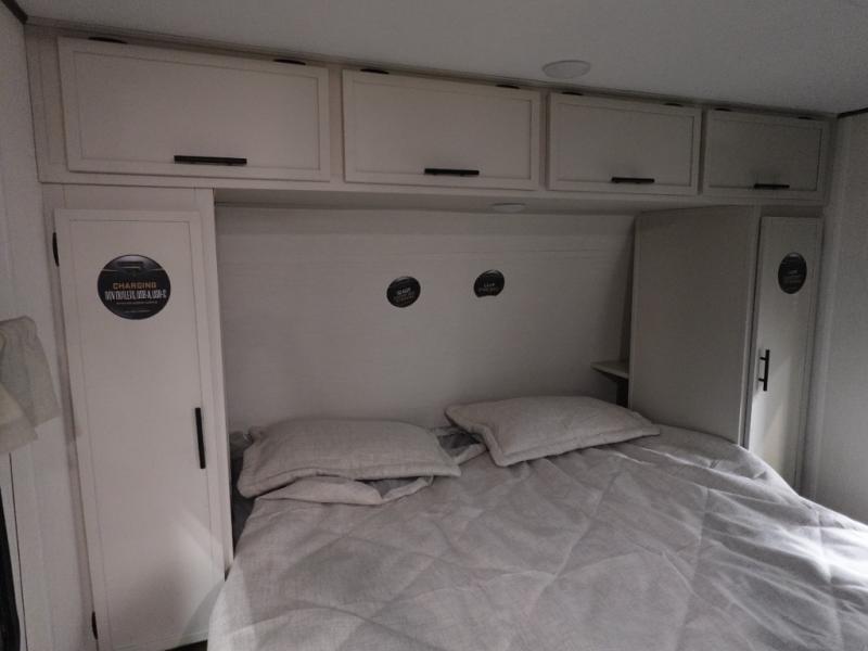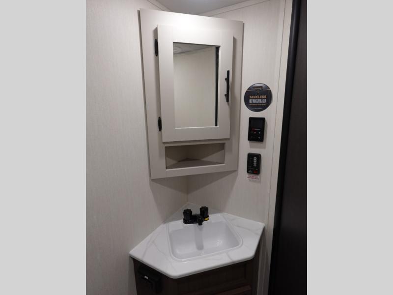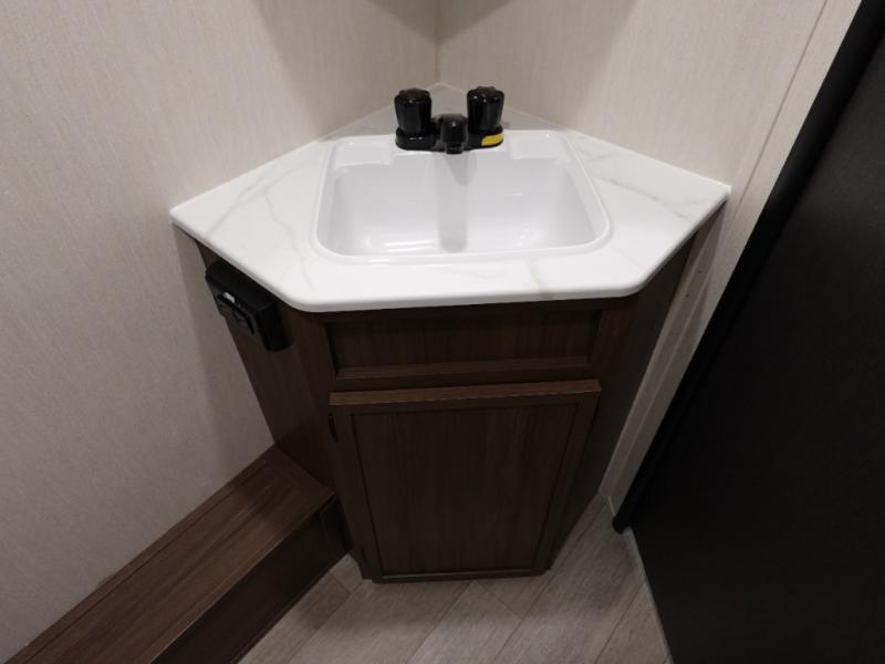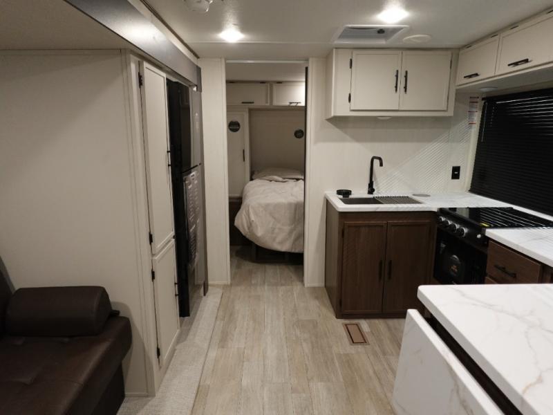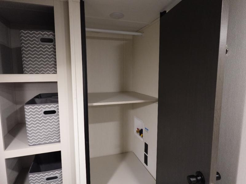 Head to your local state park in this spacious travel trailer! Once you arrive at the campground, you can grab a cold drink from the exterior refrigerator, then head inside to make lunch. An L-shaped counter with two stools provides a place to enjoy your morning coffee at, or you may find yourselves on the sofa within the slide out. The pantry and 12V refrigerator is also found here and can hold all your food for the week. You'll feel right at home in the front private bedroom that includes a camp king bed, dual wardrobes, and an overhead cabinet for even more storage. This model also includes washer and dryer prep if you choose to add those appliances!