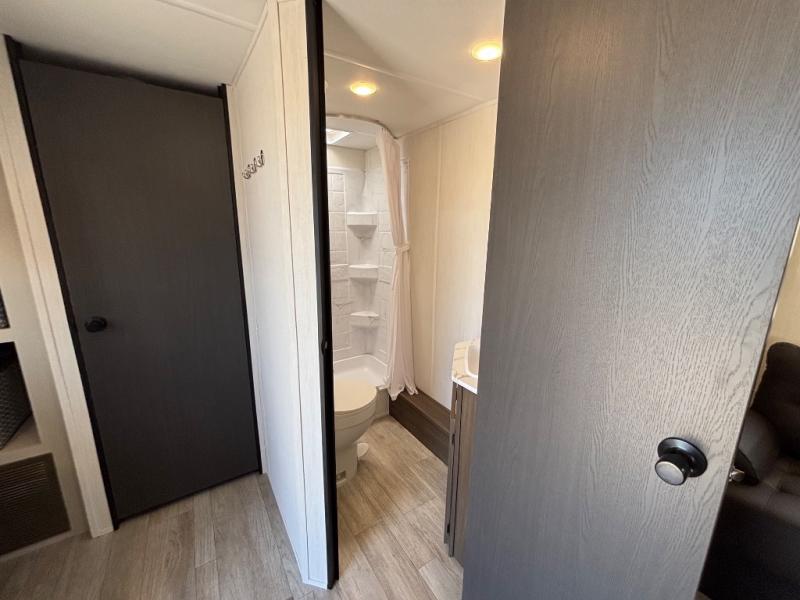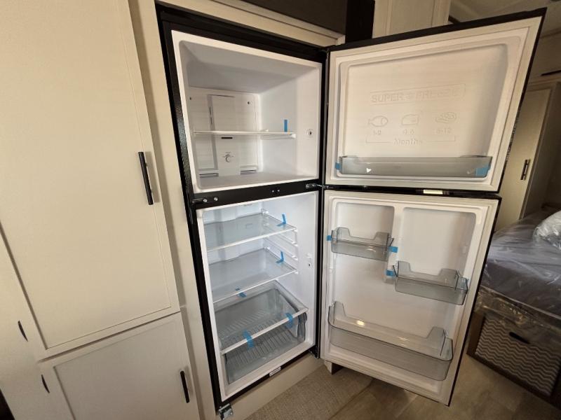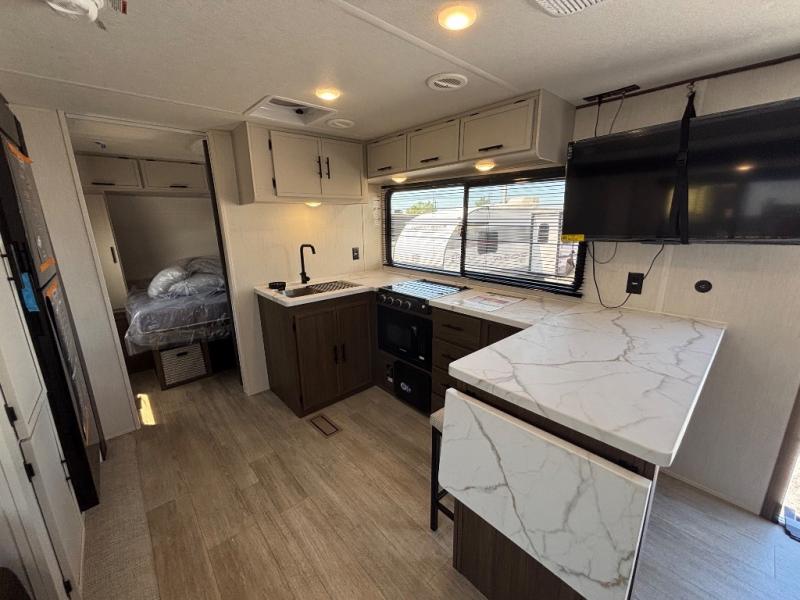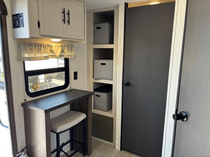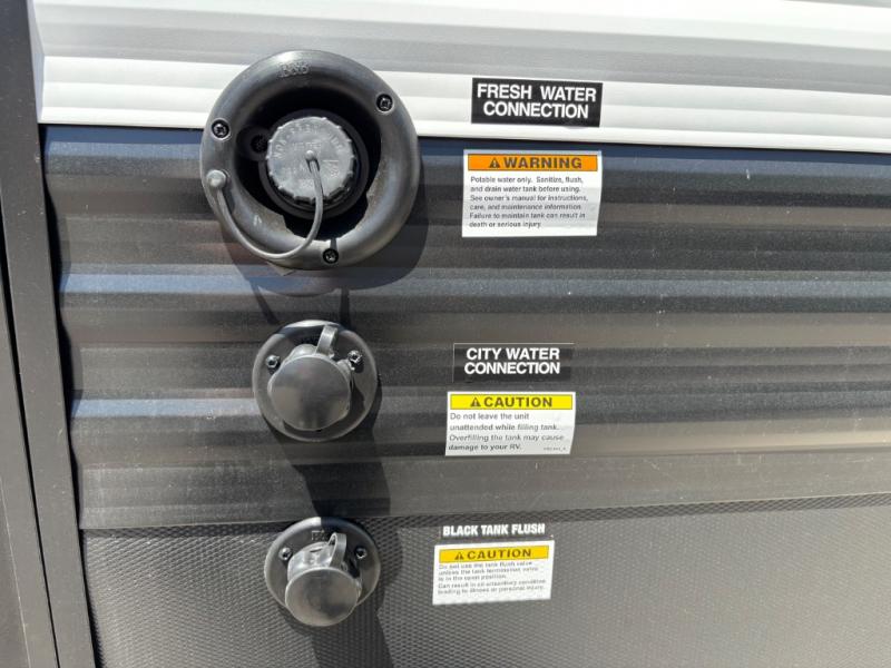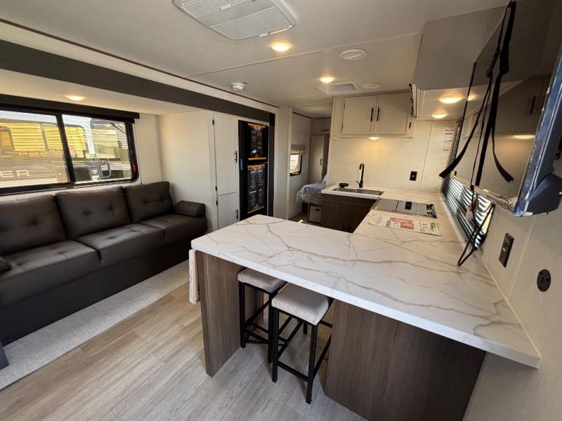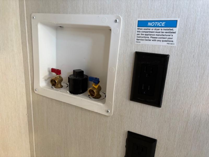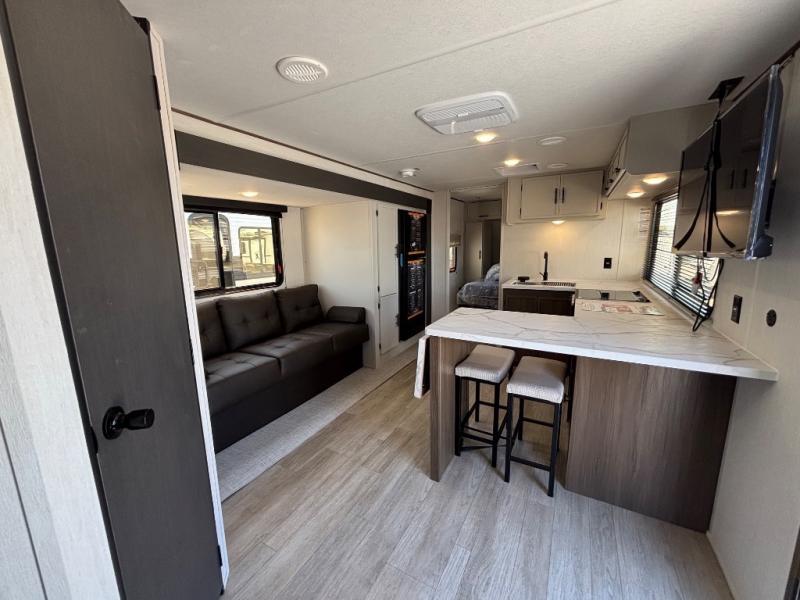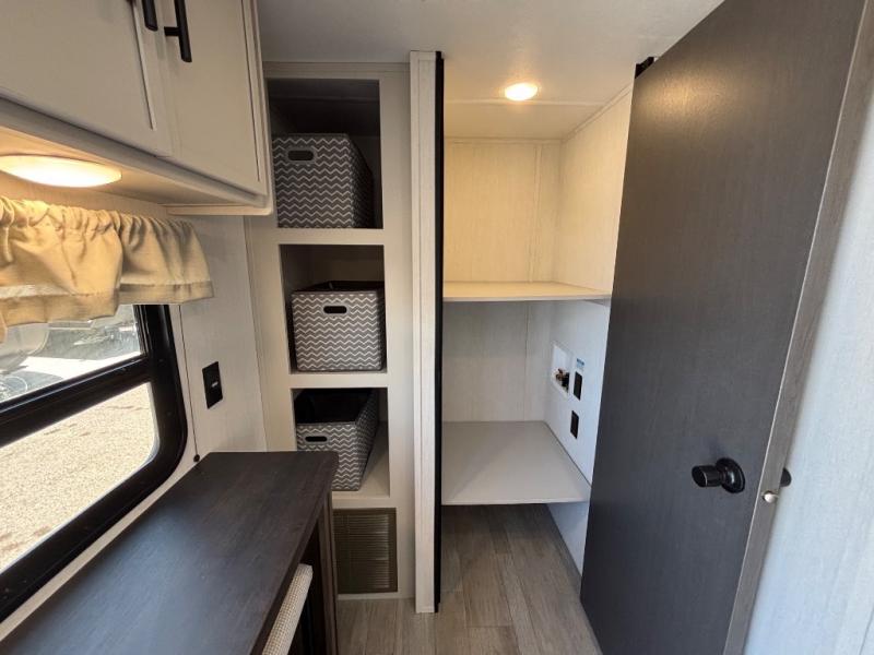 Head to your local state park in this spacious travel trailer! Once you arrive at the campground, you can grab a cold drink from the exterior refrigerator, then head inside to make lunch. An L-shaped counter with two chairs provides a place to enjoy your morning coffee at, or you may find yourselves on the theater seat within the large slide out. The French door refrigerator and pantry is also found here and can hold all your food for the week. You'll feel right at home in the front private bedroom that includes a queen bed, dual wardrobes, and an overhead cabinet for even more storage. This model also includes washer and dryer prep if you choose to add those appliances!