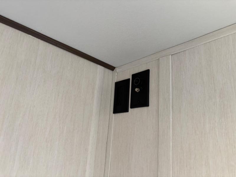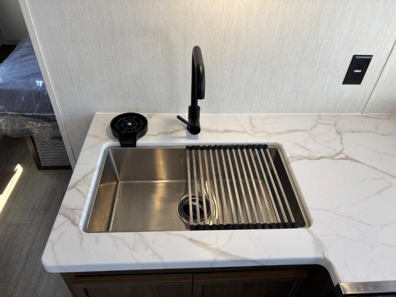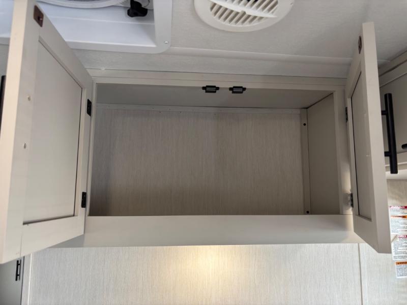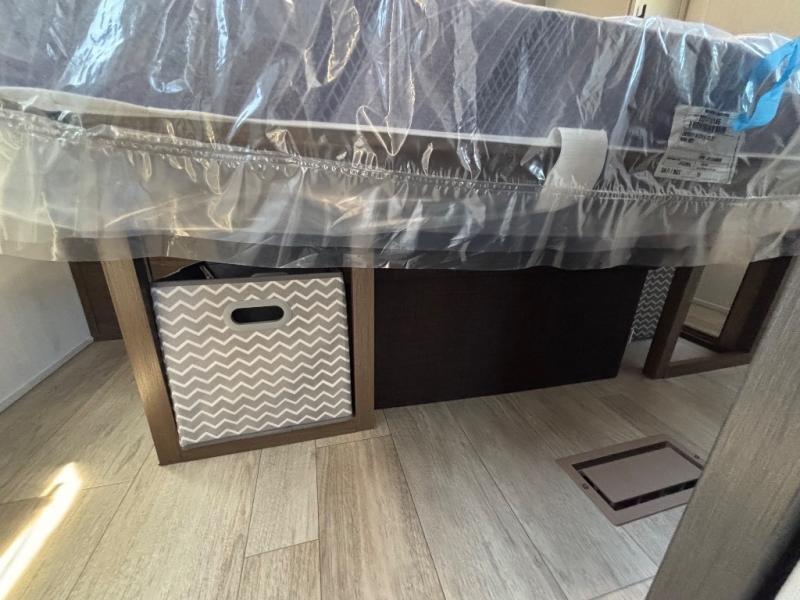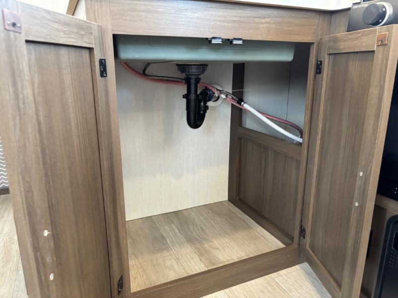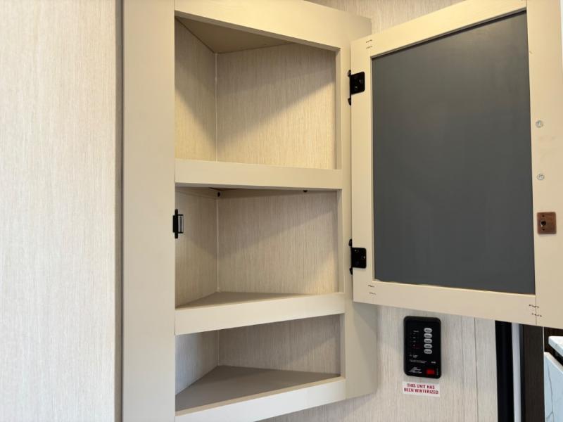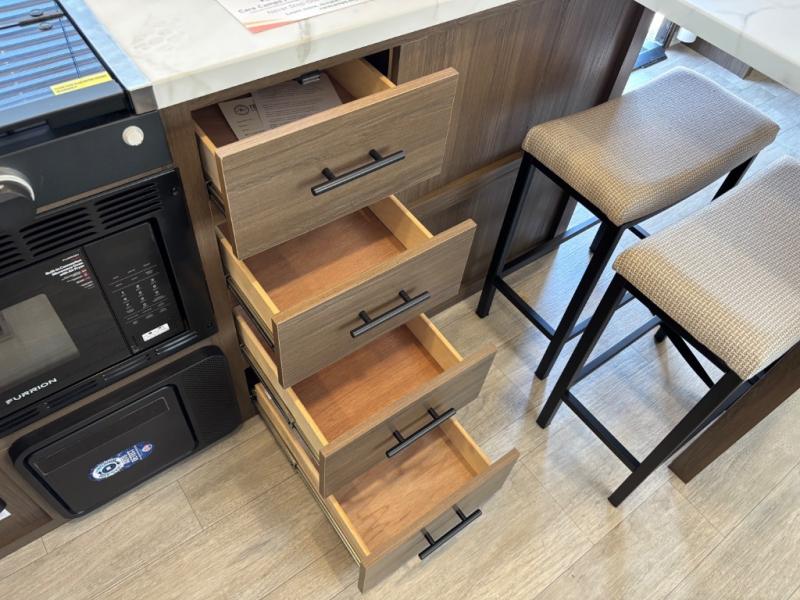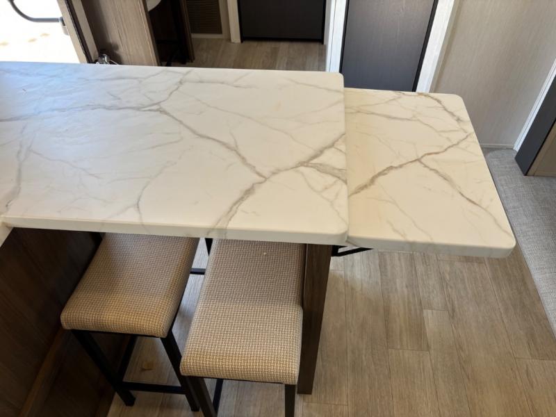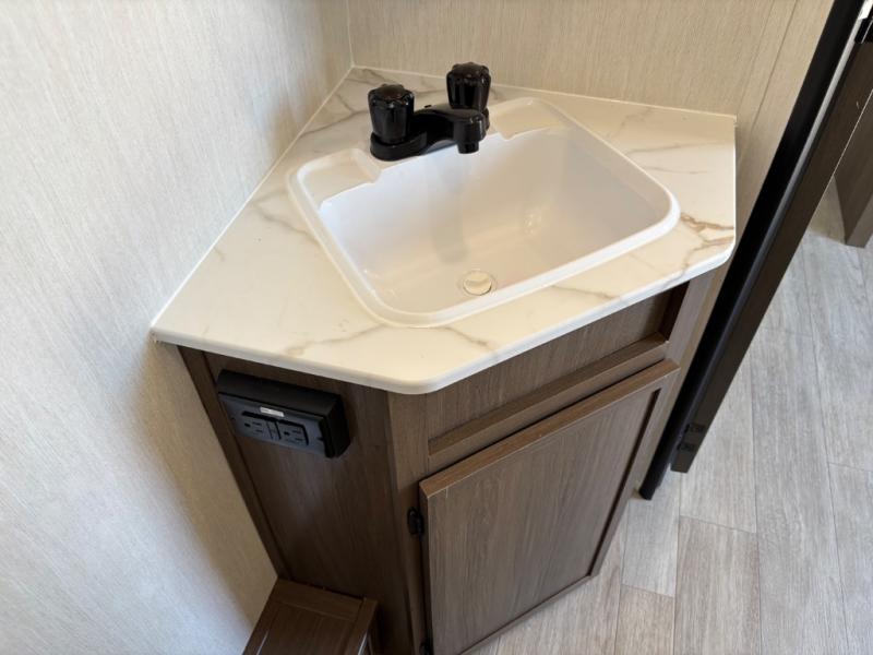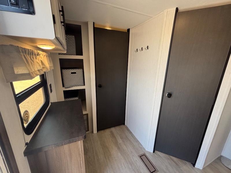 Head to your local state park in this spacious travel trailer! Once you arrive at the campground, you can grab a cold drink from the exterior refrigerator, then head inside to make lunch. An L-shaped counter with two chairs provides a place to enjoy your morning coffee at, or you may find yourselves on the theater seat within the large slide out. The French door refrigerator and pantry is also found here and can hold all your food for the week. You'll feel right at home in the front private bedroom that includes a queen bed, dual wardrobes, and an overhead cabinet for even more storage. This model also includes washer and dryer prep if you choose to add those appliances!