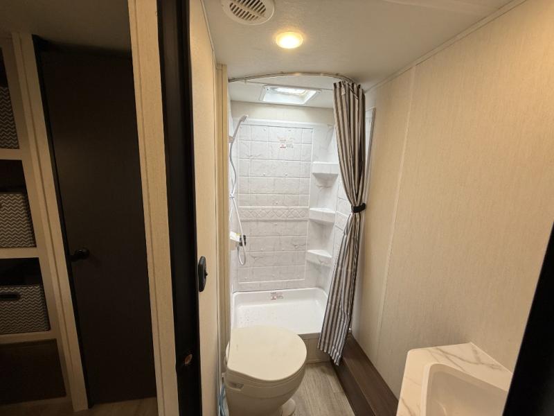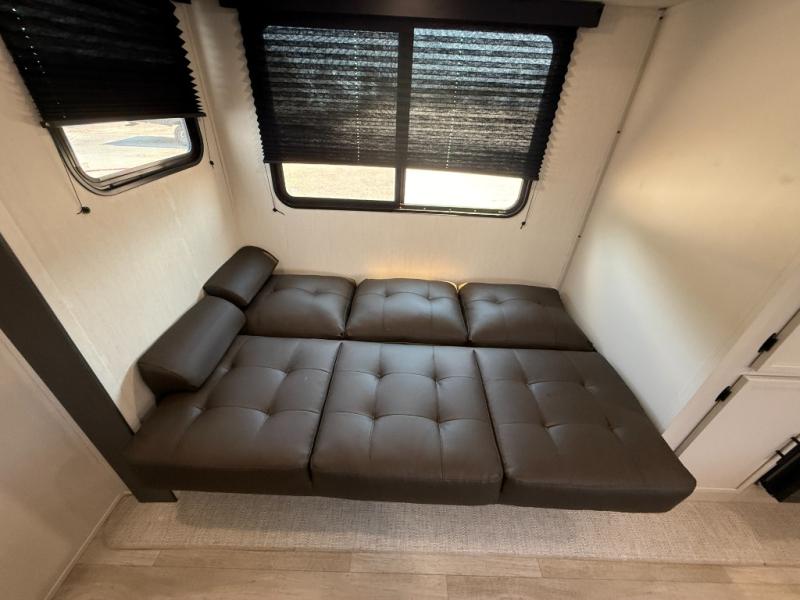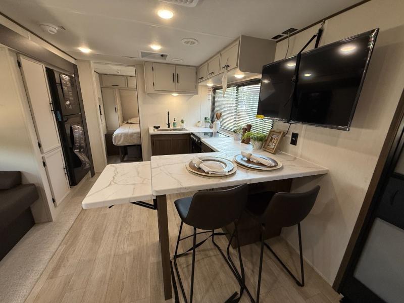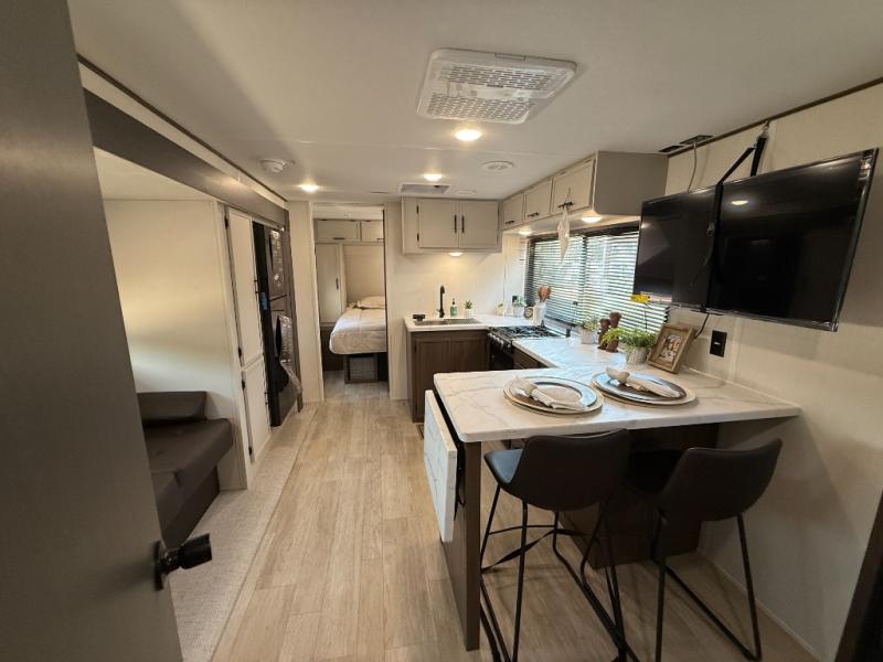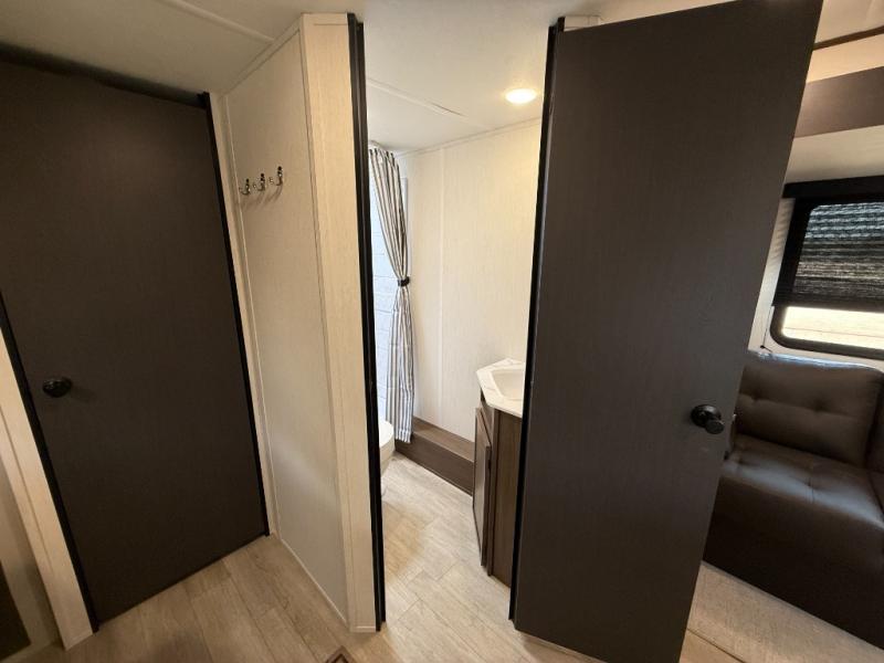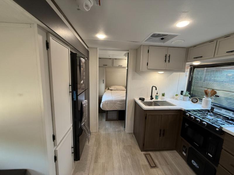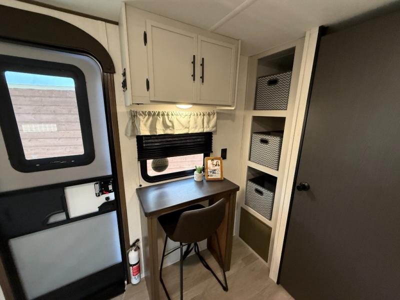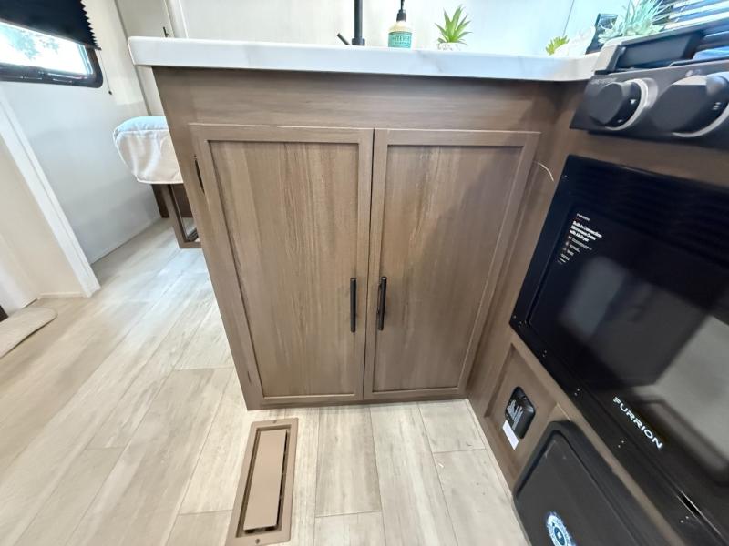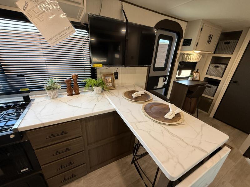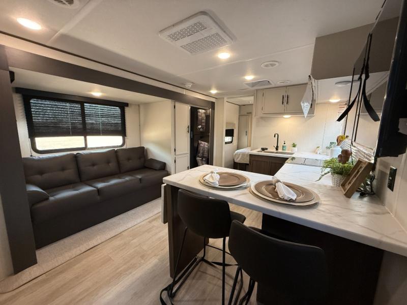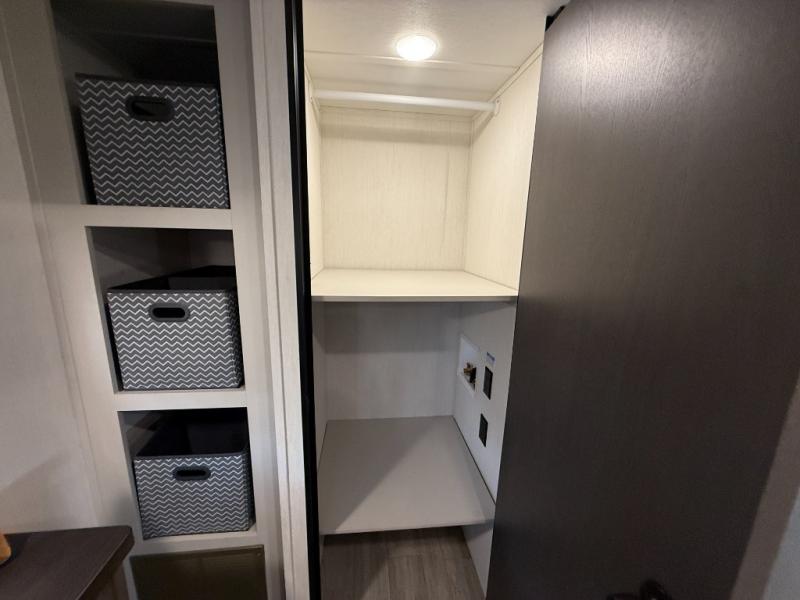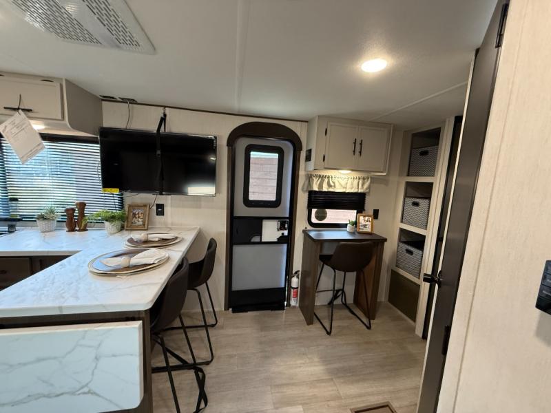 Head to your local state park in this spacious travel trailer! Once you arrive at the campground, you can grab a cold drink from the exterior refrigerator, then head inside to make lunch. An L-shaped counter with two chairs provides a place to enjoy your morning coffee at, or you may find yourselves on the theater seat within the large slide out. The French door refrigerator and pantry is also found here and can hold all your food for the week. You'll feel right at home in the front private bedroom that includes a queen bed, dual wardrobes, and an overhead cabinet for even more storage. This model also includes washer and dryer prep if you choose to add those appliances!