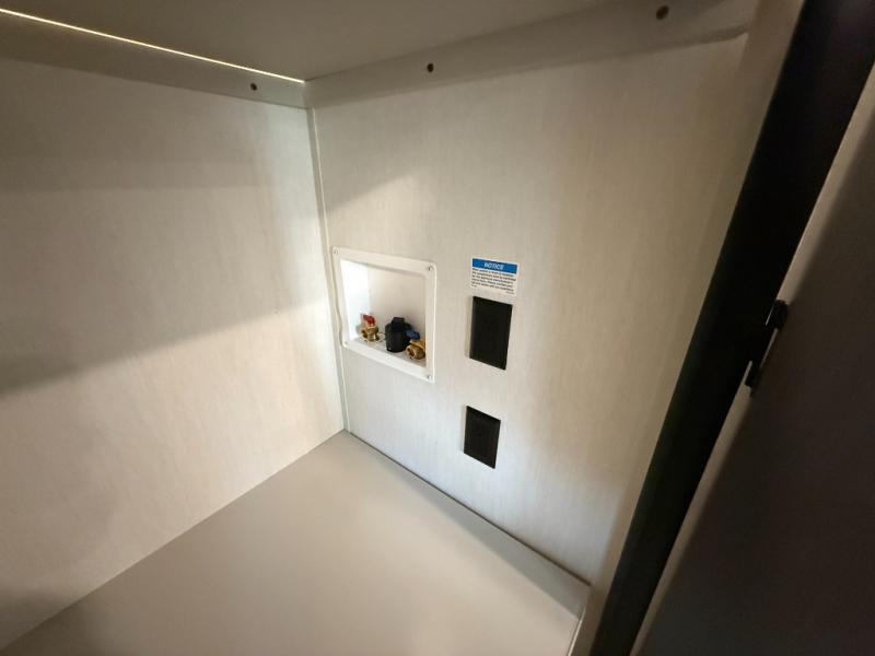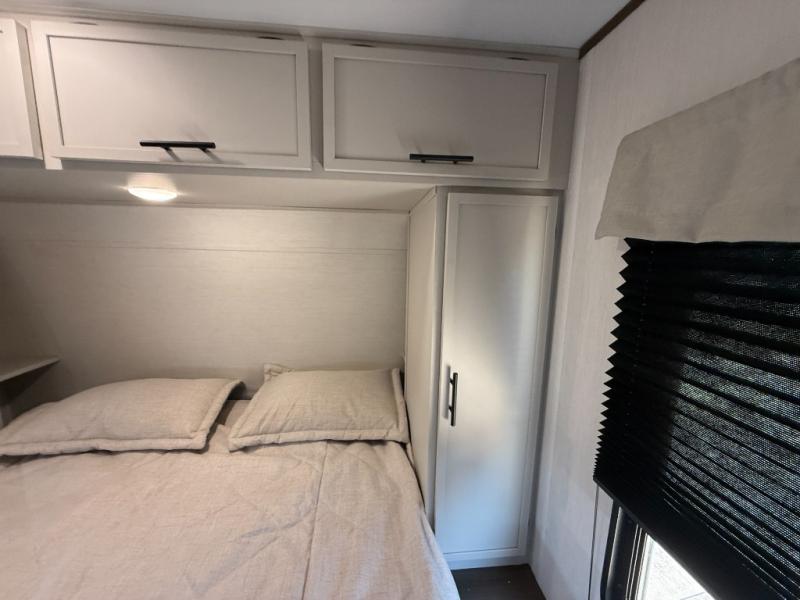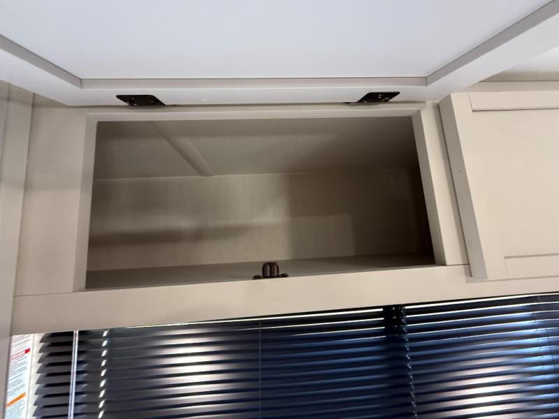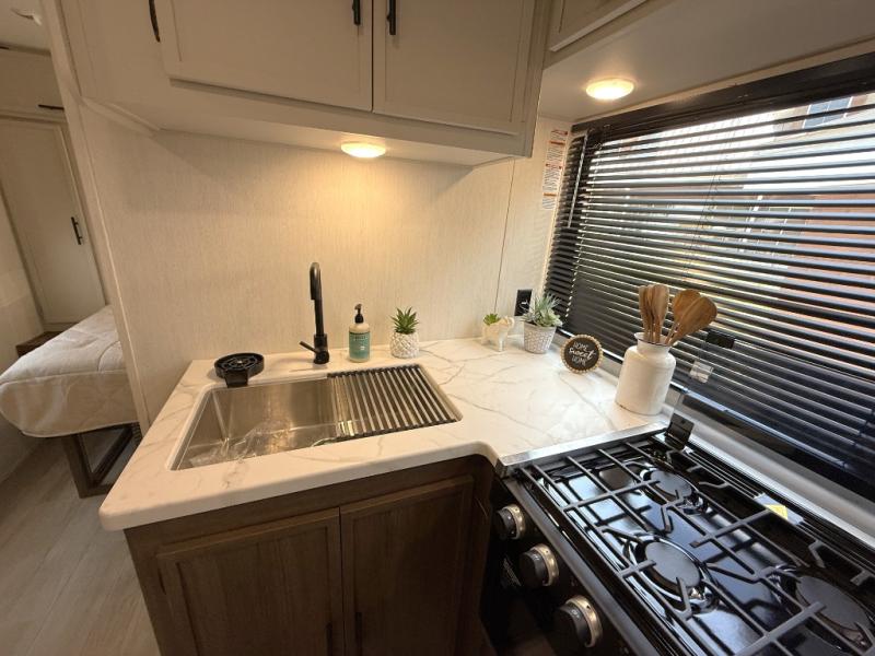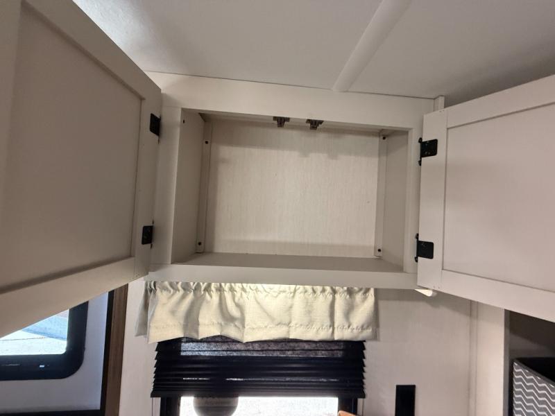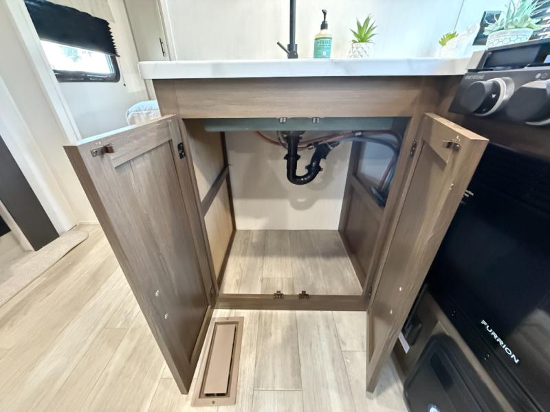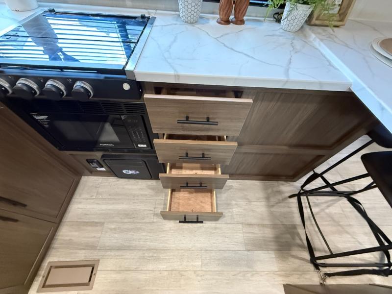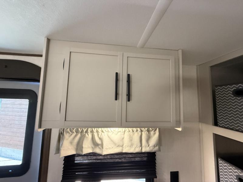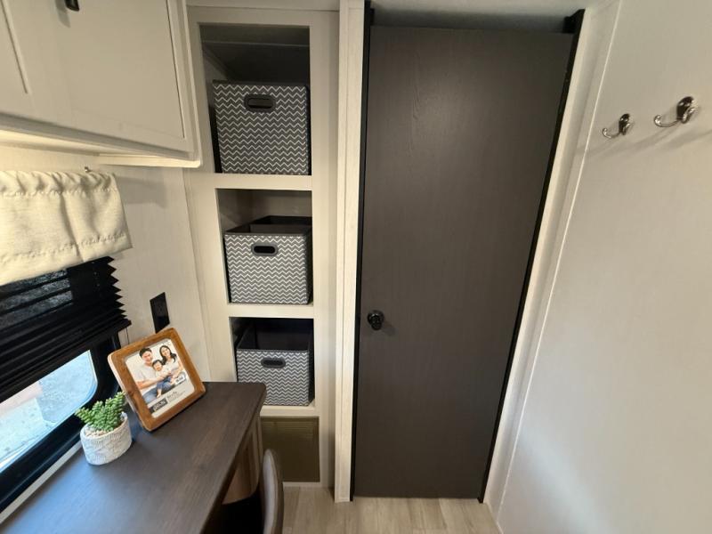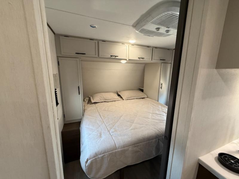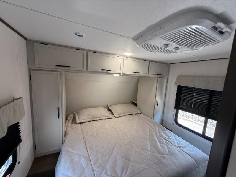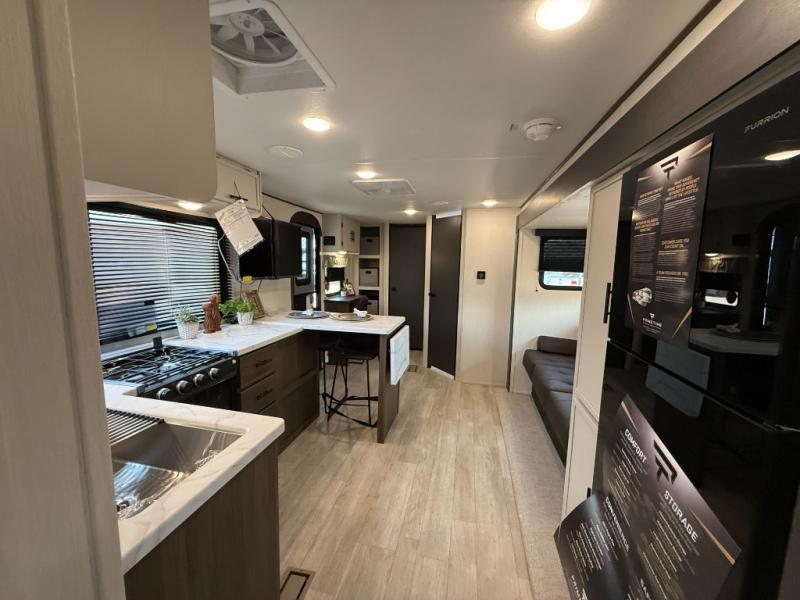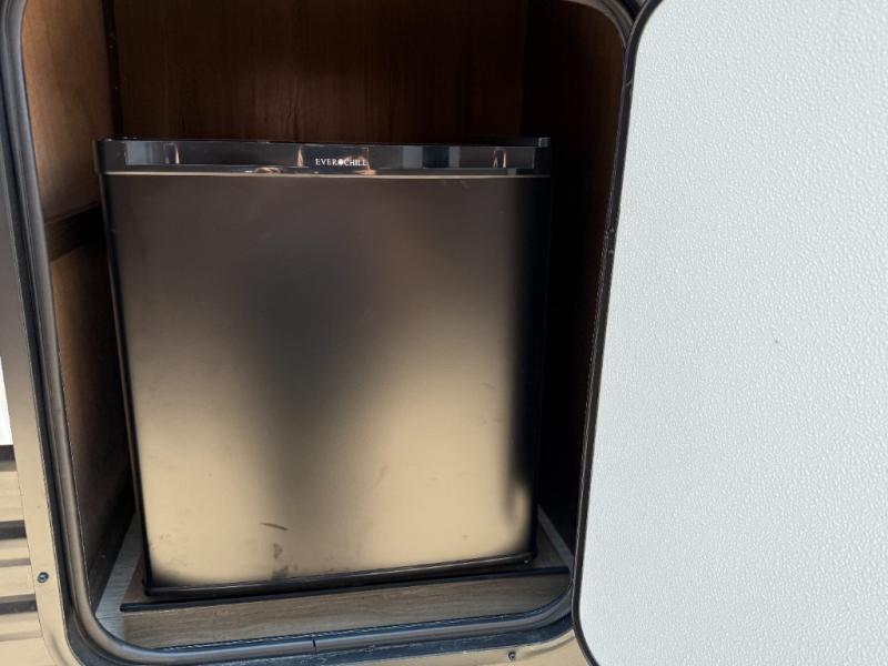 Head to your local state park in this spacious travel trailer! Once you arrive at the campground, you can grab a cold drink from the exterior refrigerator, then head inside to make lunch. An L-shaped counter with two chairs provides a place to enjoy your morning coffee at, or you may find yourselves on the theater seat within the large slide out. The French door refrigerator and pantry is also found here and can hold all your food for the week. You'll feel right at home in the front private bedroom that includes a queen bed, dual wardrobes, and an overhead cabinet for even more storage. This model also includes washer and dryer prep if you choose to add those appliances!
