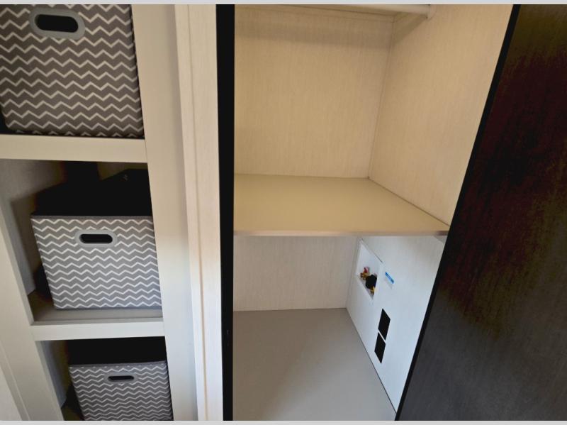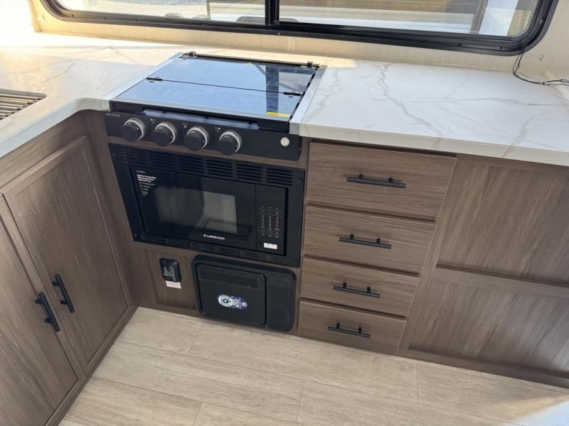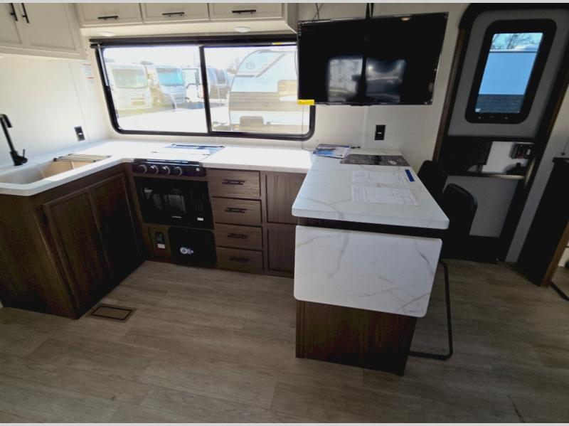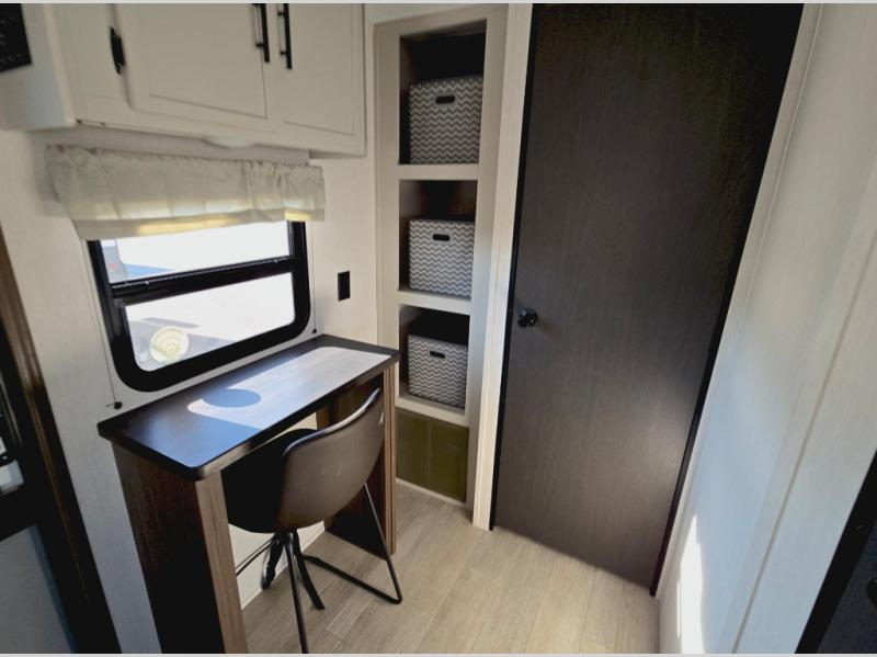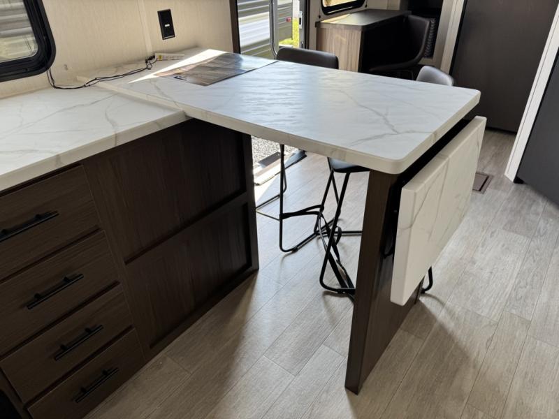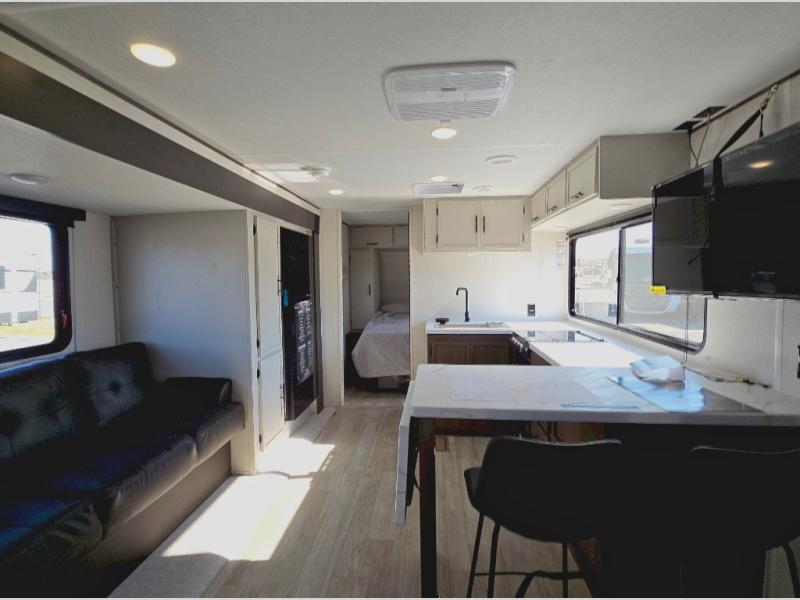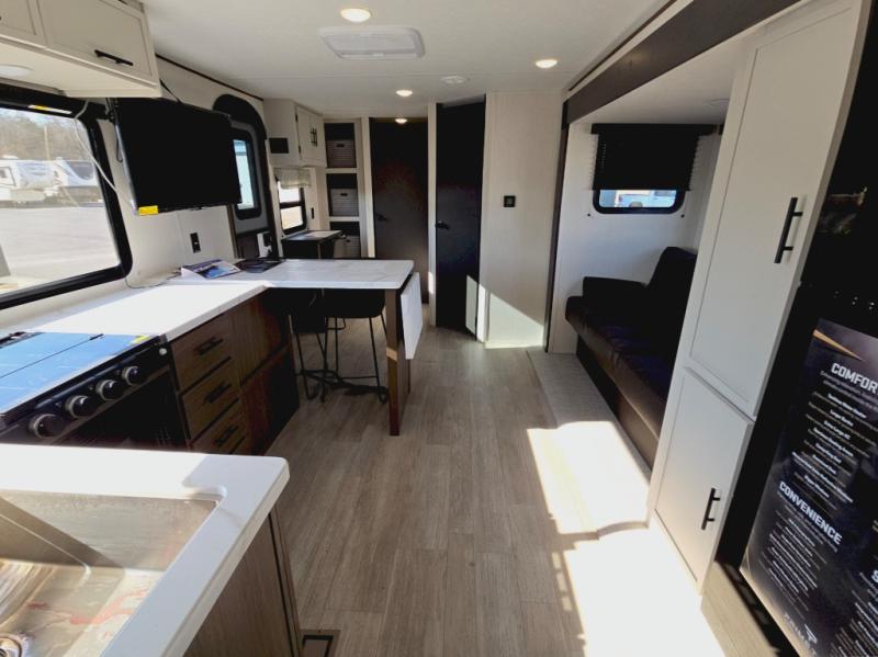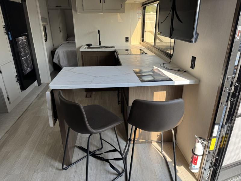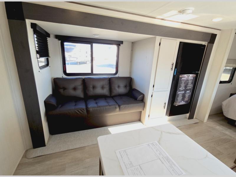 Head to your local state park in this spacious travel trailer! Once you arrive at the campground, you can grab a cold drink from the exterior refrigerator, then head inside to make lunch. An L-shaped counter with two stools provides a place to enjoy your morning coffee at, or you may find yourselves on the sofa within the slide out. The pantry and 12V refrigerator is also found here and can hold all your food for the week. You'll feel right at home in the front private bedroom that includes a camp king bed, dual wardrobes, and an overhead cabinet for even more storage. This model also includes washer and dryer prep if you choose to add those appliances!