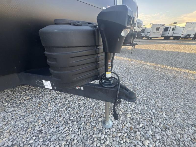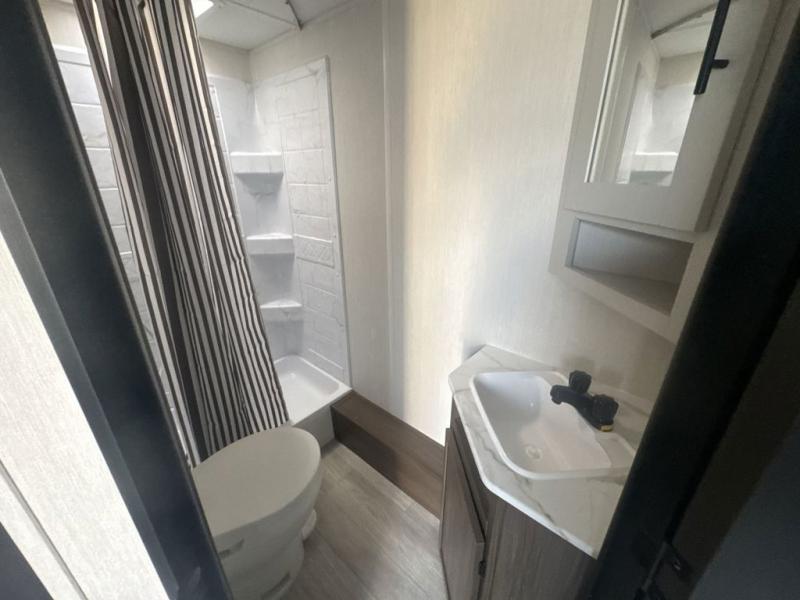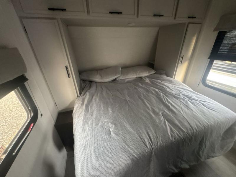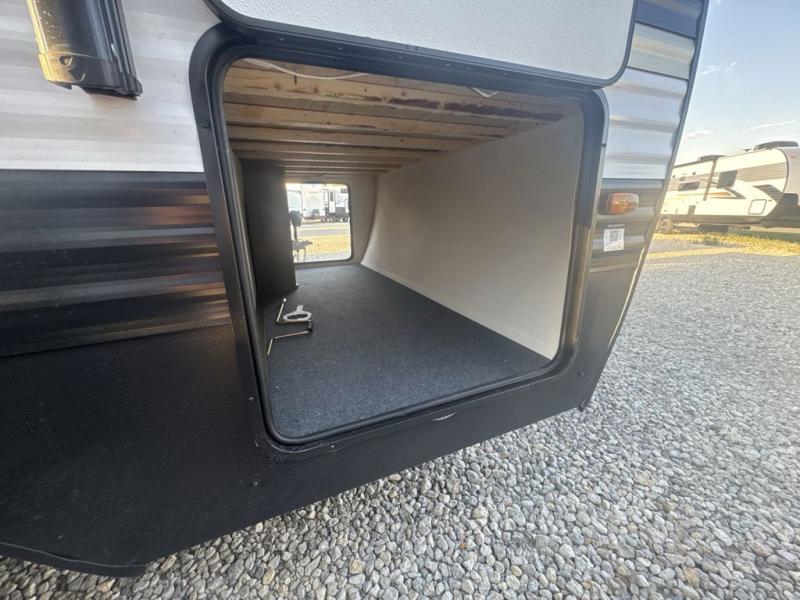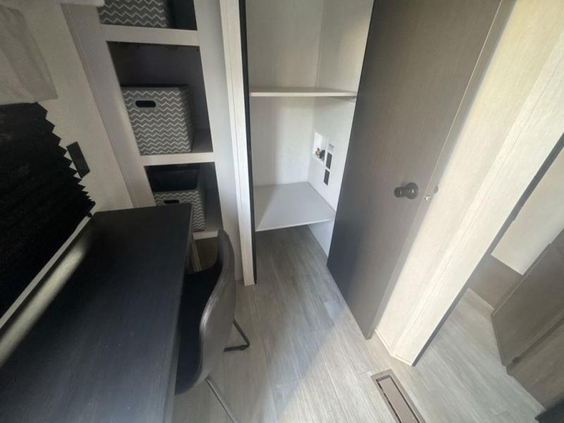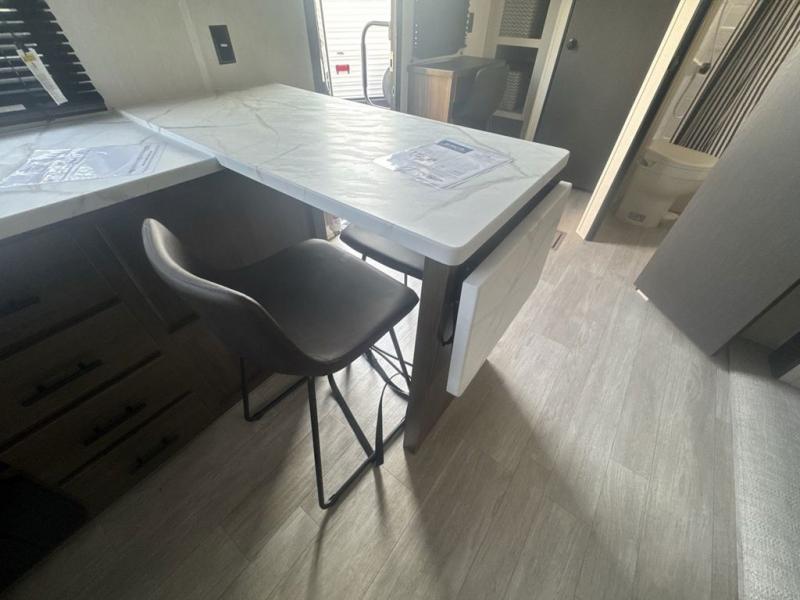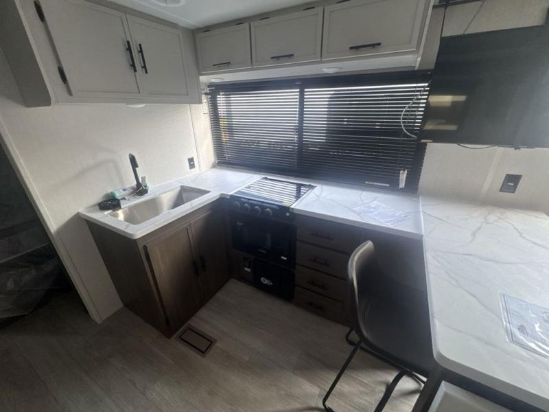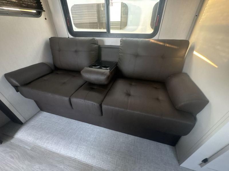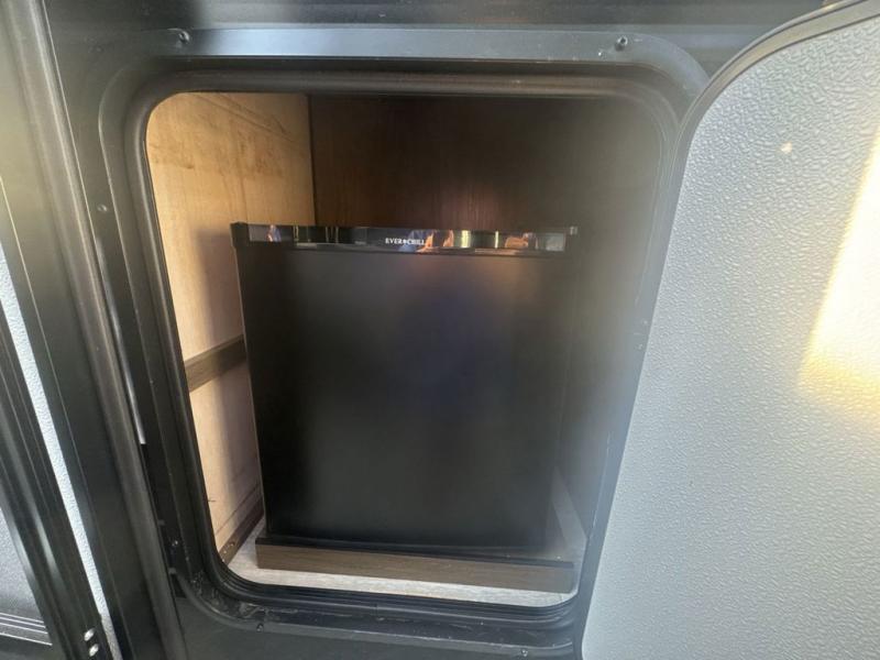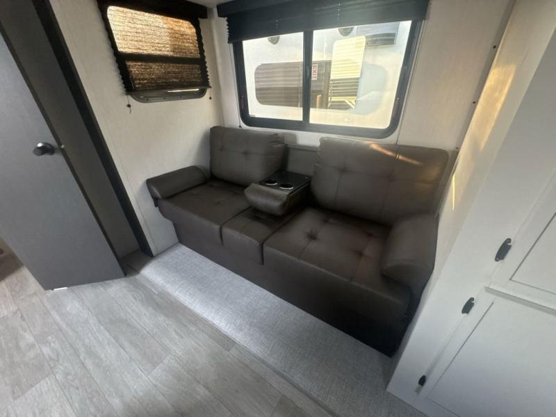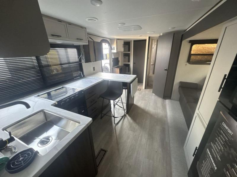 Head to your local state park in this spacious travel trailer! Once you arrive at the campground, you can grab a cold drink from the exterior refrigerator, then head inside to make lunch. An L-shaped counter with two stools provides a place to enjoy your morning coffee at, or you may find yourselves on the sofa within the slide out. The pantry and 12V refrigerator is also found here and can hold all your food for the week. You'll feel right at home in the front private bedroom that includes a camp king bed, dual wardrobes, and an overhead cabinet for even more storage. This model also includes washer and dryer prep if you choose to add those appliances!